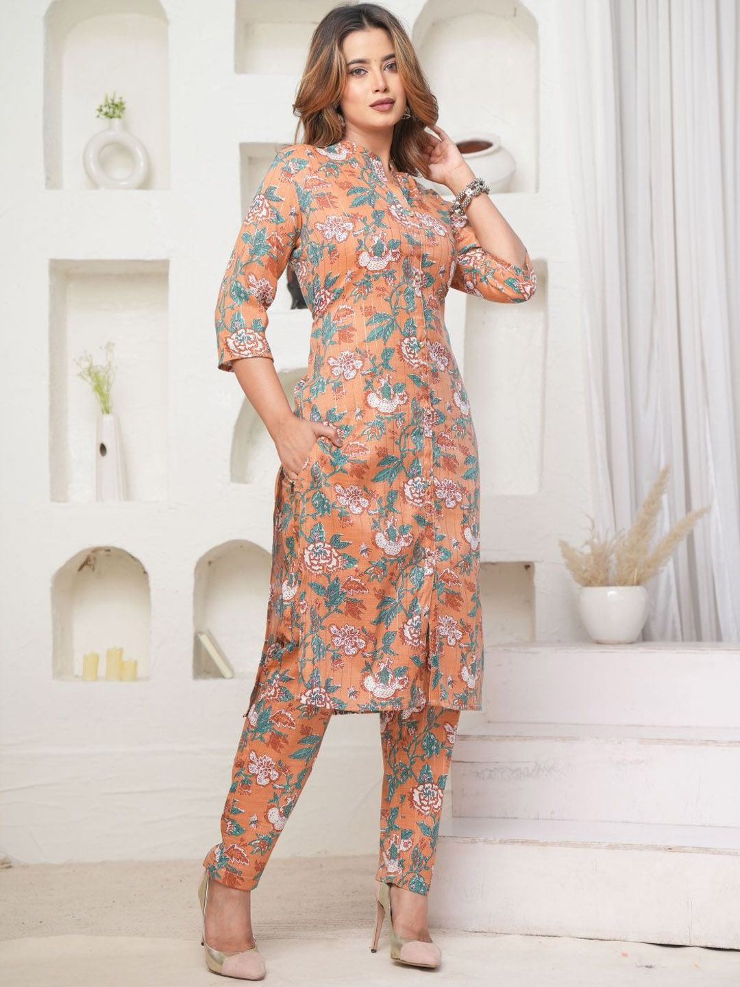 Mehsoos Floral Printed Mandarin Collar Pure Cotton Straight Kurta With Trousers
