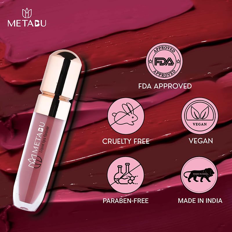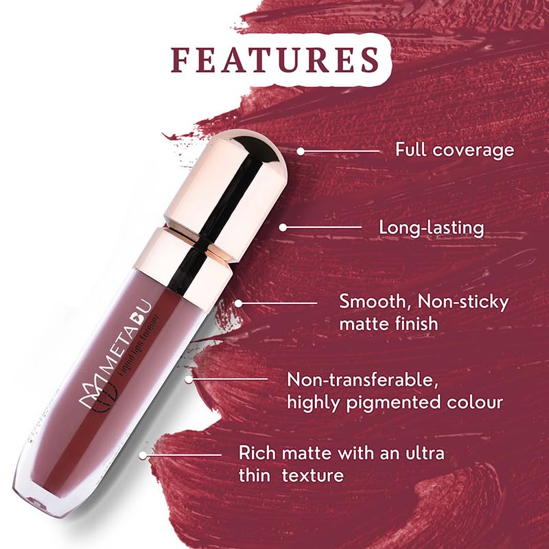 Discover bold beauty that lasts all day with the Metabu Super Stay Matte Liquid Lipstick. Designed for high performance and unbeatable comfort, this ultra-pigmented matte lipstick delivers intense color payoff, a creamy-rich texture, and a non-sticky, feather-light feel — everything you want in a premium liquid lipstick. Formulated with nourishing jojoba oil and vitamin E, it provides a smooth glide and helps keep your lips soft, supple, and hydrated — no flaking, caking, or cracking. Whether you're heading to work, a night out, or a special occasion, this lipstick offers full coverage in one swipe with a stunning matte finish that flatters every skin tone. With its smudge-proof, waterproof, and transfer-proof technology, you can eat, drink, talk, and kiss without worrying about reapplying. Stay confident and flawless for up to 12 hours with this long-lasting formula that locks in color while staying incredibly comfortable on your lips. The Metabu Super Stay Matte Liquid Lipstick is not just about beauty — it’s about clean, conscious beauty. Proudly FDA-approved, paraben-free, vegan, and cruelty-free, this lipstick lets you wear your values as confidently as your color. Choose from 12 gorgeous, wearable shades — from bold reds and deep plums to everyday nudes and pinks — all packed in a sleek, travel-friendly 4.25ml tube that fits effortlessly in your purse or makeup bag. How to Apply: Apply your favorite lip color to the center half of your lips and use your lip brush to distribute an even layers for color up to the outer edge. Add additional layers for better effect.