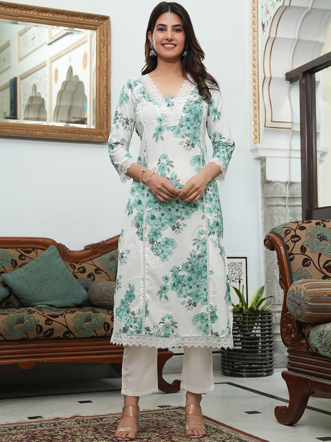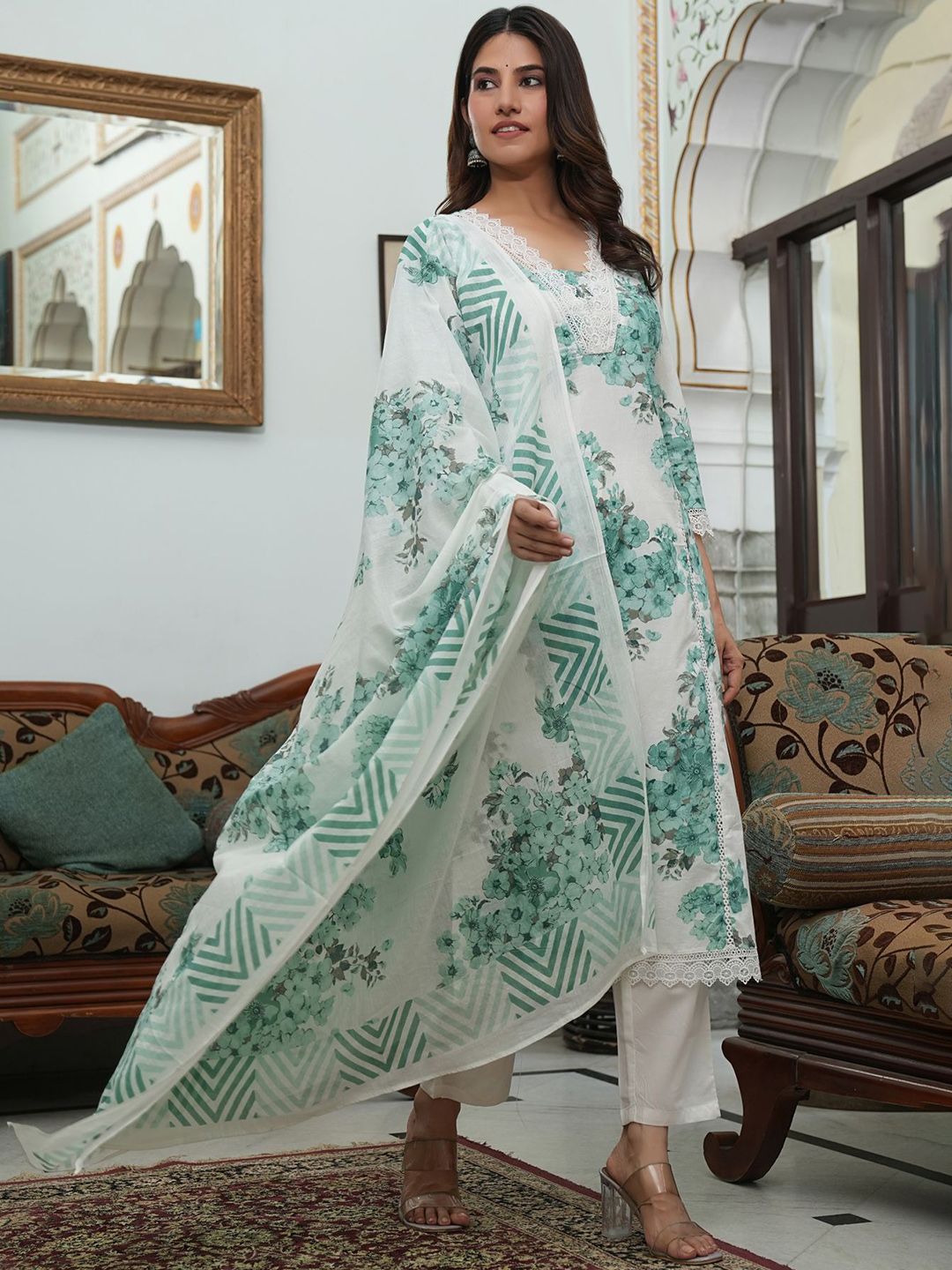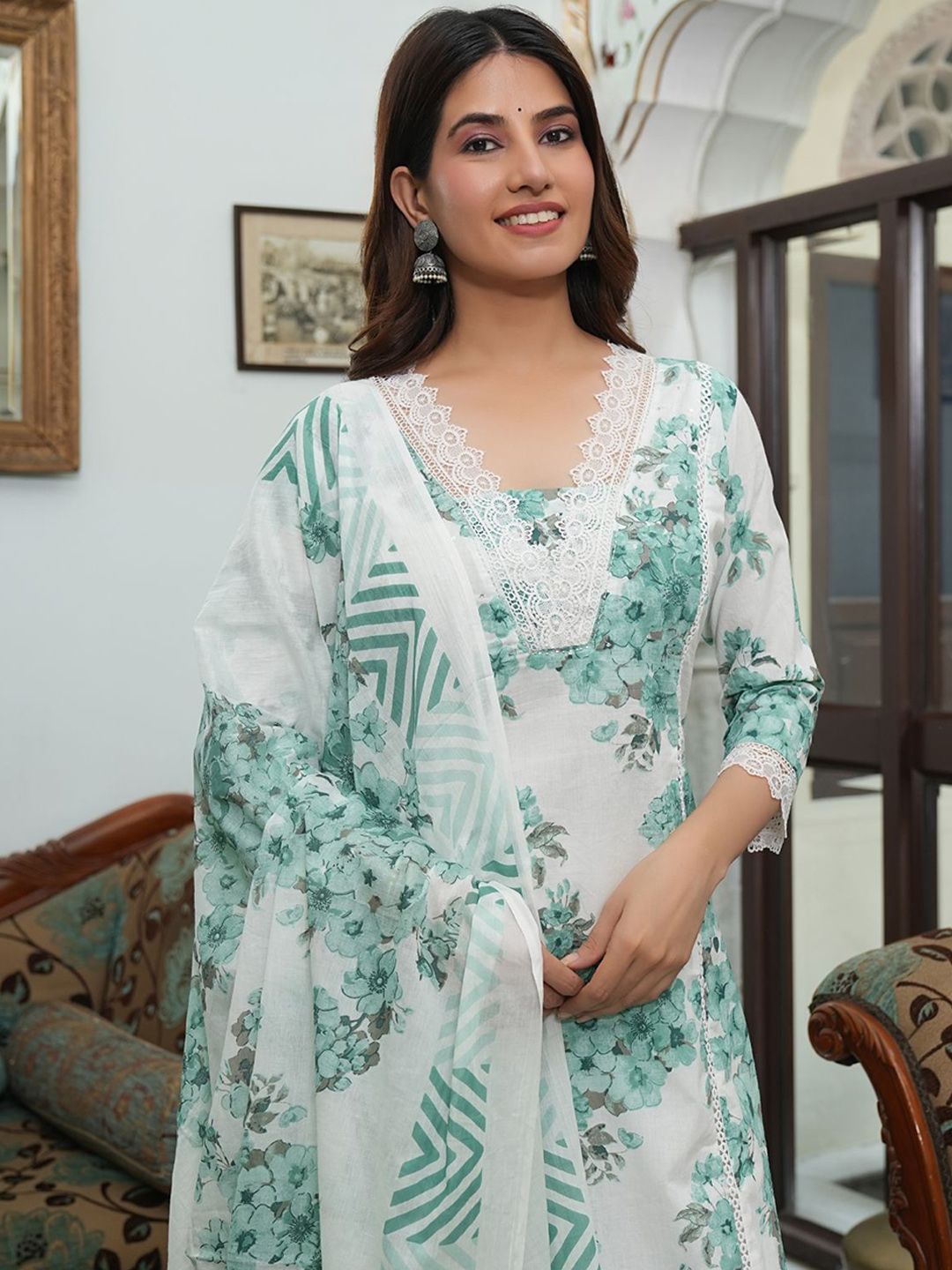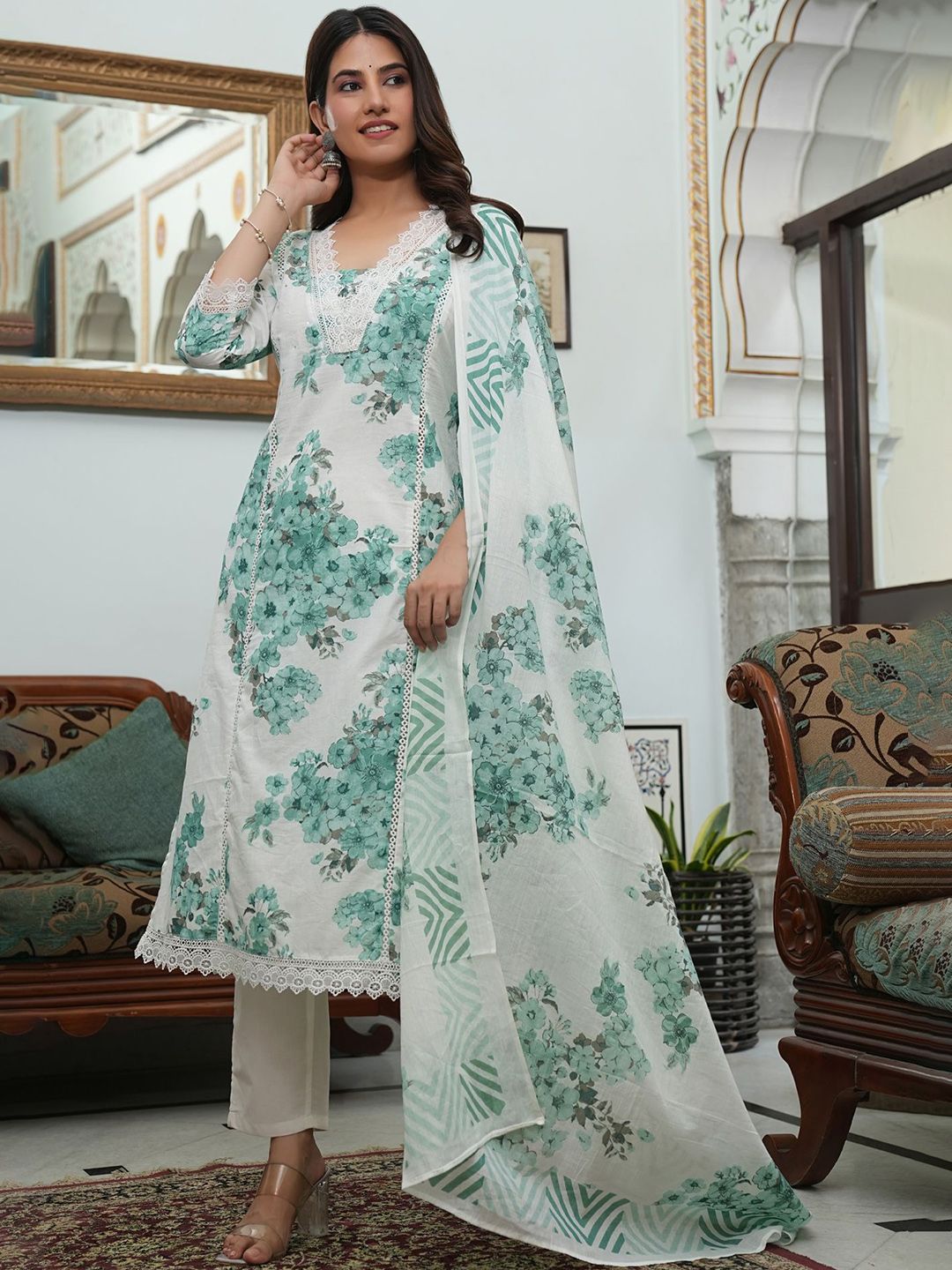 MF Hayat Floral Printed V-Neck Pure Cotton Straight Kurta With Trousers & Dupatta