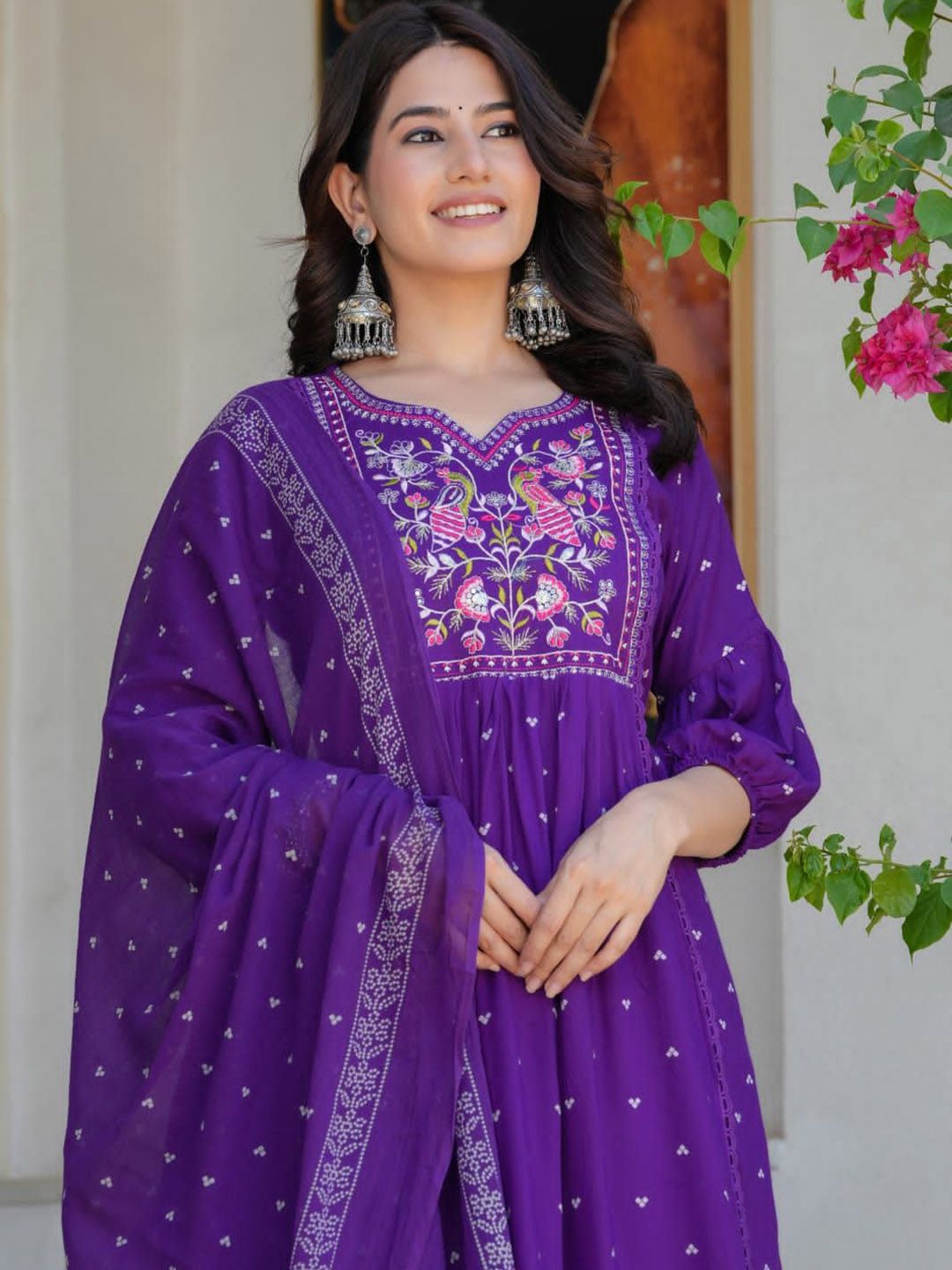 MILAAV Floral Printed V-Neck Anarkali Thread Work Kurta With Trousers & Dupatta