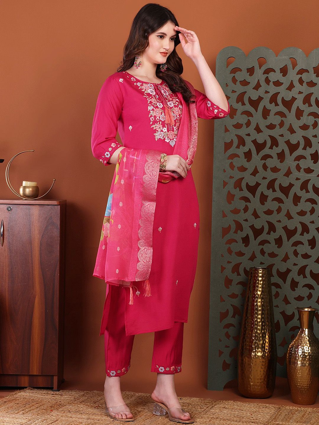 Milastru Women Floral Embroidered Regular Thread Work Kurta with Trousers & Dupatta