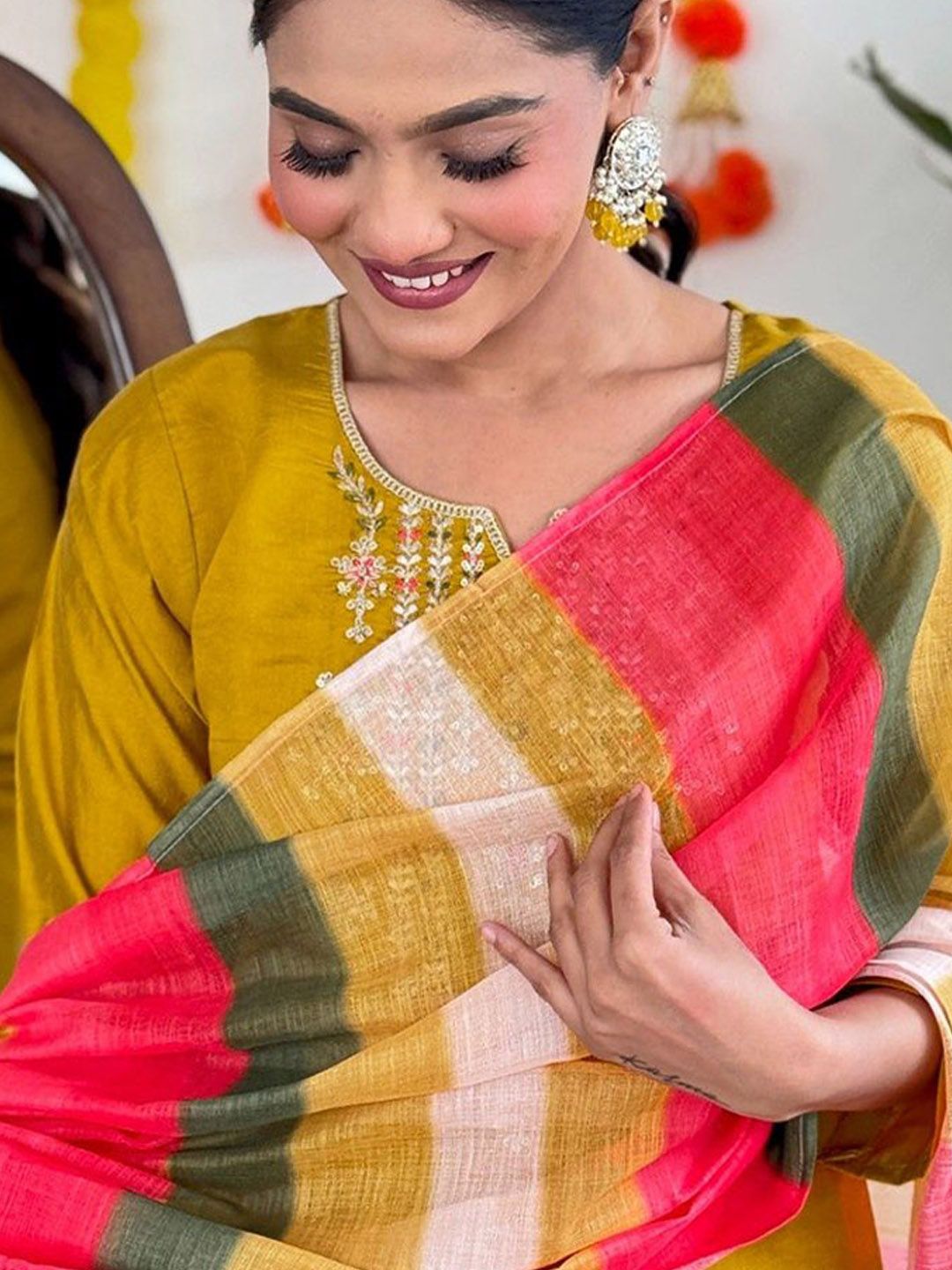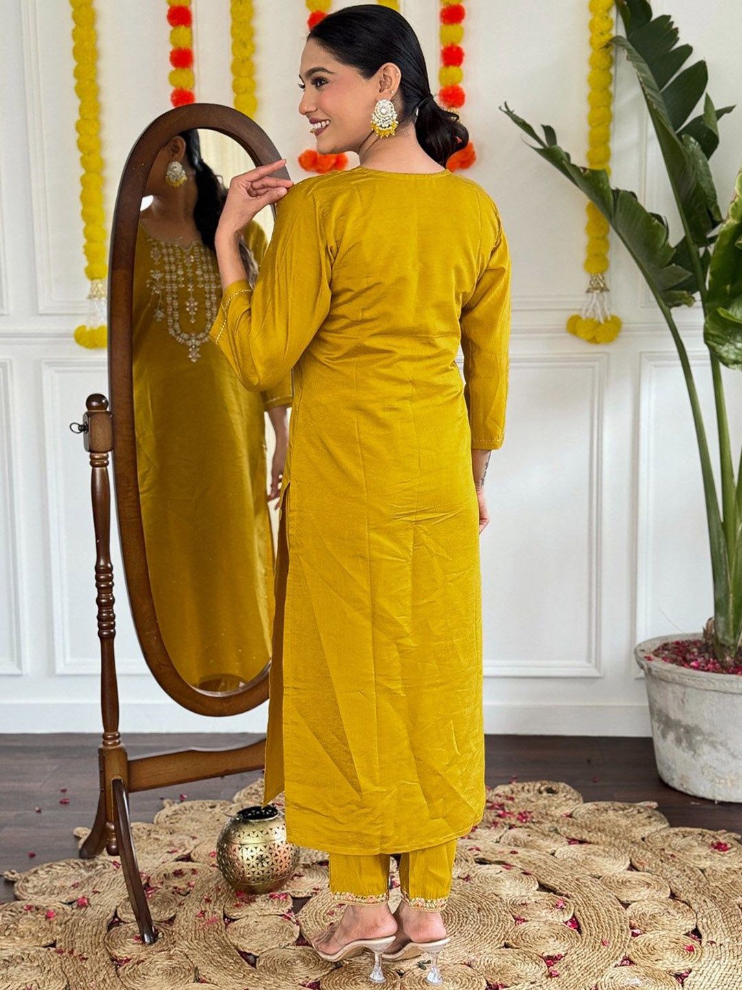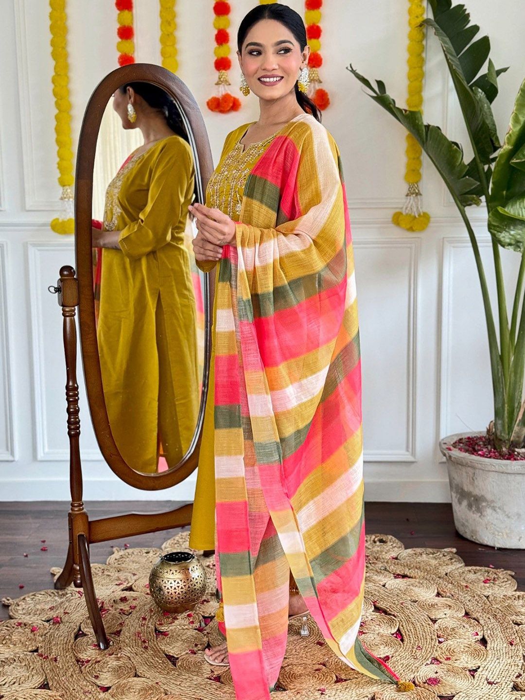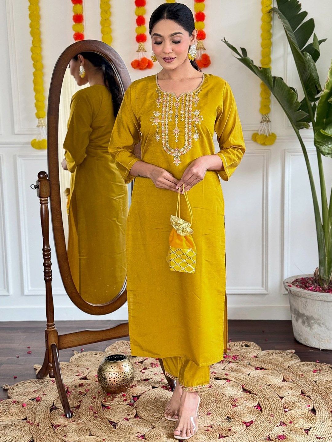Moda Rapido Floral Embroidered Notch Neck Chanderi Silk Kurta With Trousers & Dupatta