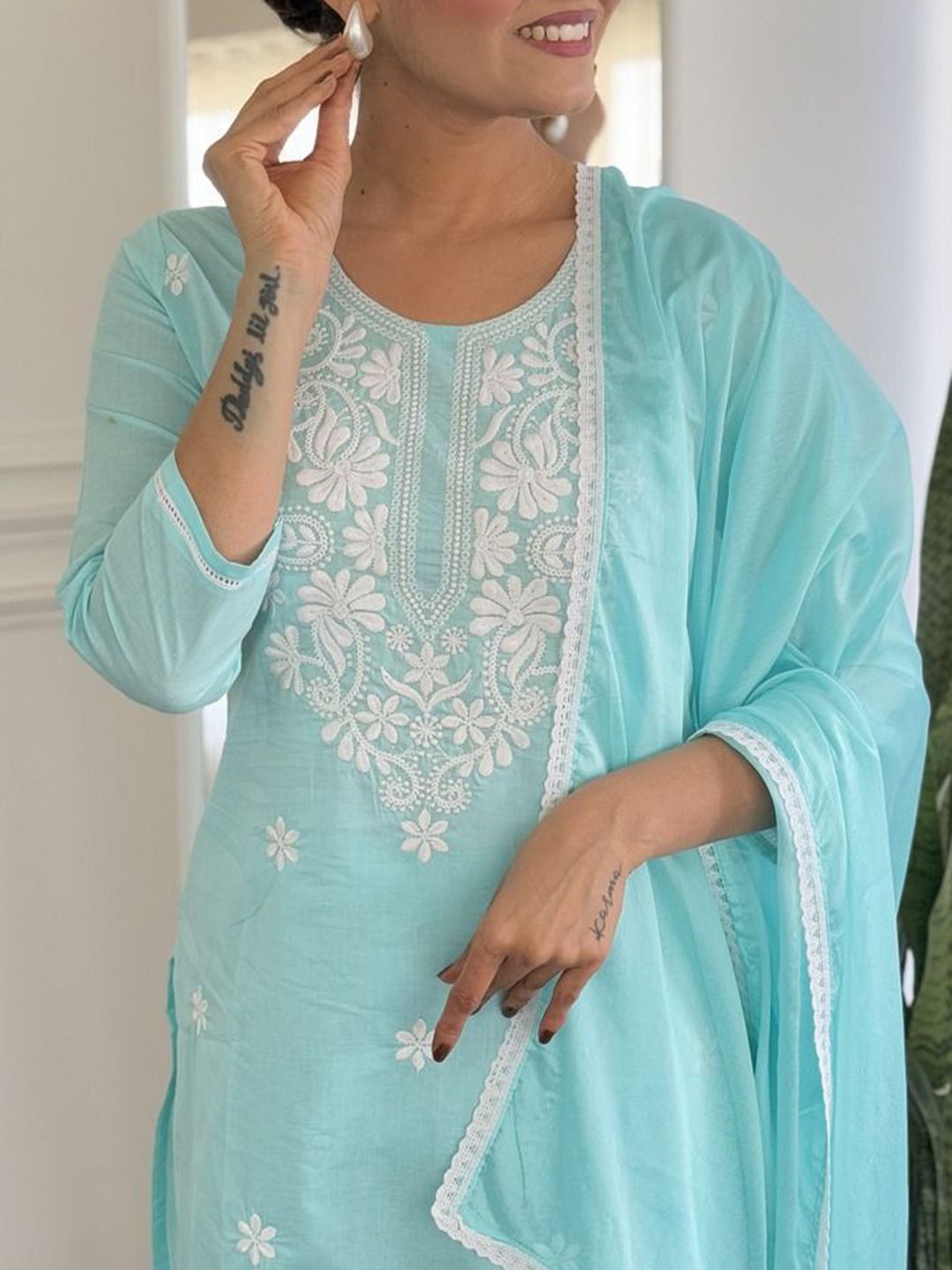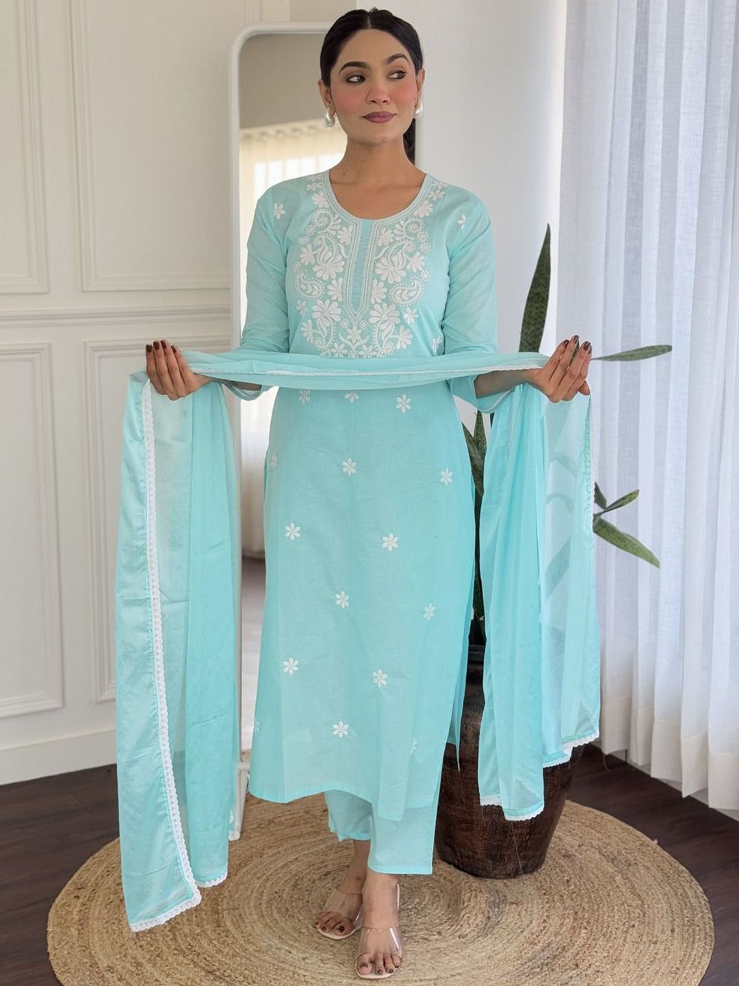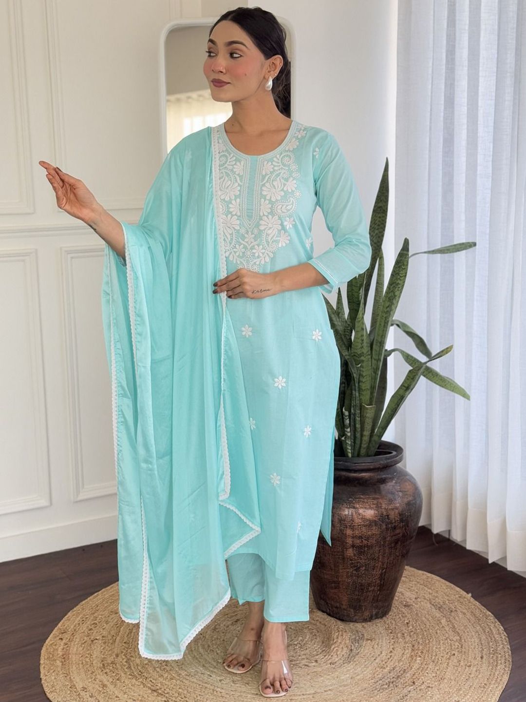 Moda Rapido Floral Embroidered Round Neck Pure Cotton Kurta With Trousers & Dupatta