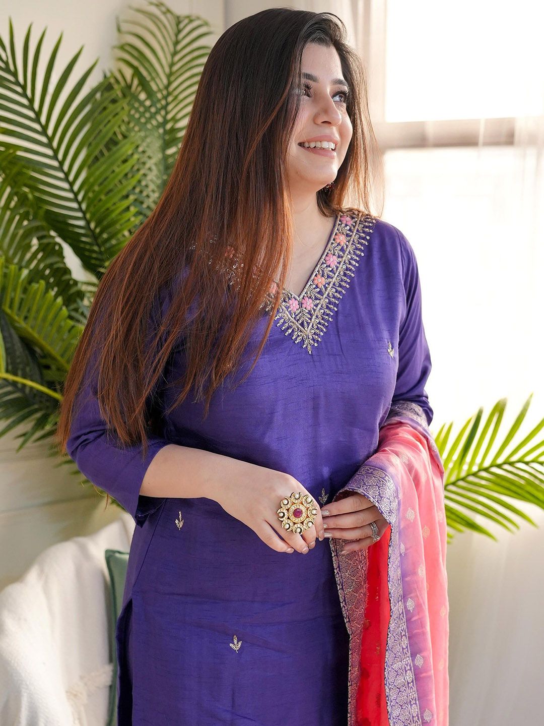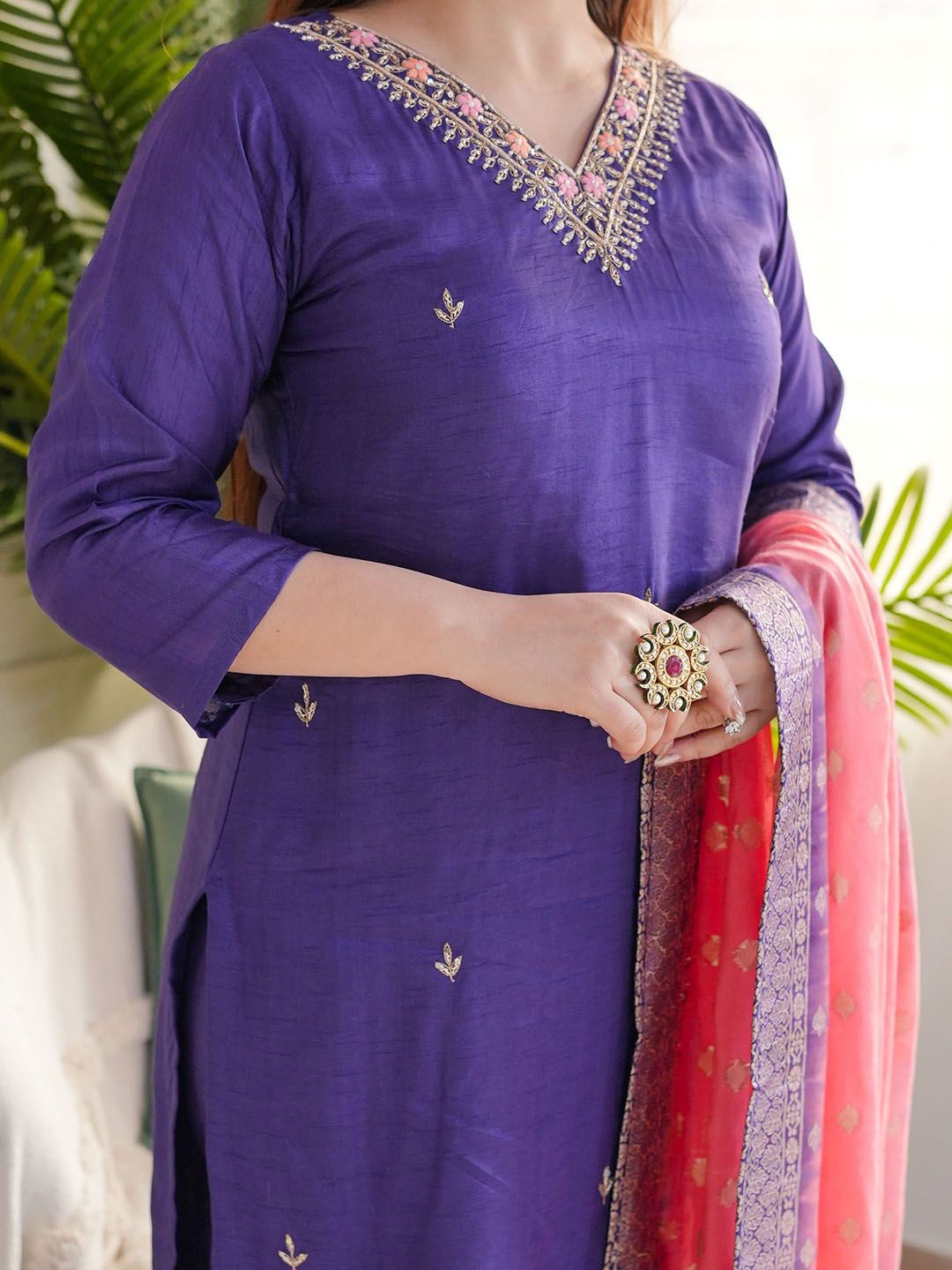 Moda Rapido Floral Embroidered Thread Work Chanderi Silk Kurta With Trousers & Dupatta