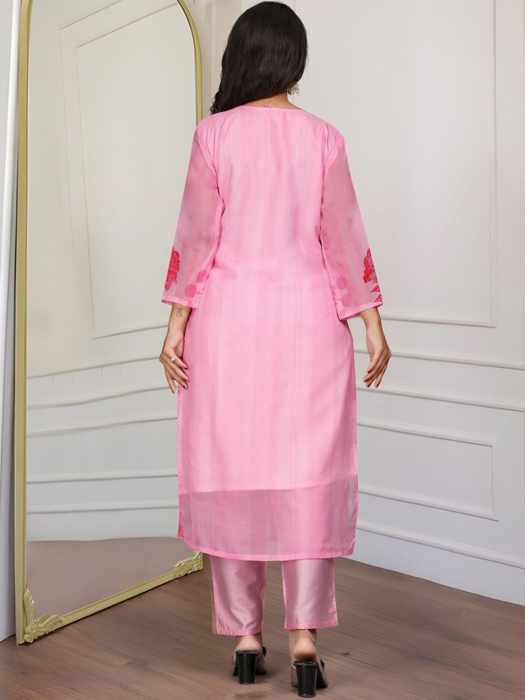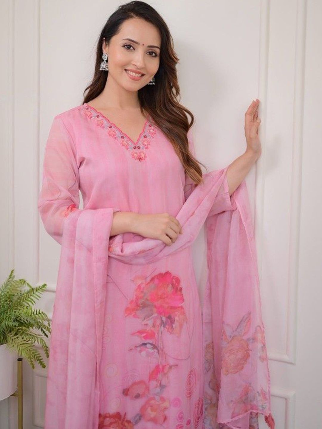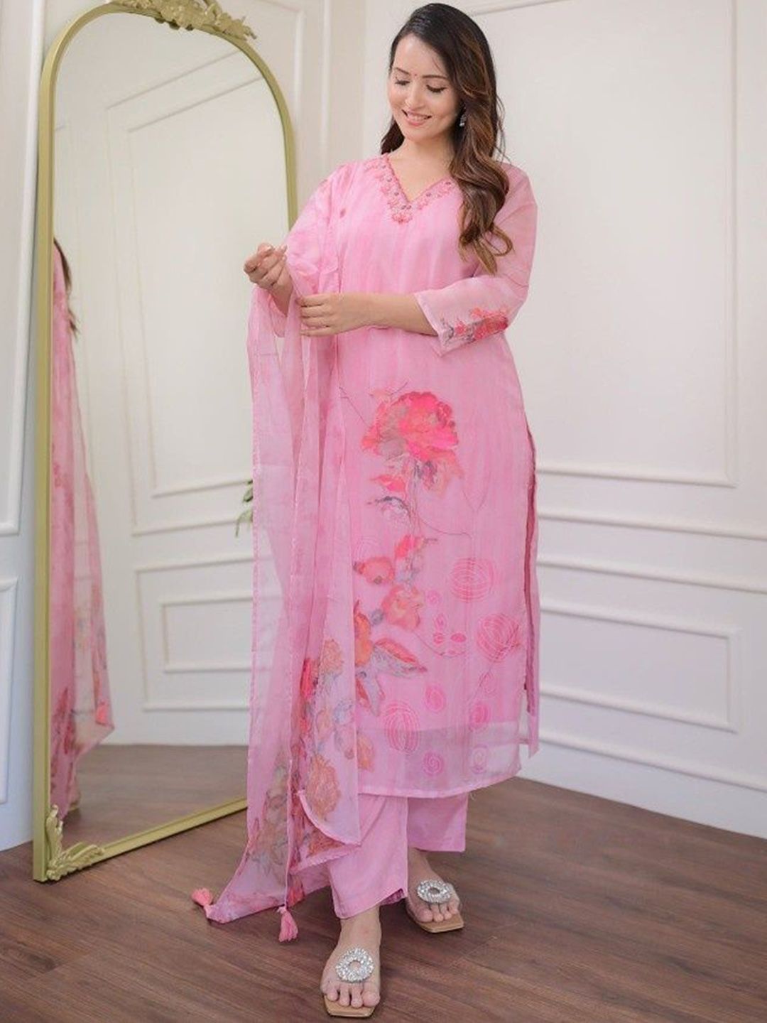 Moda Rapido Floral Printed V-Neck Organza Straight Kurta With Trousers & Dupatta