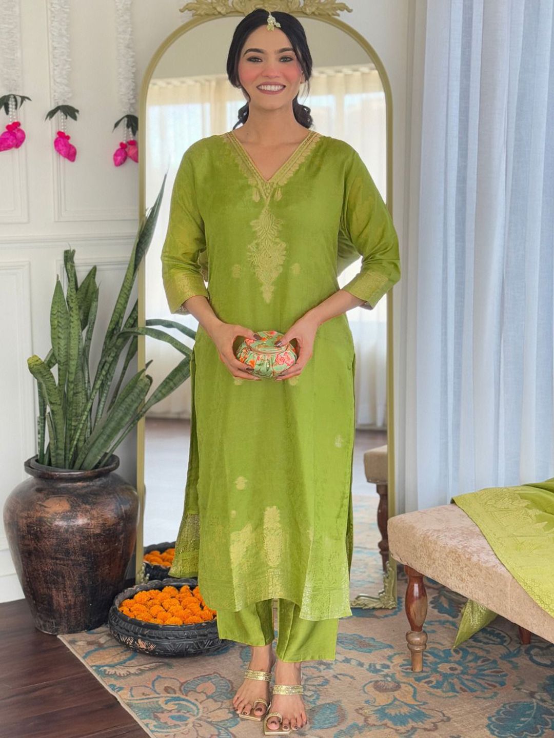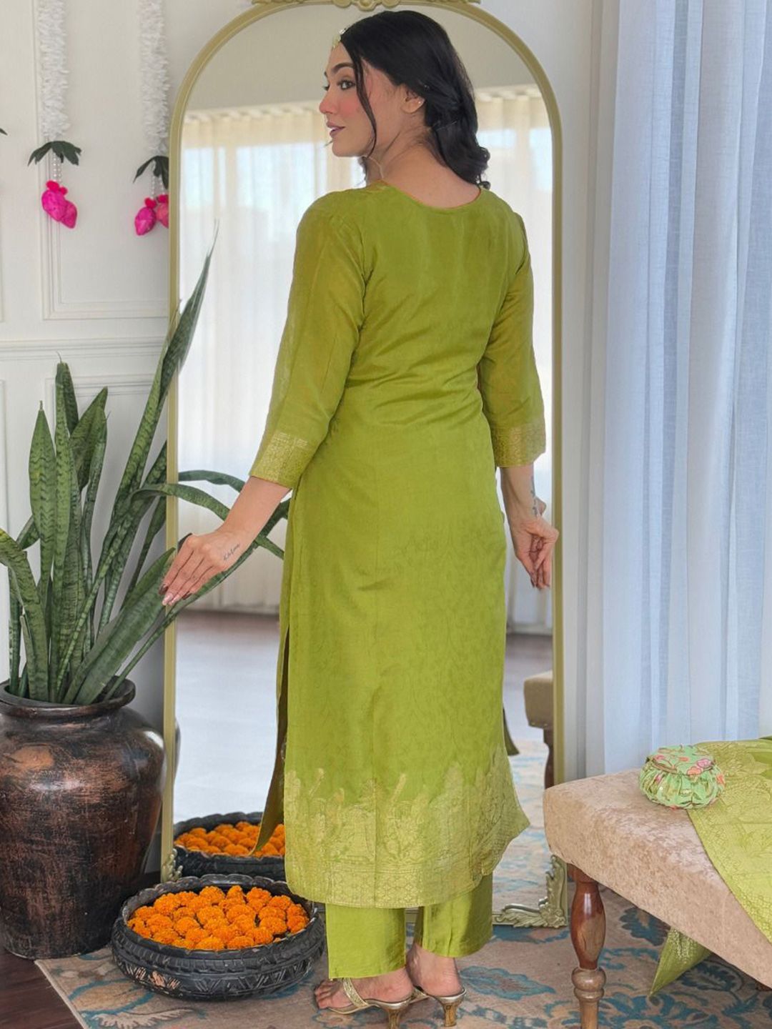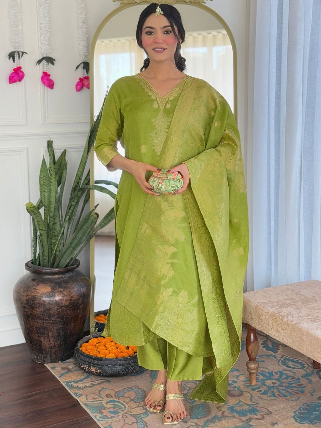 Moda Rapido Floral Woven Design V Neck Kurta With Trousers & Dupatta