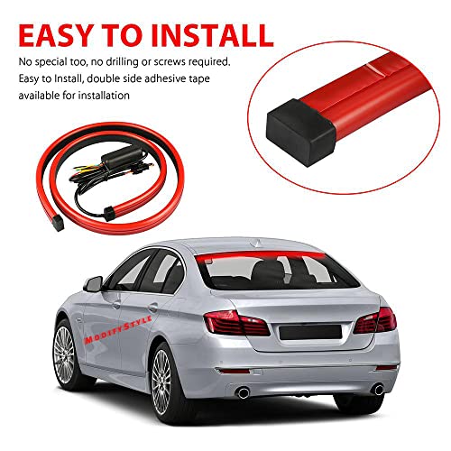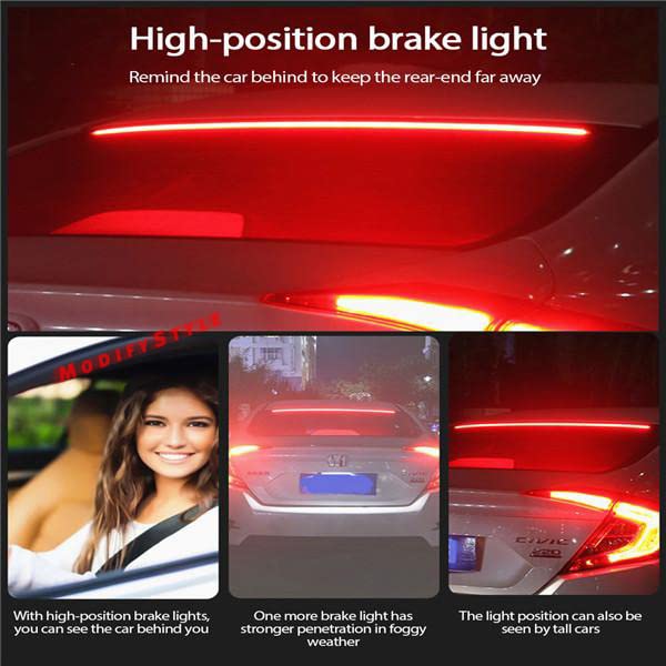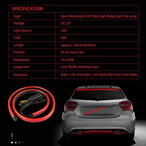 This 90 cm length LED Strip acts as a 3rd brake light on the rear windshield, even your vehicle has an upper 3rd brake light already, you still can install this light on your car easily. Lights up immediately without delay and it is an energy-saving and durable product. Improves Car Visibility even in Foggy and Rainy Weather. Has Indicator, Brake and Running Function. Makes your Car looks Stylish. LED lights less heat radiation, low power consumption, long service life. Easy To Installation: With Double-Sided tape, you can install the lights inside rear windshield, just make sure your window is clean and free from any smudges before installing.