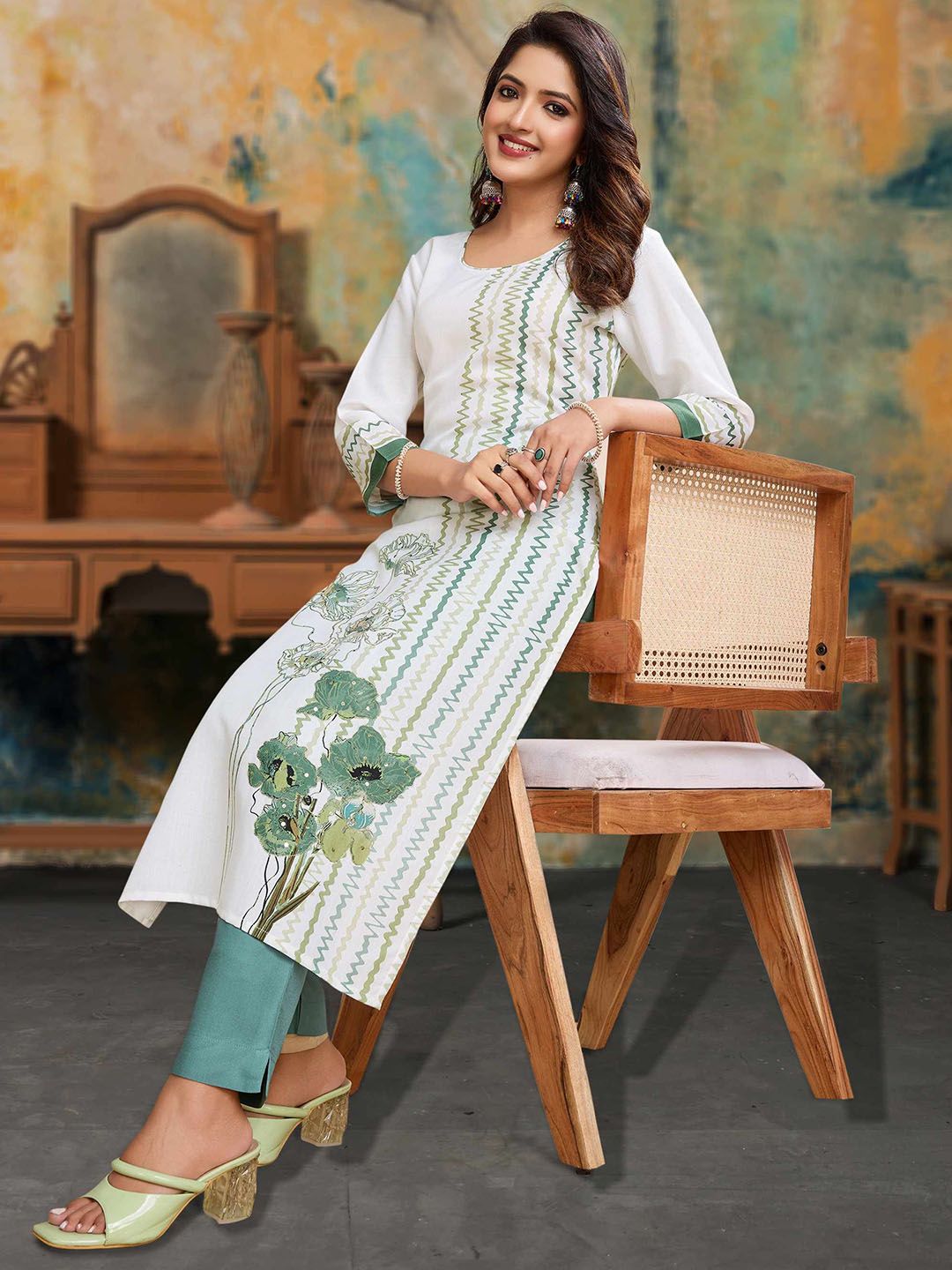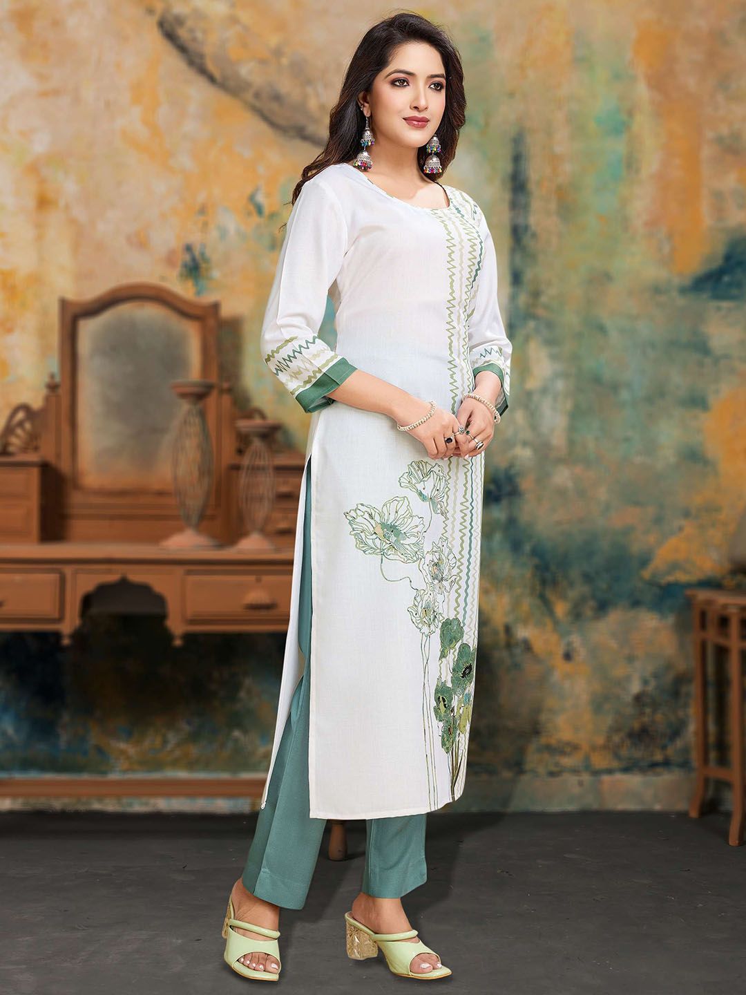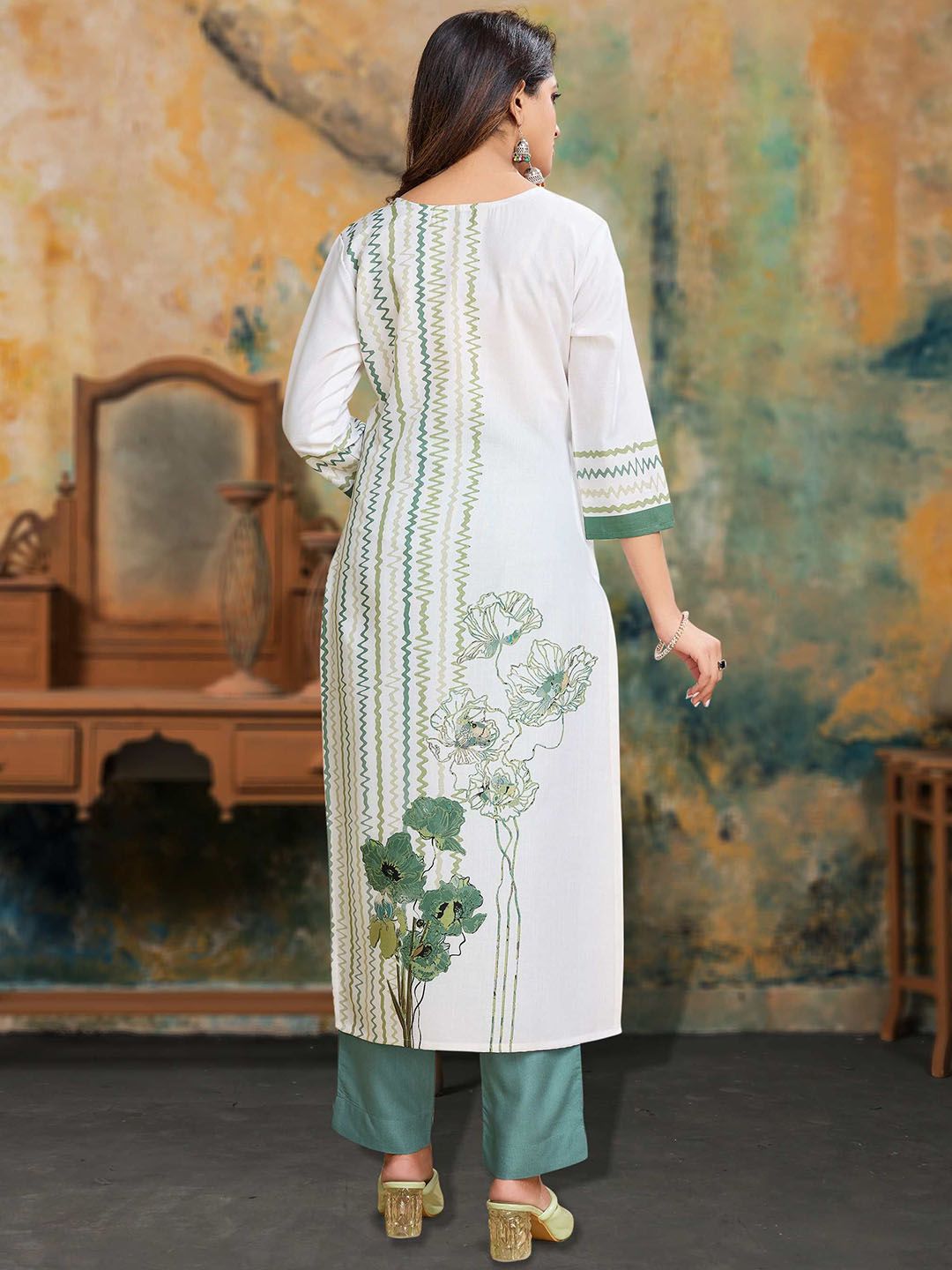 MOJILAA Women Printed Regular Sequinned Linen Kurta with Trousers Kurta Sets