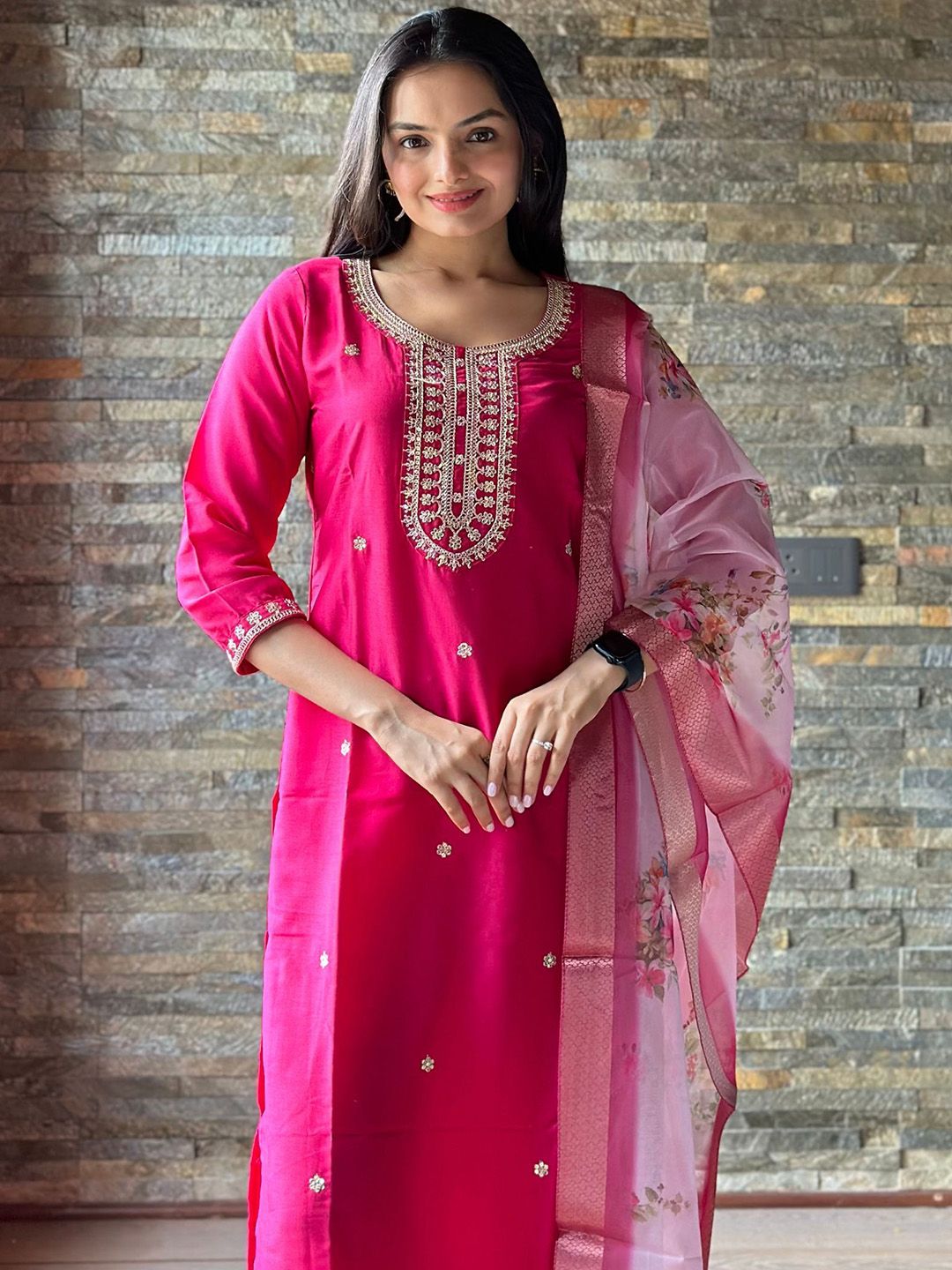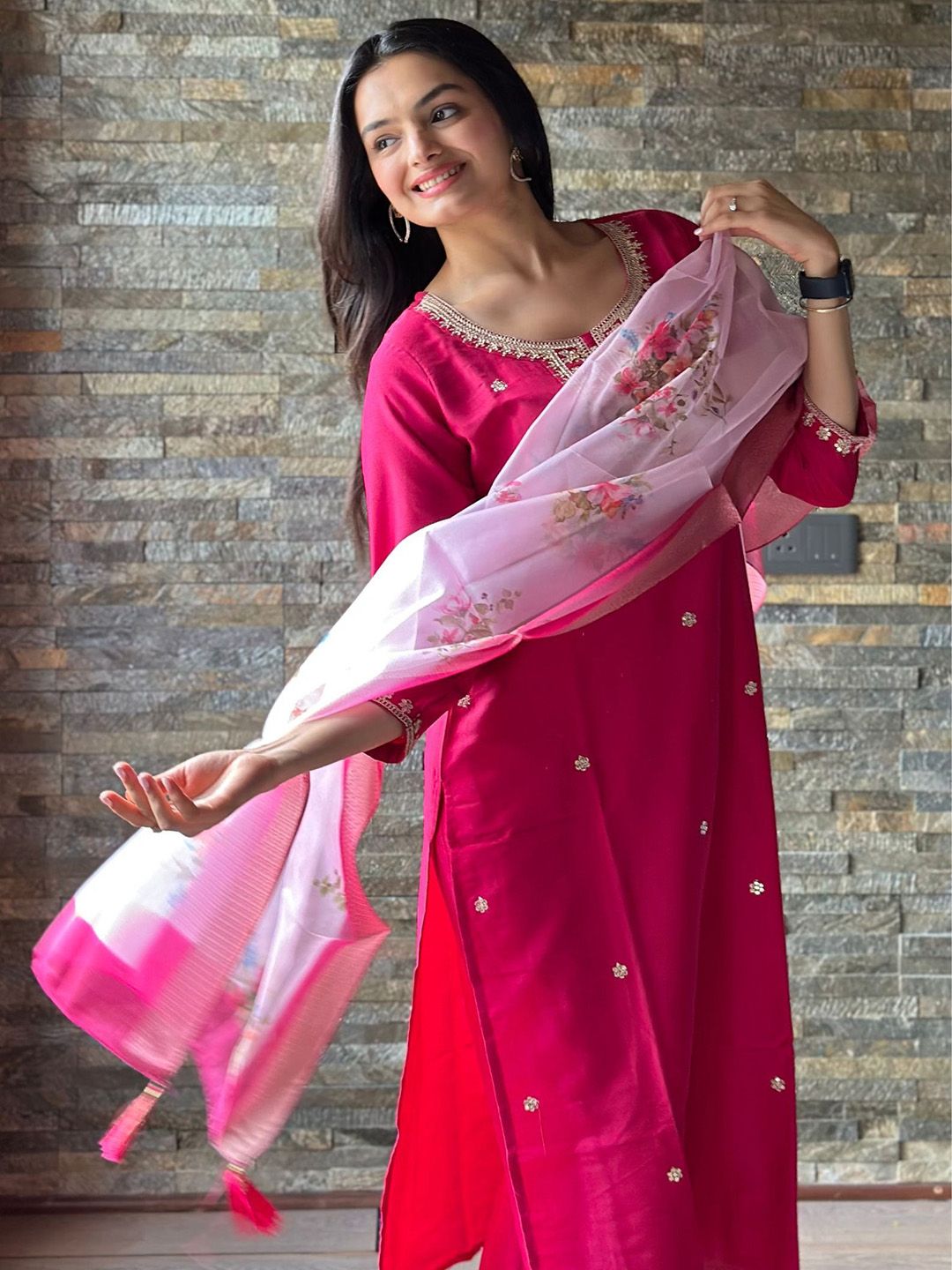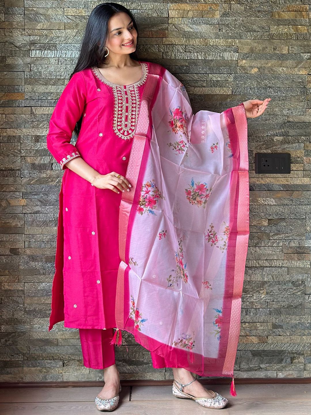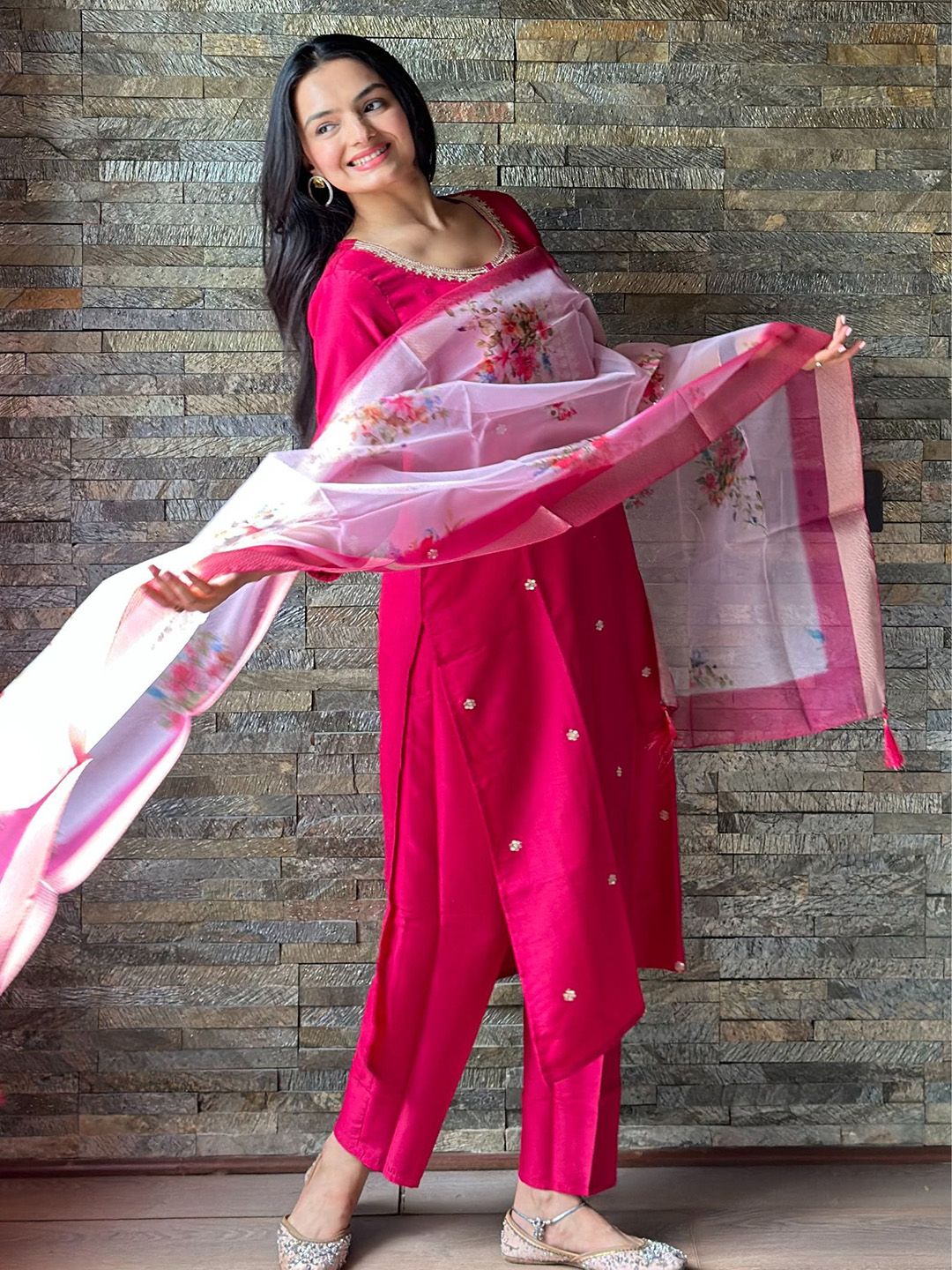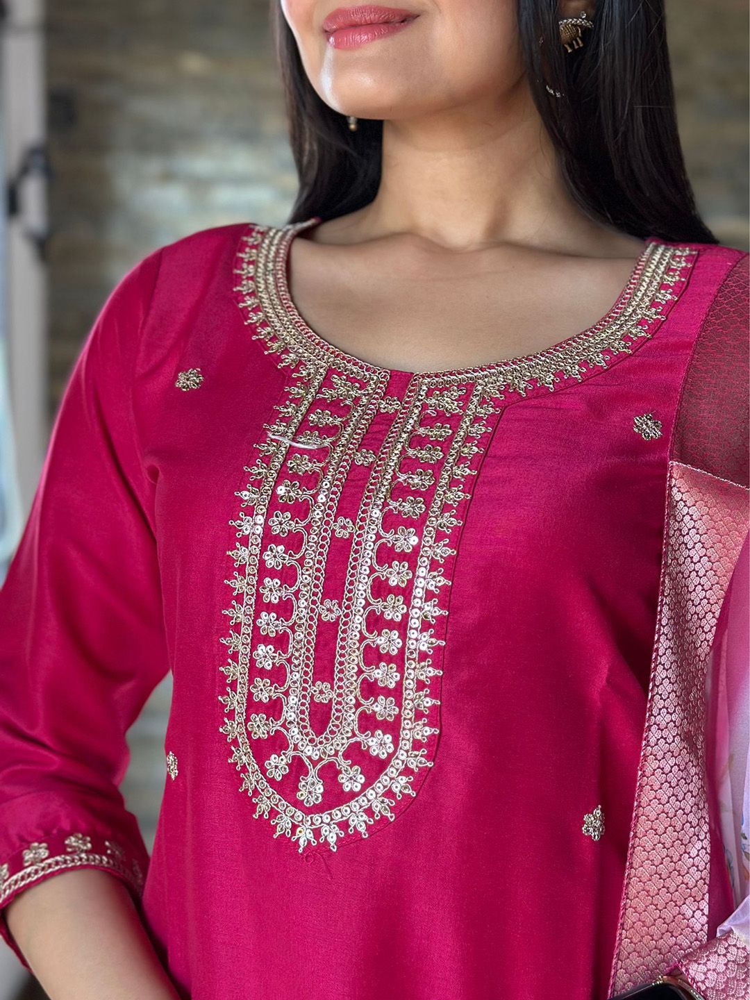 MOKOSH Floral Embroidered Thread Work Chinon Kurta With Trousers & Dupatta