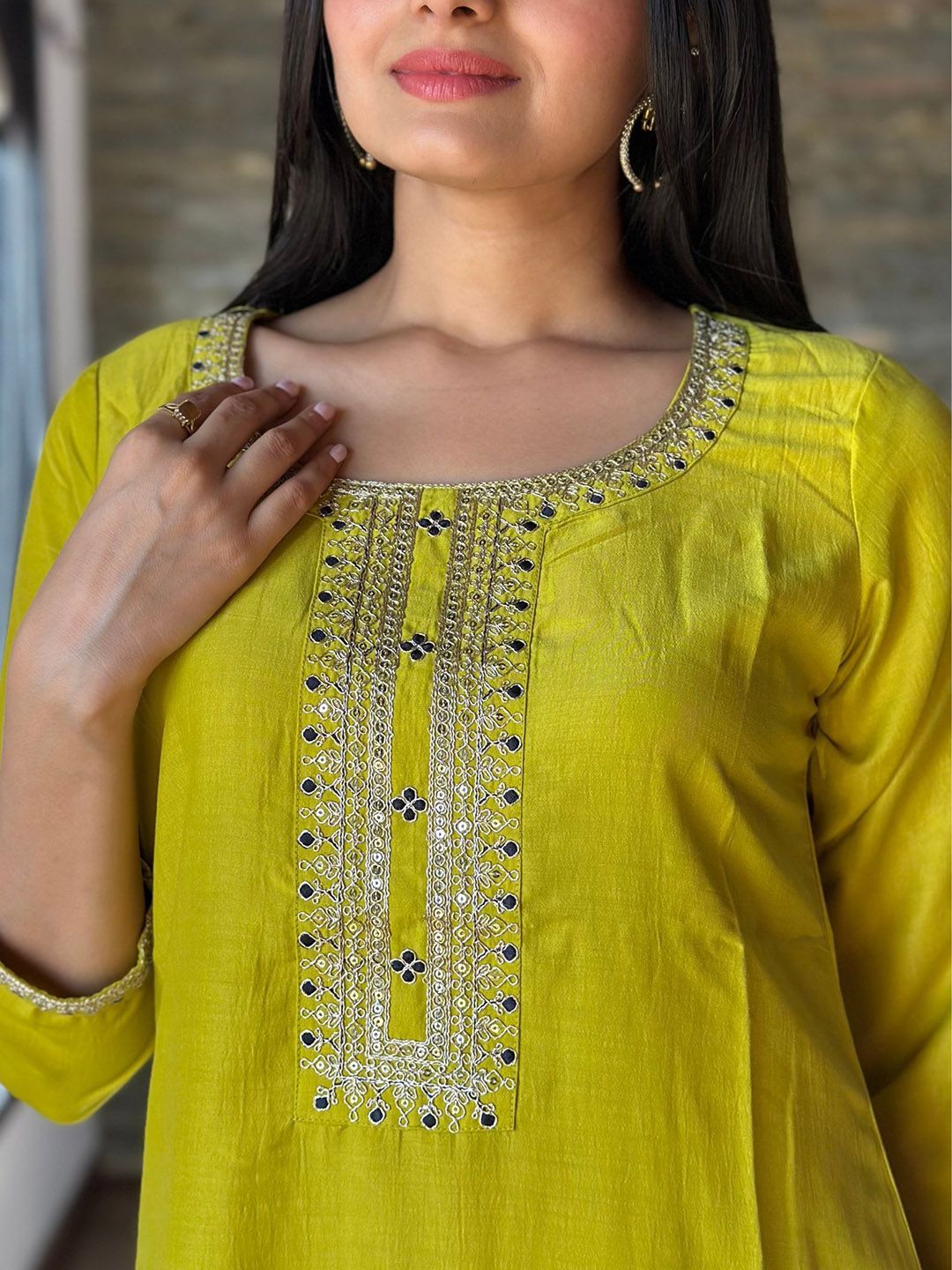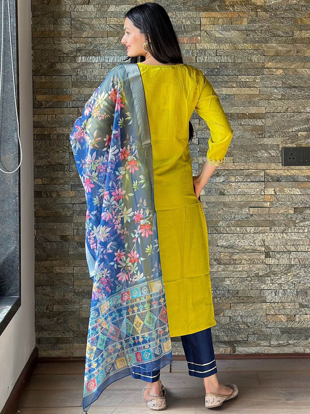 MOKOSH Floral Yoke Design Round Neck Thread Work Chinon Kurta With Trousers & Dupatta