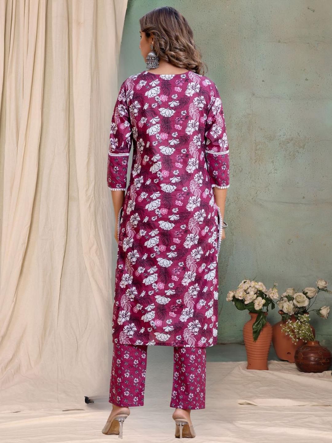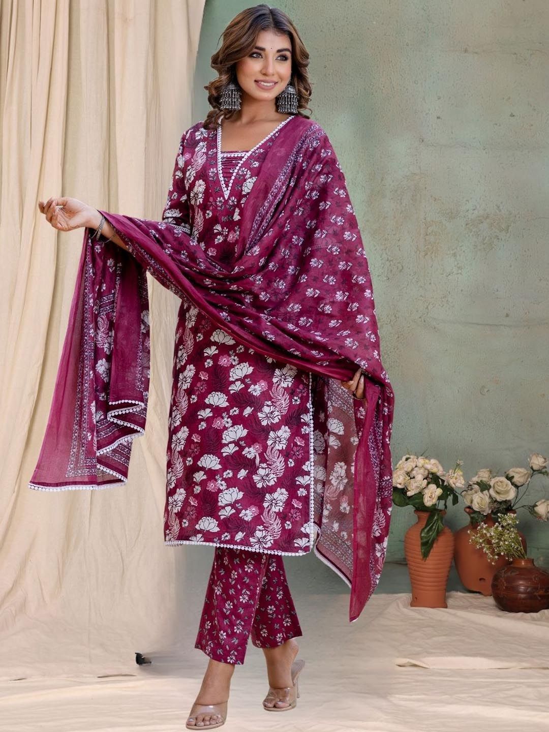 Mokshielite Women Floral Printed Cotton Kurta with Trousers & Dupatta