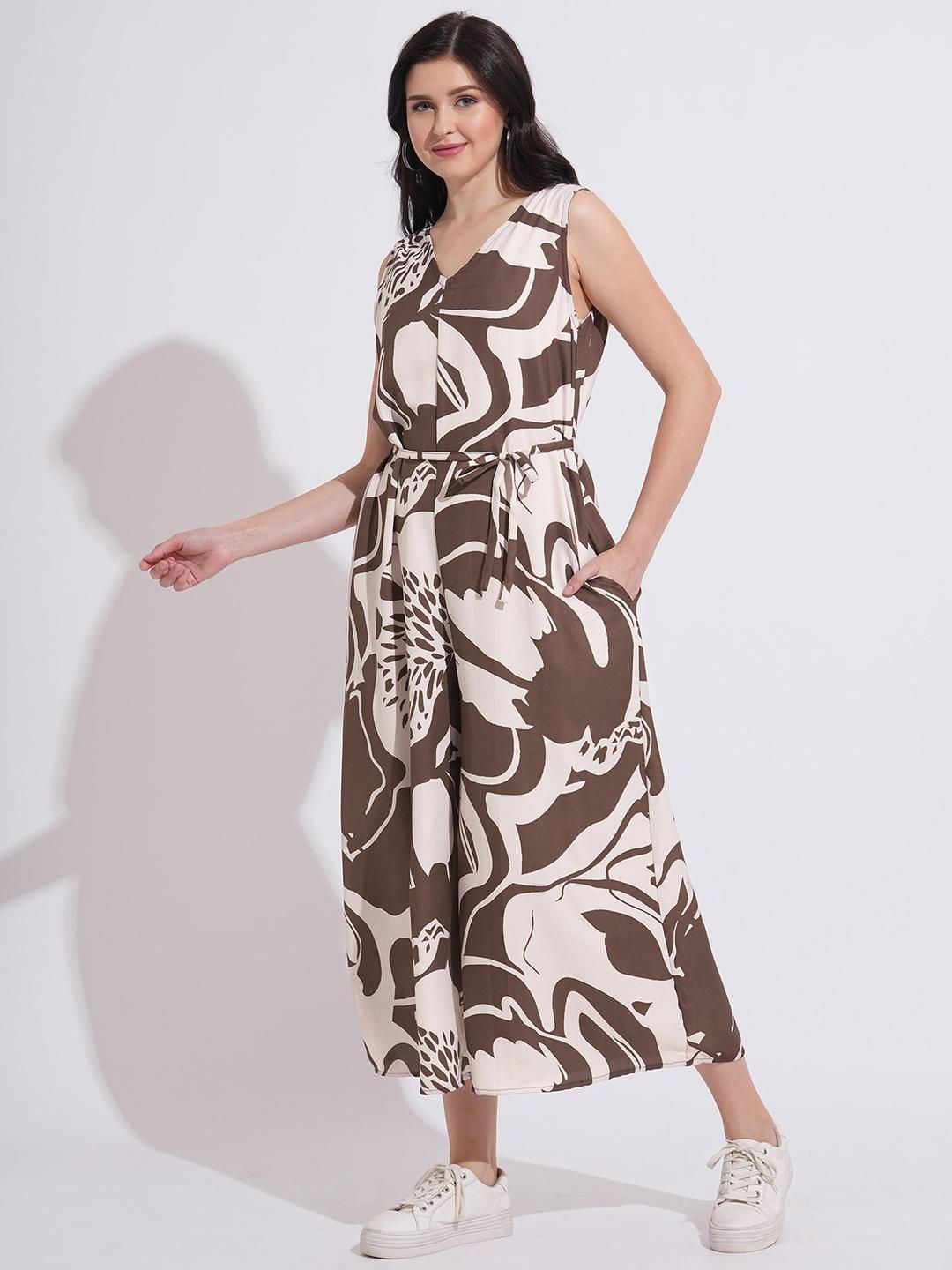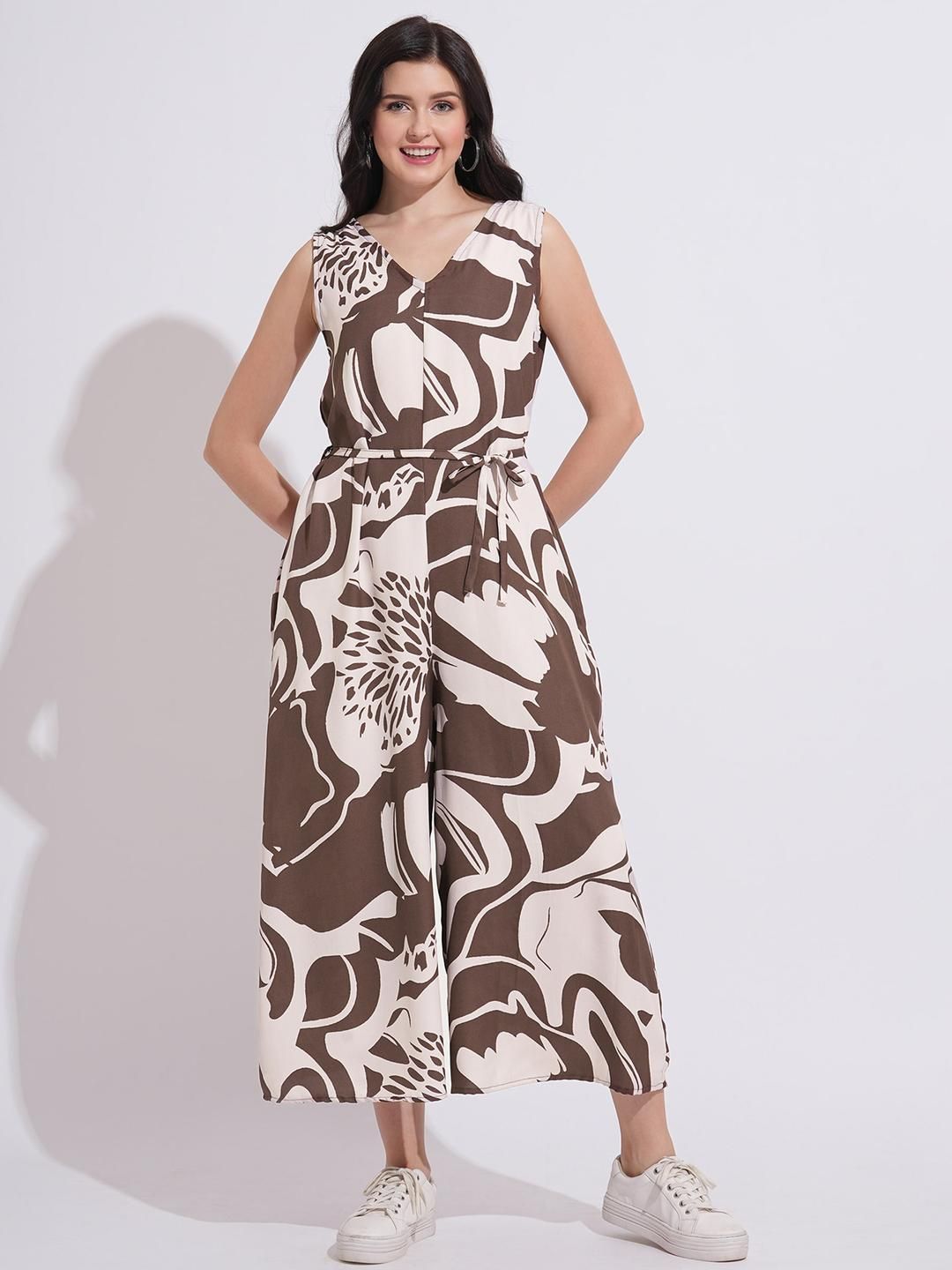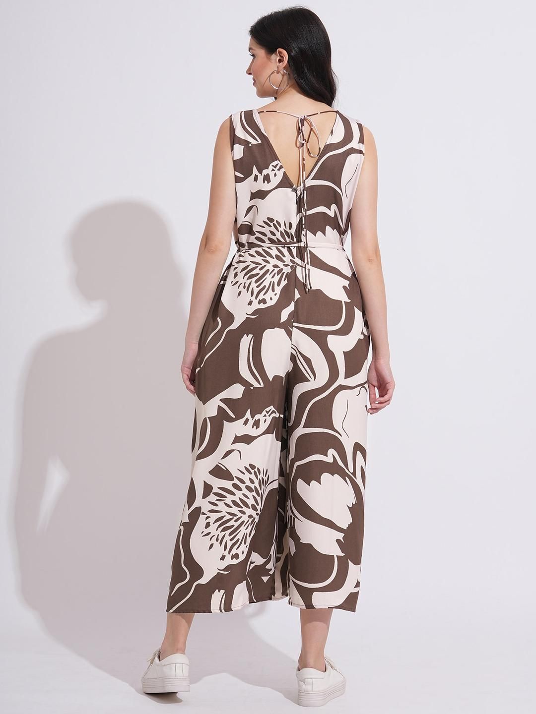 Murcia Brown & Creme Floral Printed Anti Fit Jumpsuit With Waist Tie-up
