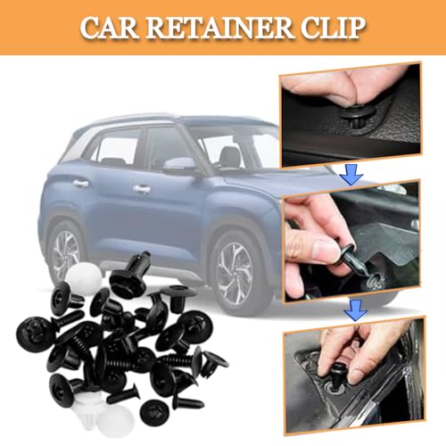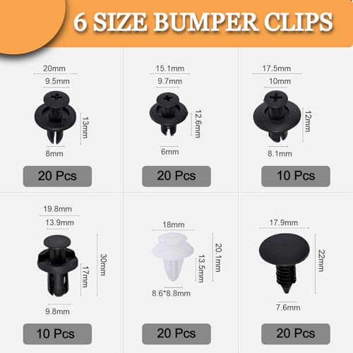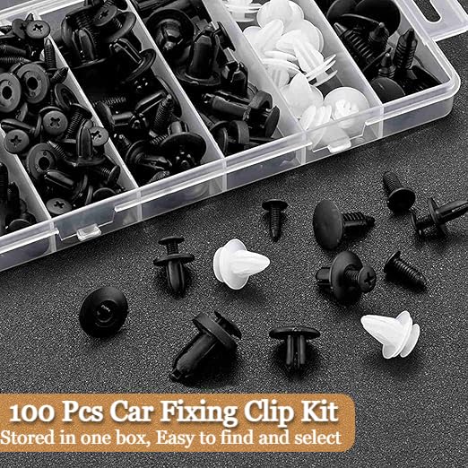 [car bumper clips] ; This Car Panel Removal Tools are made of high-quality black nylon material, which has anti-wear and anti-corrosion effects. Package includes ; 6 Size Auto Fastener Clip 100 pcs Car Door Plastic Trim Panel bumper Clip [car door plastic trim panel clip features] : Car Auto Retainer Rivet fastener allows you to quickly and easily remove door panels and trim clips without damaging them for easy access to tight areas. [fastener clips for car] : The car clips and fasteners are ideal for motor vehicles like car, auto, domestic appliances, furniture, and electrical equipment, used as trim panel clips, door trim clips, door panel clips, bumper clips, fender clips, engine cover, splash shield retainers, and other interior accessories replacement, etc. [car push retainer clips] - Don not worry about lost or damaged body fasteners. All the necessary retainers for exact replacement of old and broken retainer. [car door clips push type] : Our Auto Door Trim Clips set body panels adopts ergonomic design with super lightweight easy handheld features which effectively effort saving for various interior and exterior car trimming in the shortest time