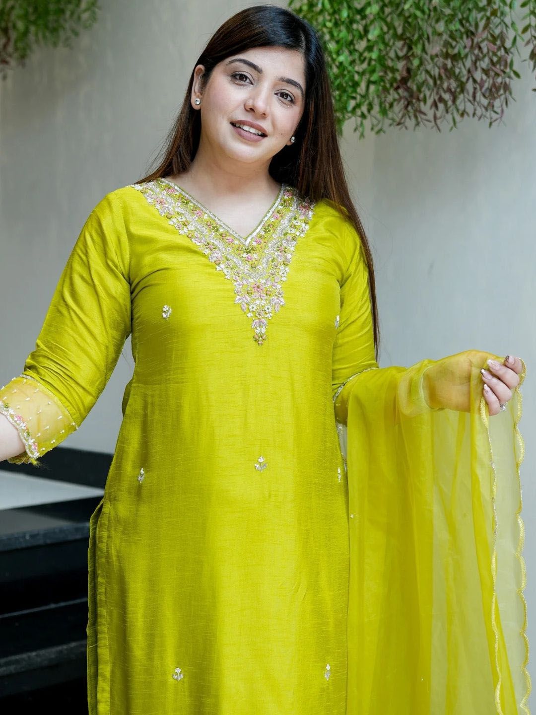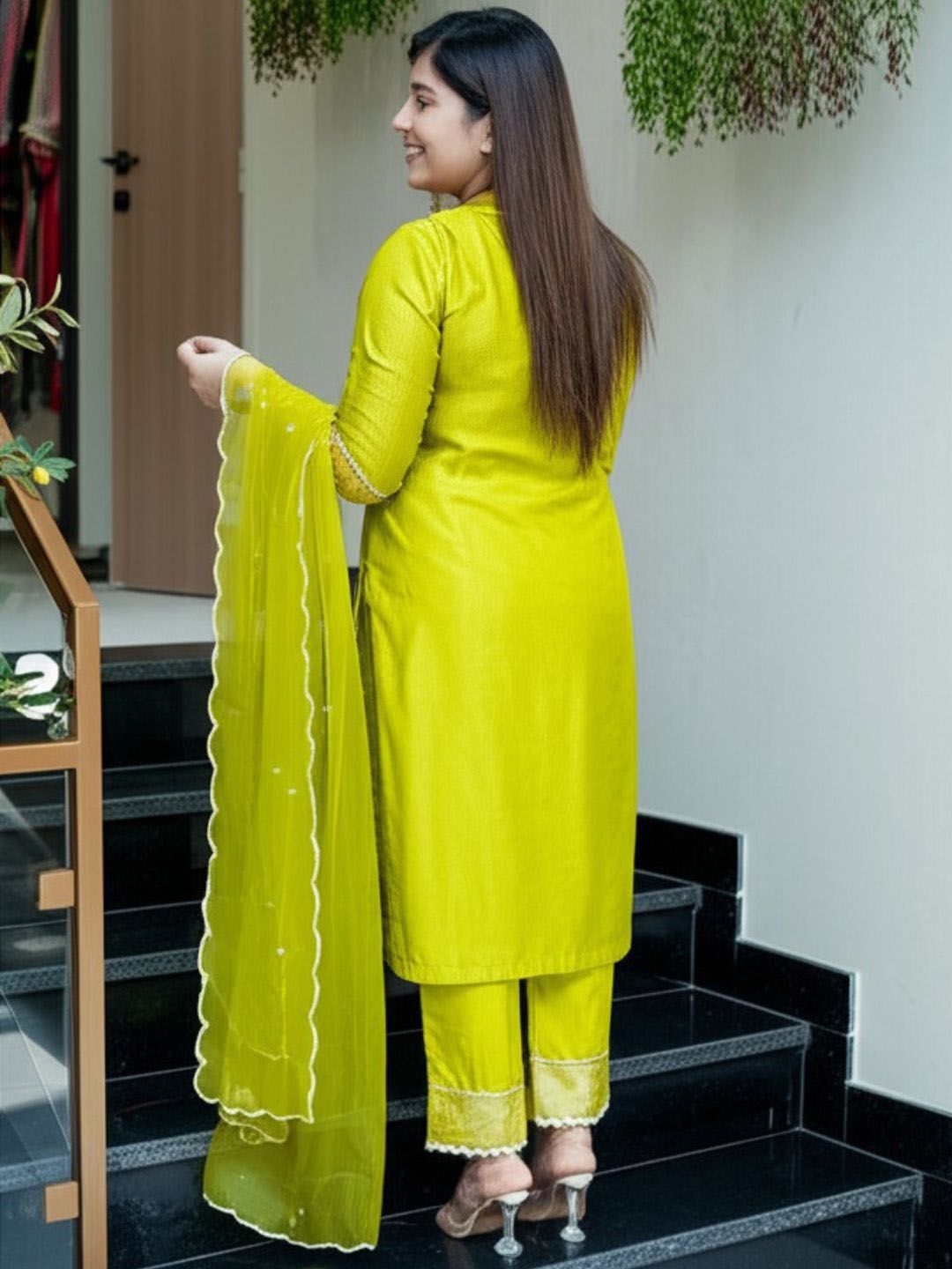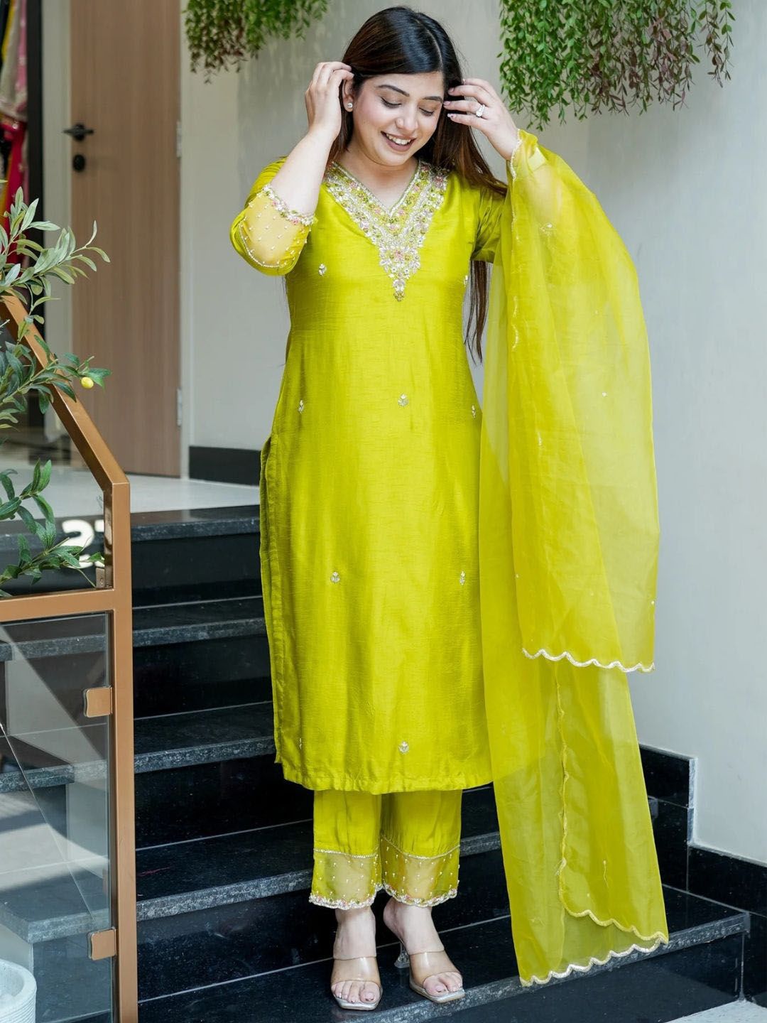 Navlik Embroidered Beads & Stones Chanderi Silk Straight Kurta With Trousers & Dupatta