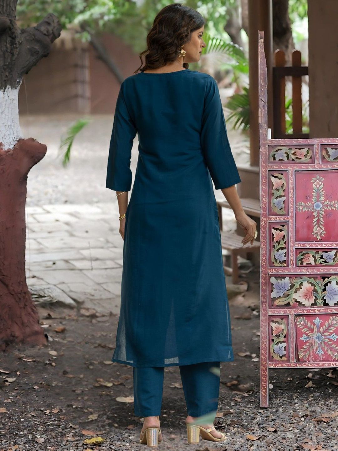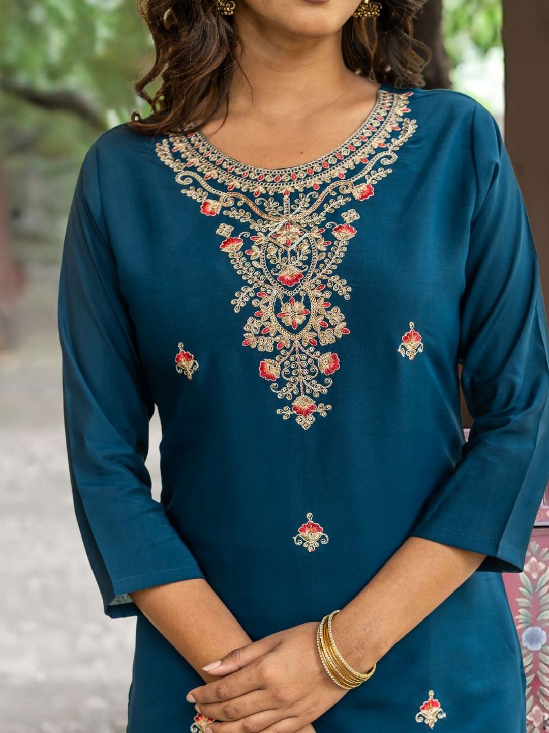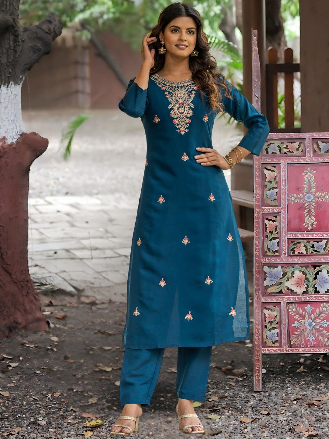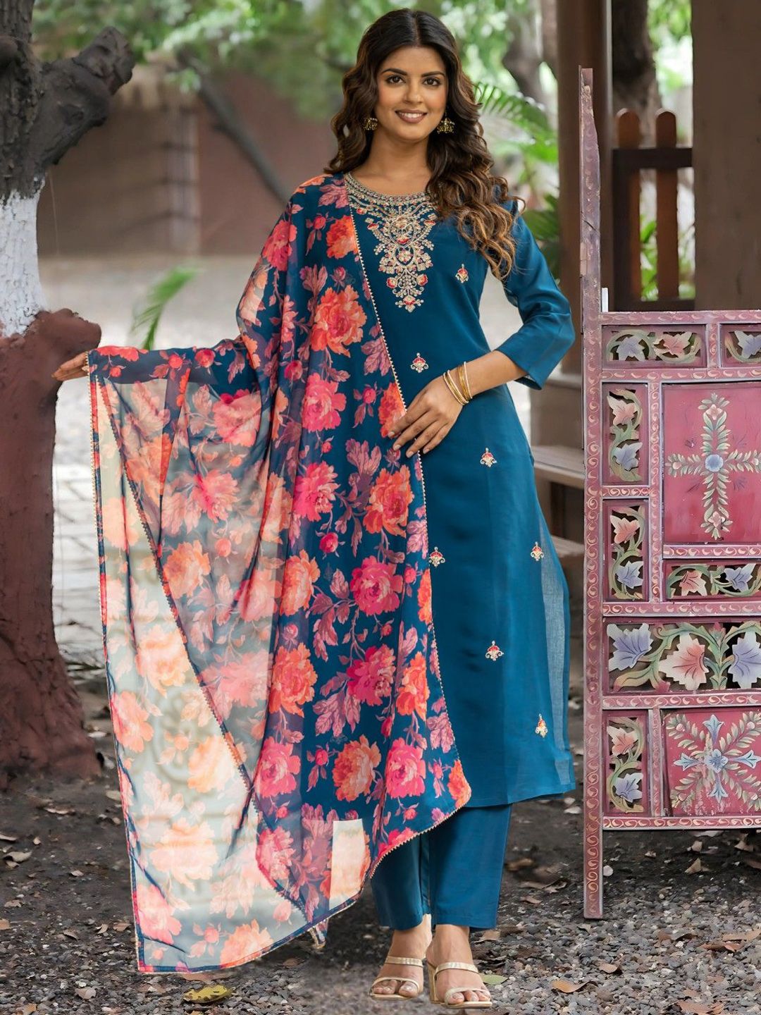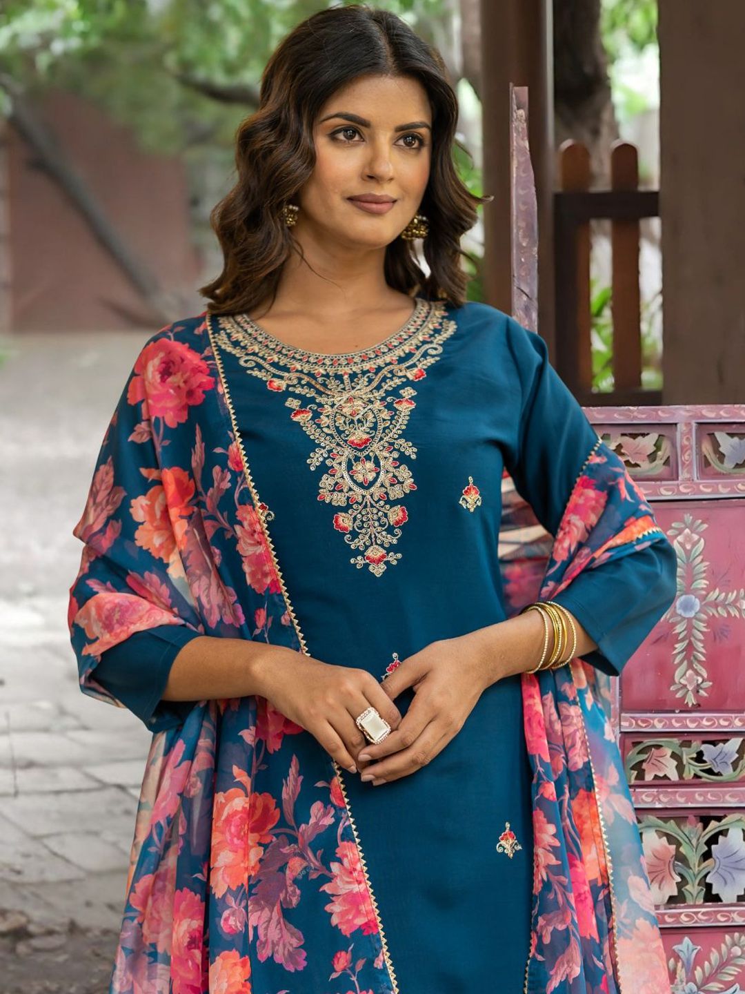 Navlik Floral Embroidered Round Neck Straight Thread Work Kurta With Trousers & Dupatta