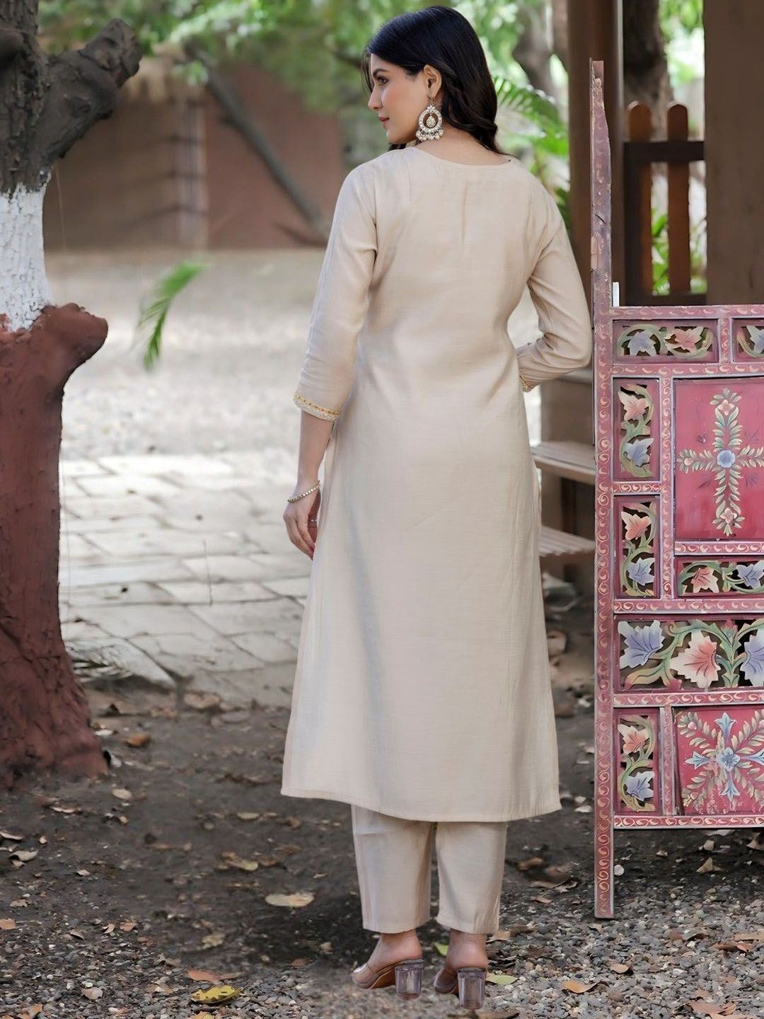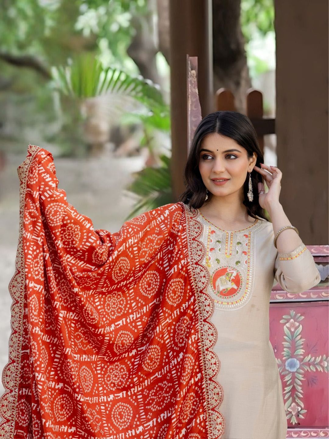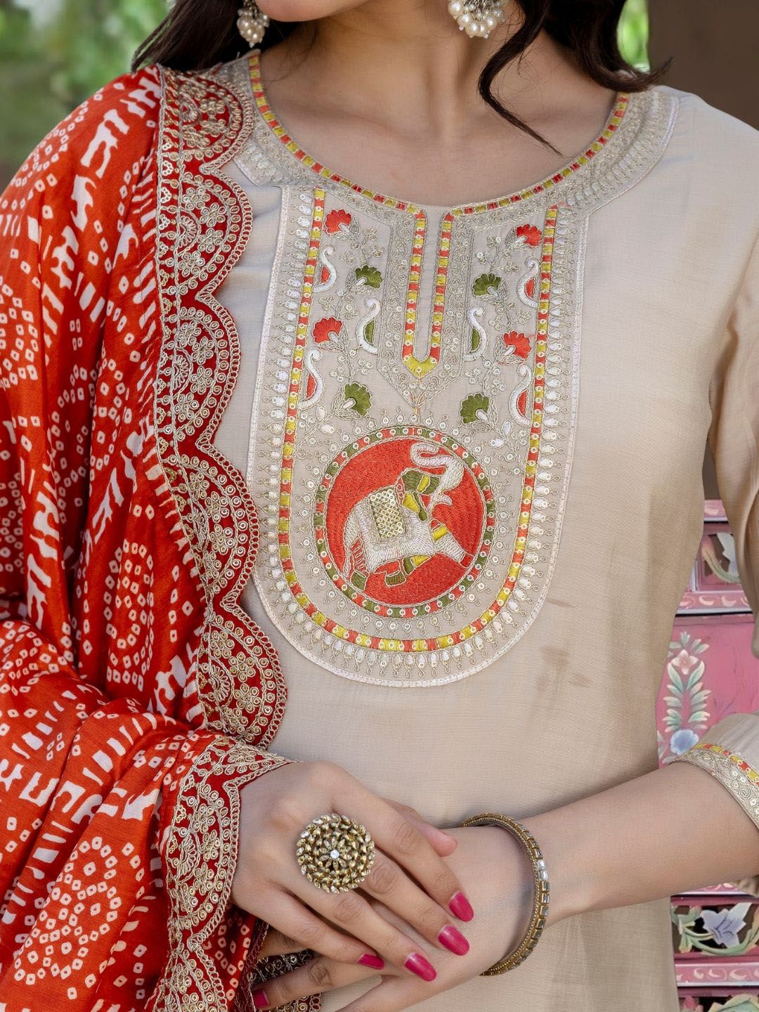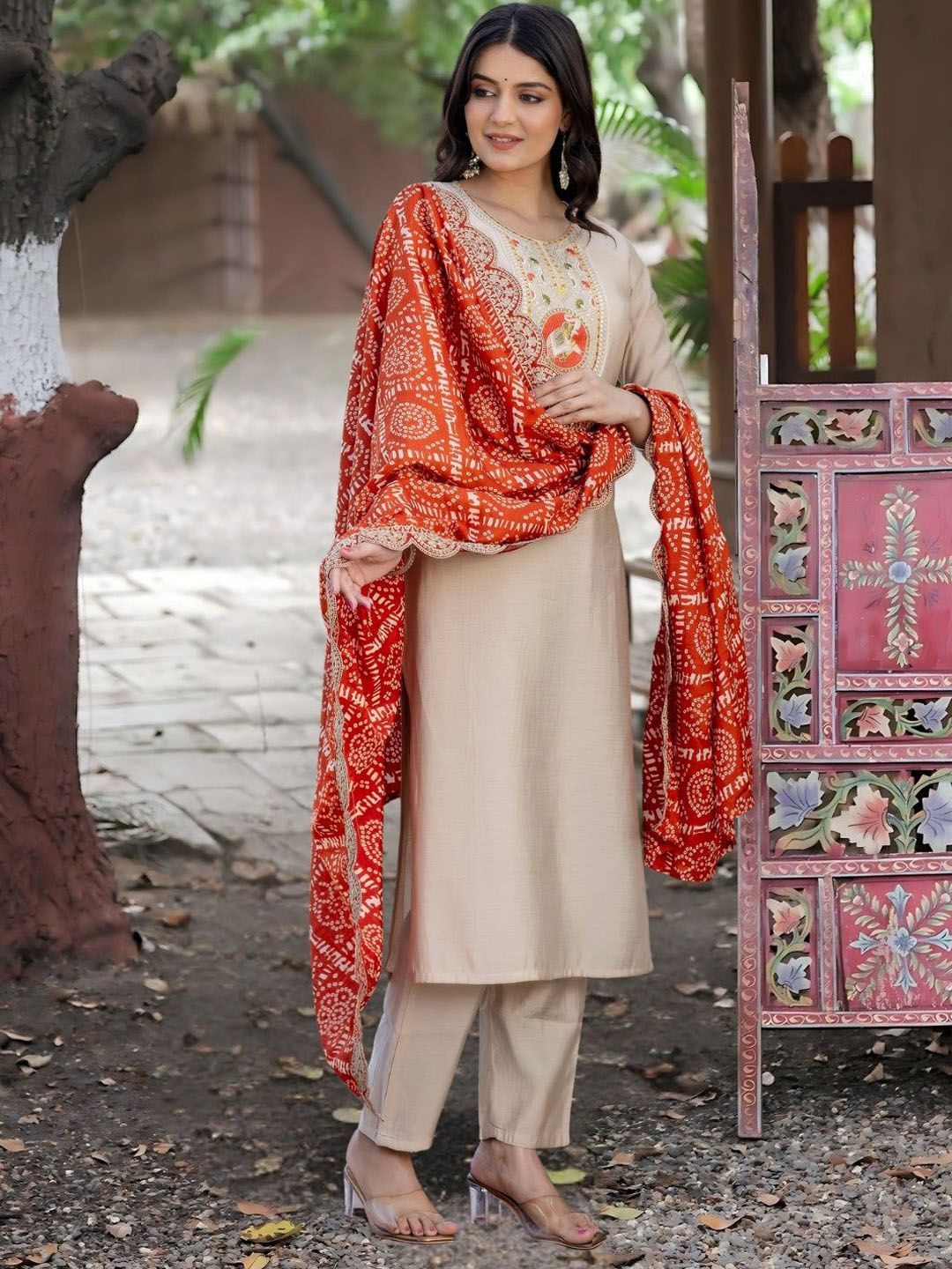 Navlik Floral Embroidered Round Neck Thread Work Kurta With Trousers & Dupatta