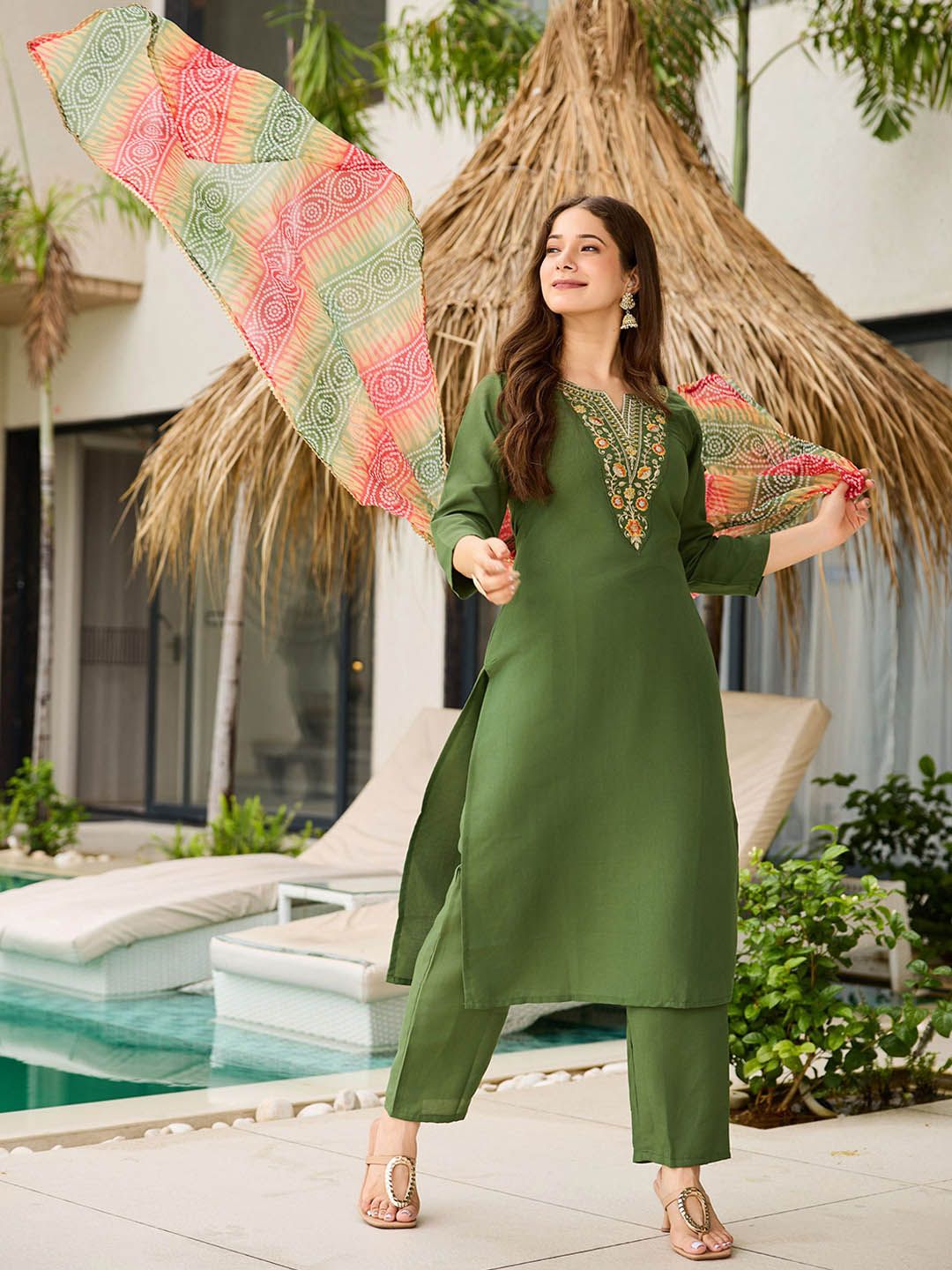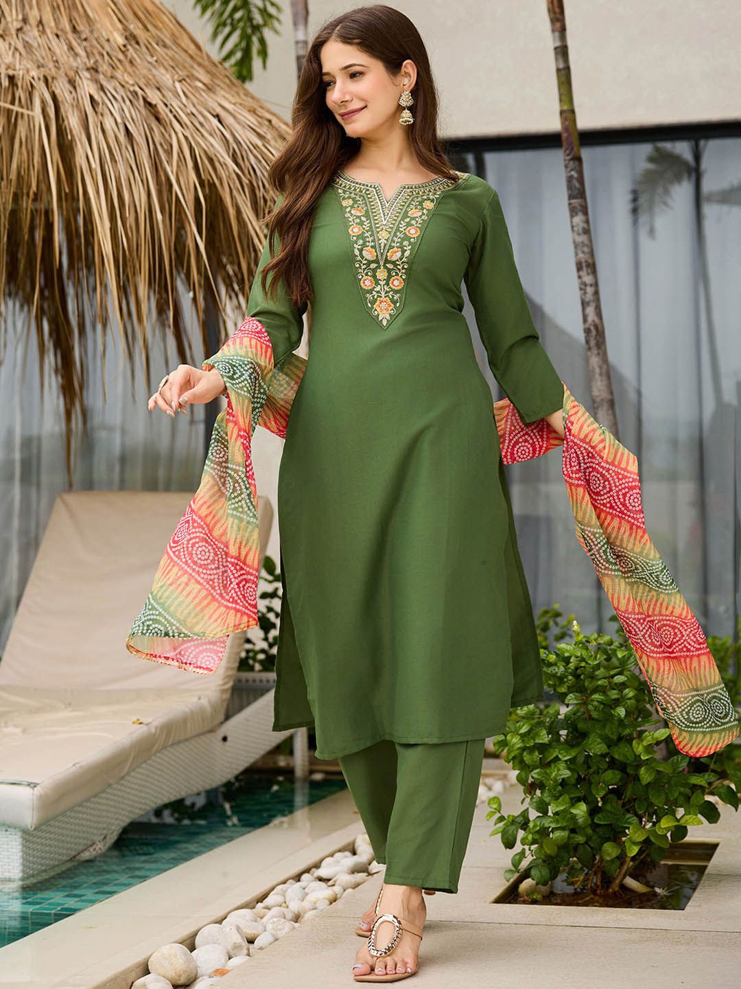 Navlik Floral Embroidered Thread Work Notch Neck Straight Kurta With Trousers & Dupatta