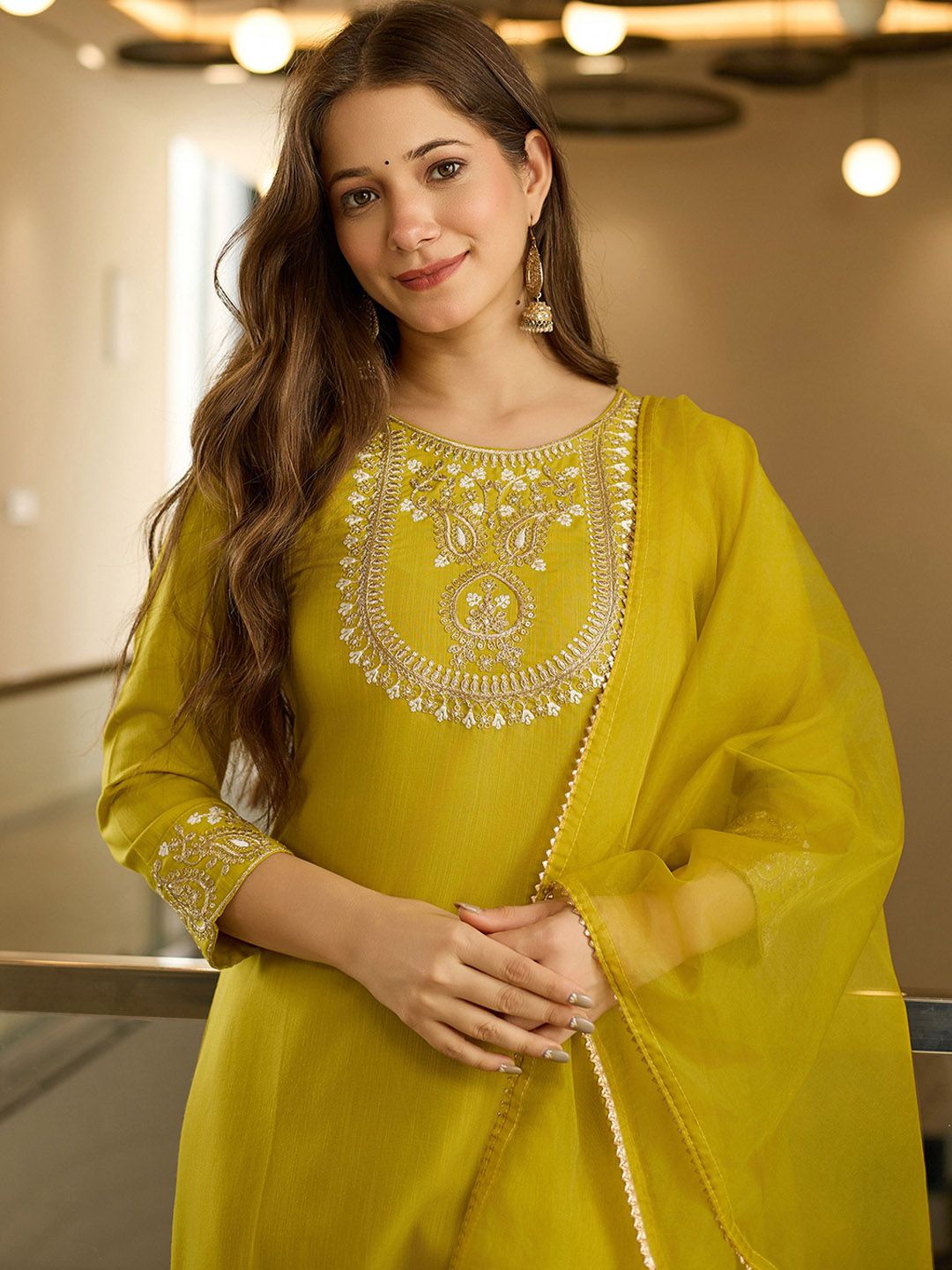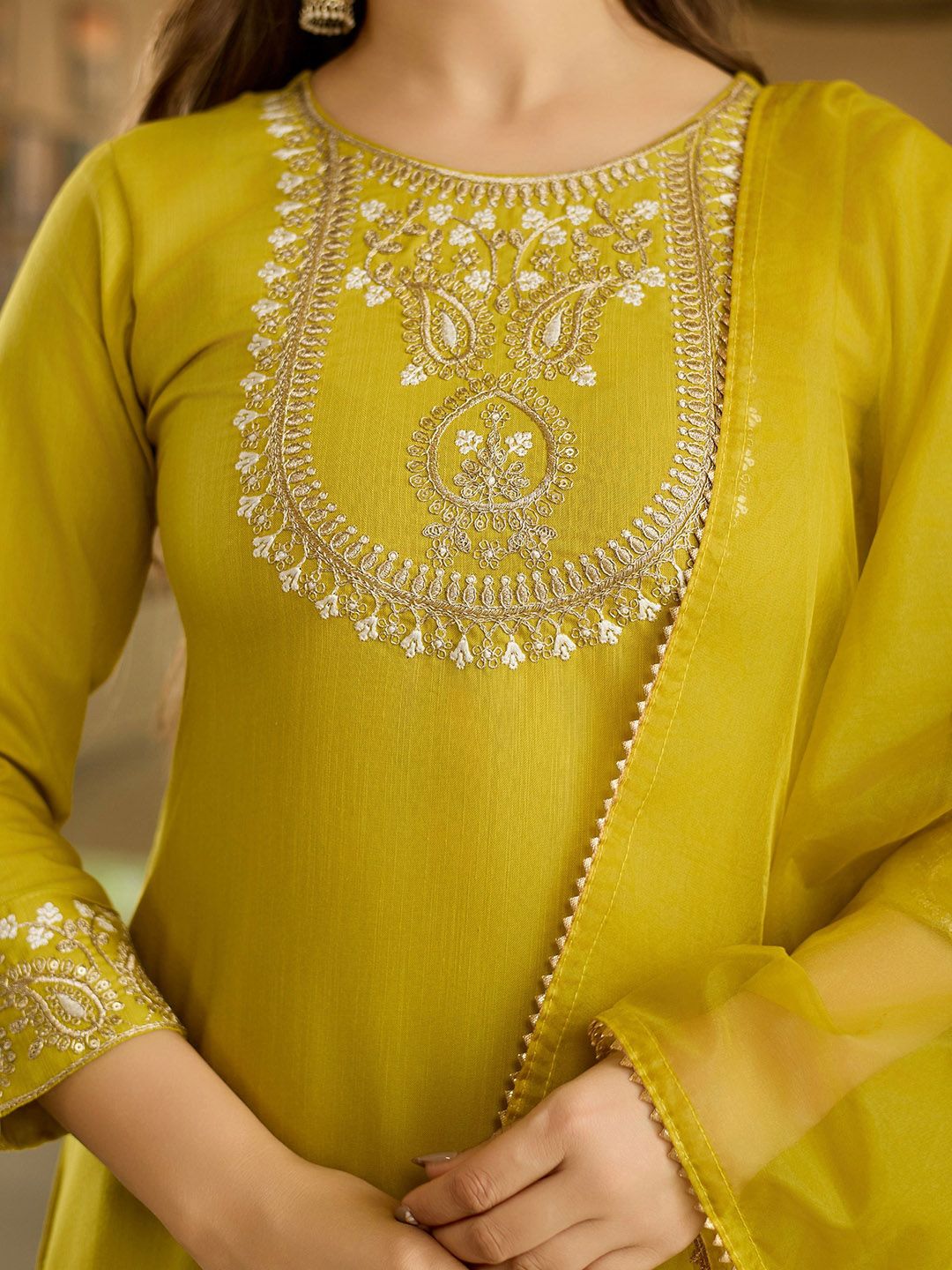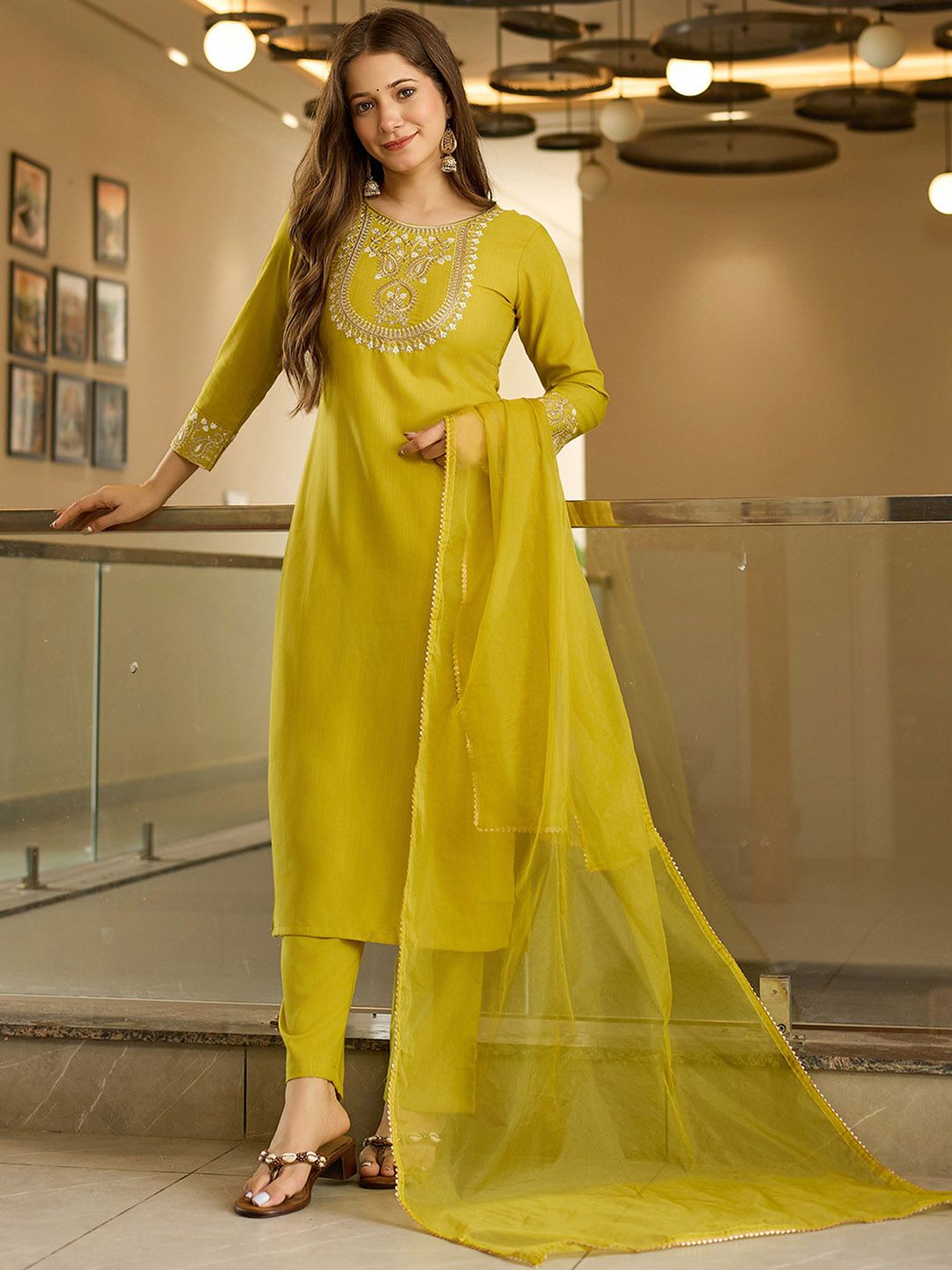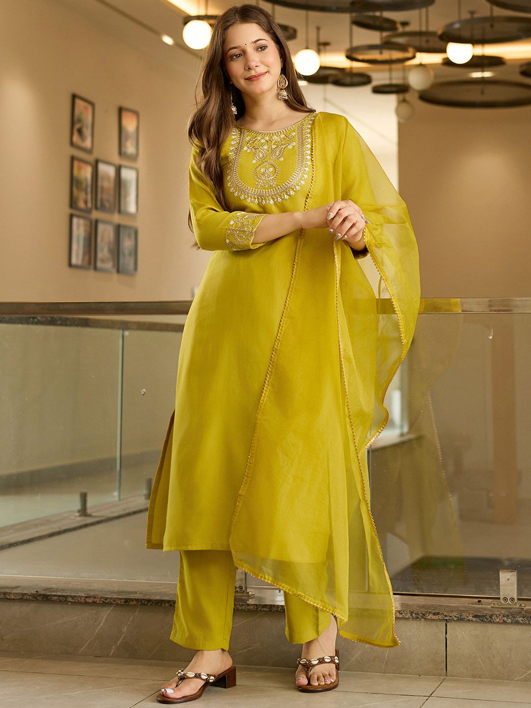 Navlik Floral Embroidered Thread Work Straight Kurta With Trousers And Dupatta
