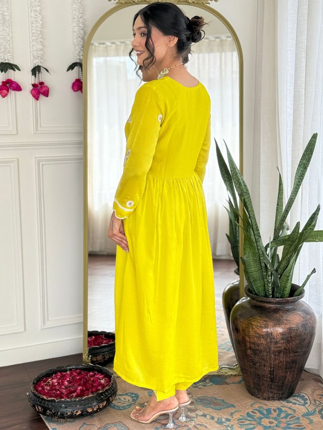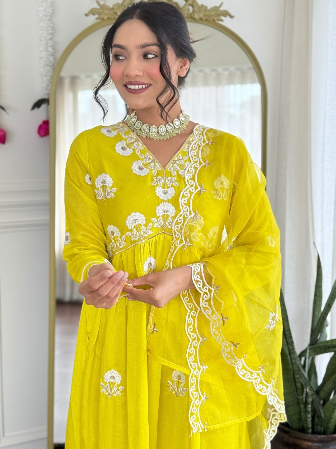 Navlik Floral Embroidered V-Neck Empire Thread Work Anarkali Kurta With Trousers & Dupatta