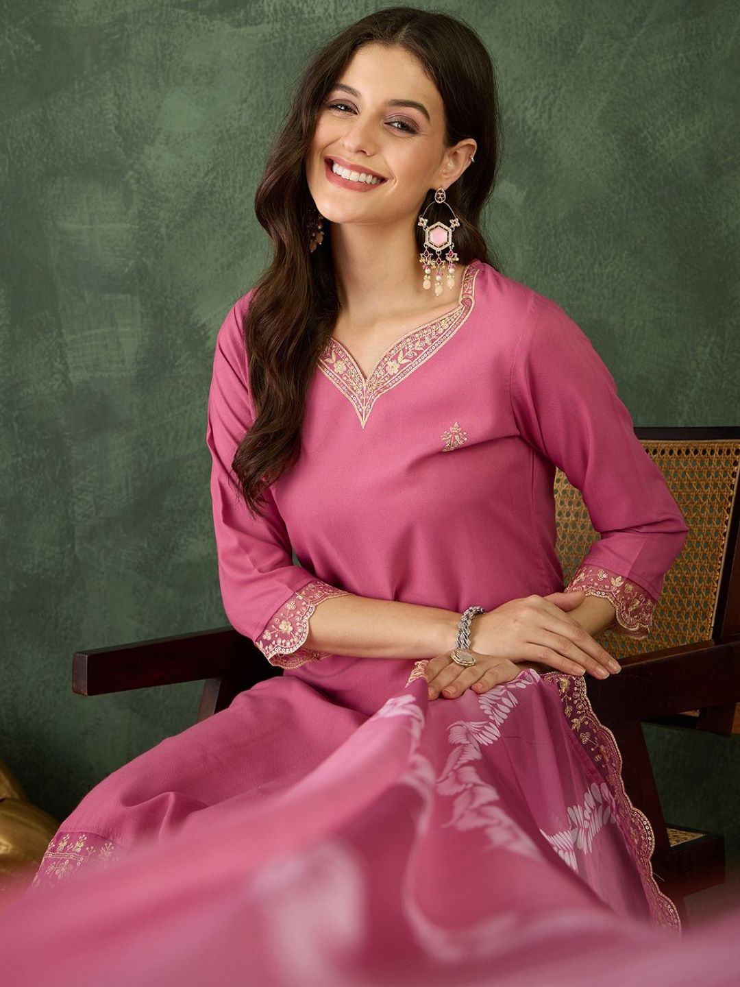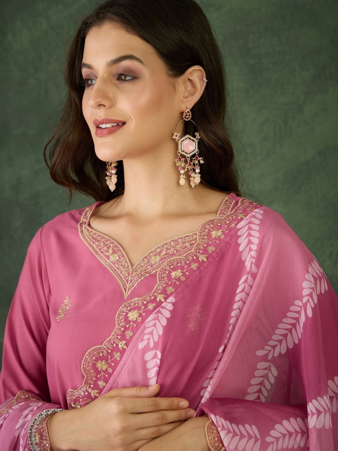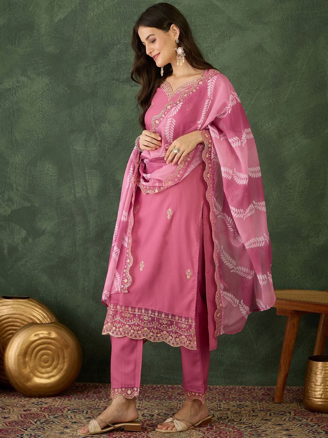 Navlik Floral Embroidered V-Neck Thread Work Kurta With Trousers And Dupatta
