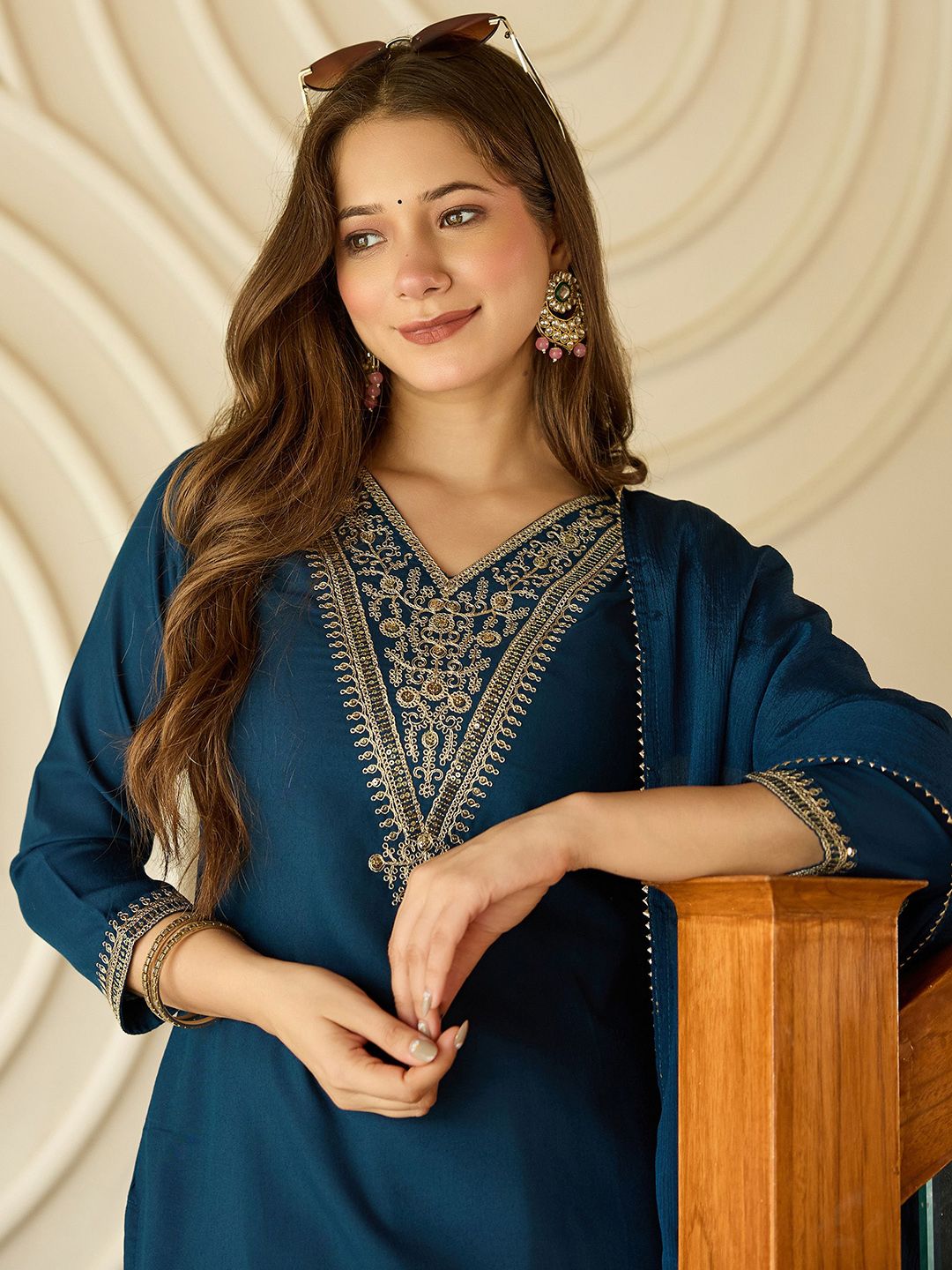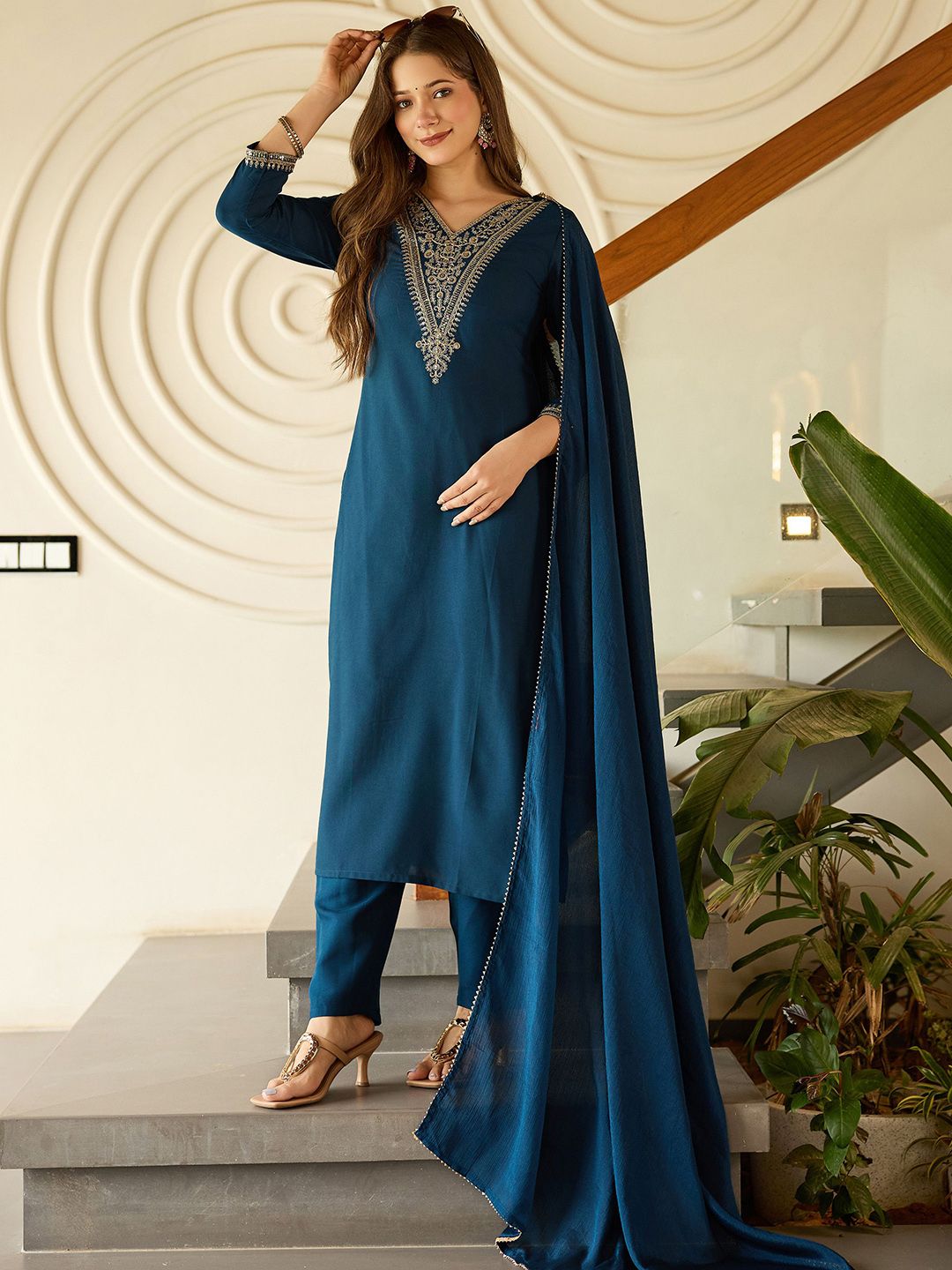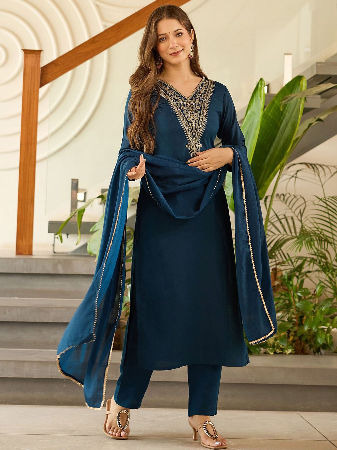 Navlik Floral Embroidered V-Neck Thread Work Straight Kurta With Trousers And Dupatta