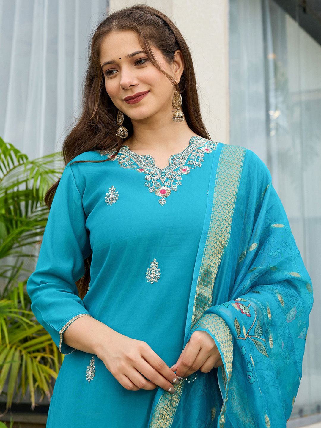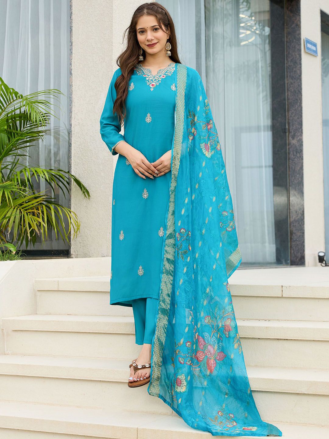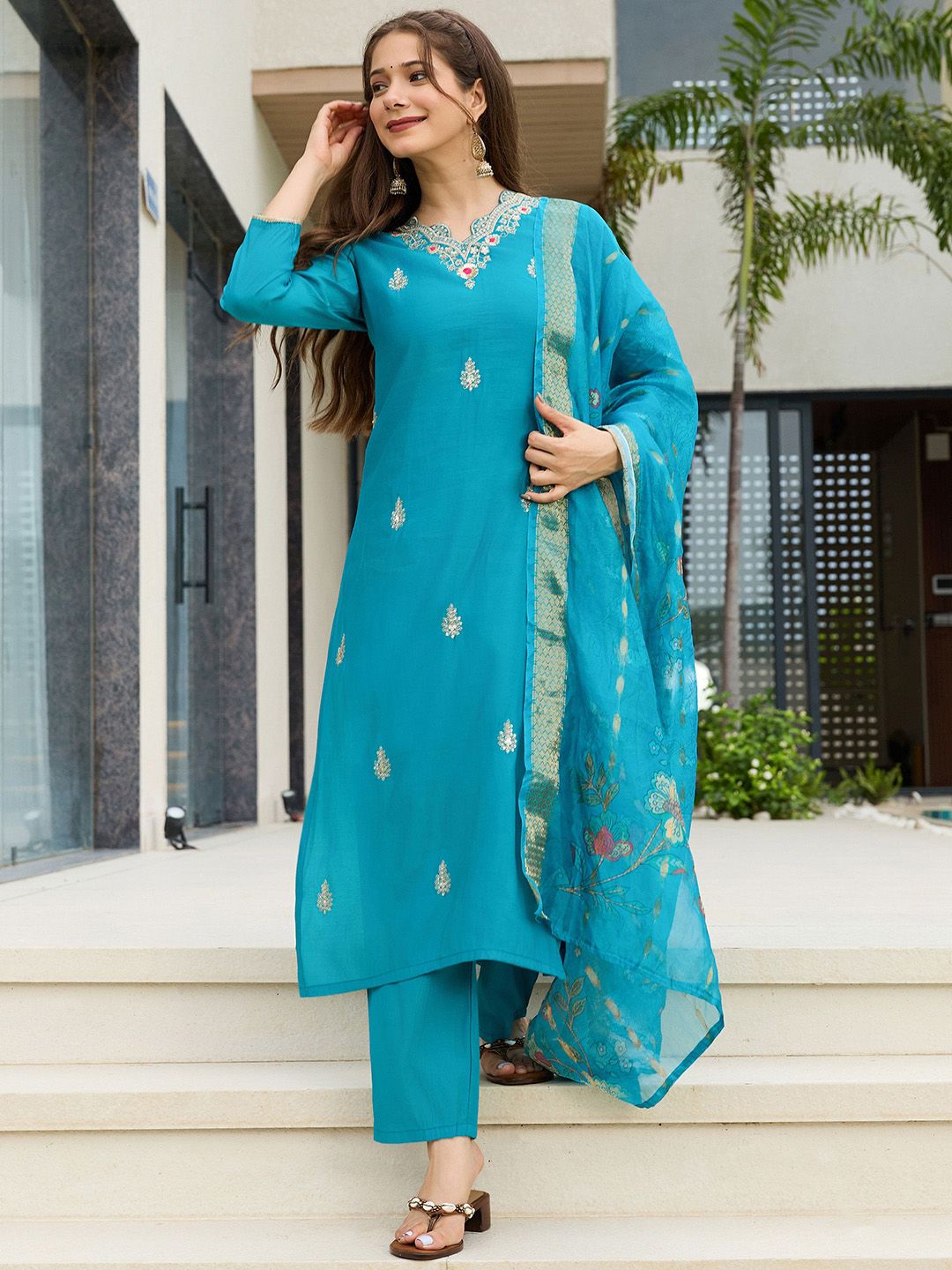 Navlik Floral Embroidered V-Neck Thread Work Straight Kurta With Trousers And Dupatta