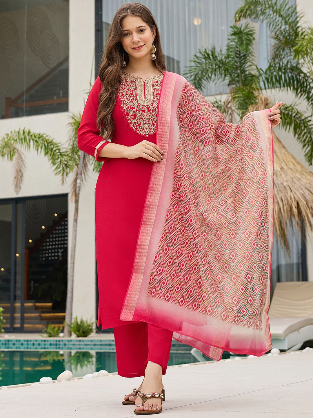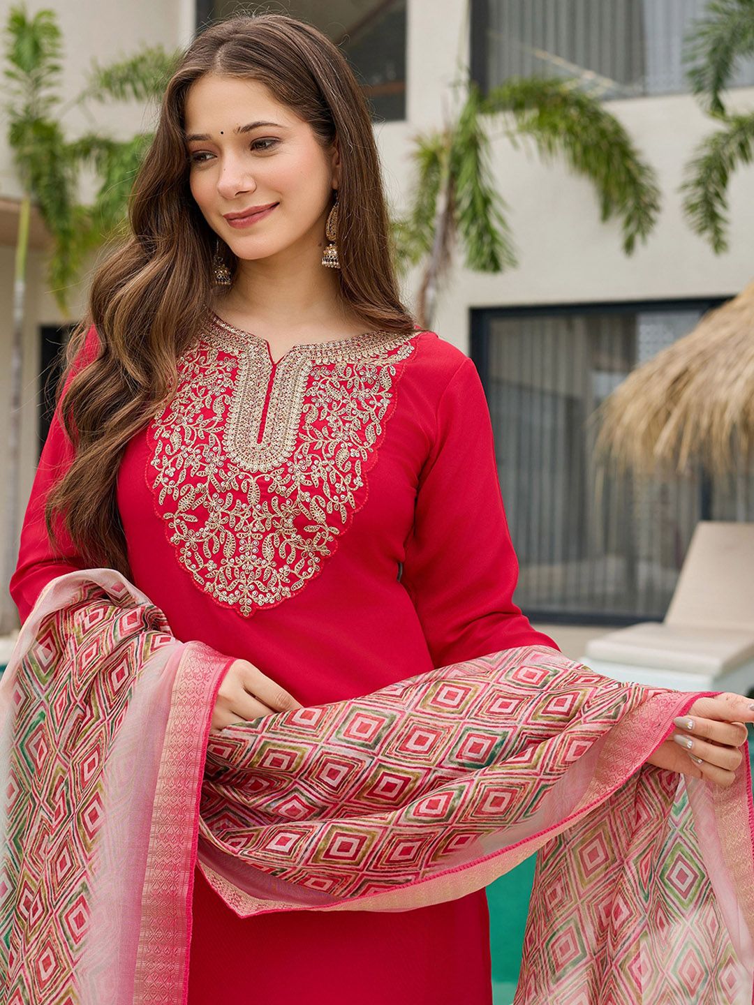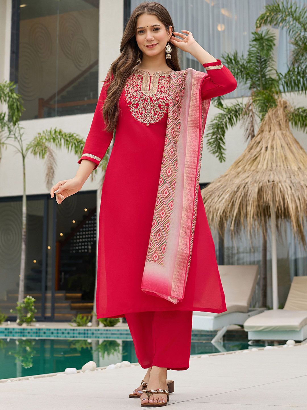 Navlik Women Ethnic Motifs Yoke Design Thread Work Kurta With Trousers & Dupatta
