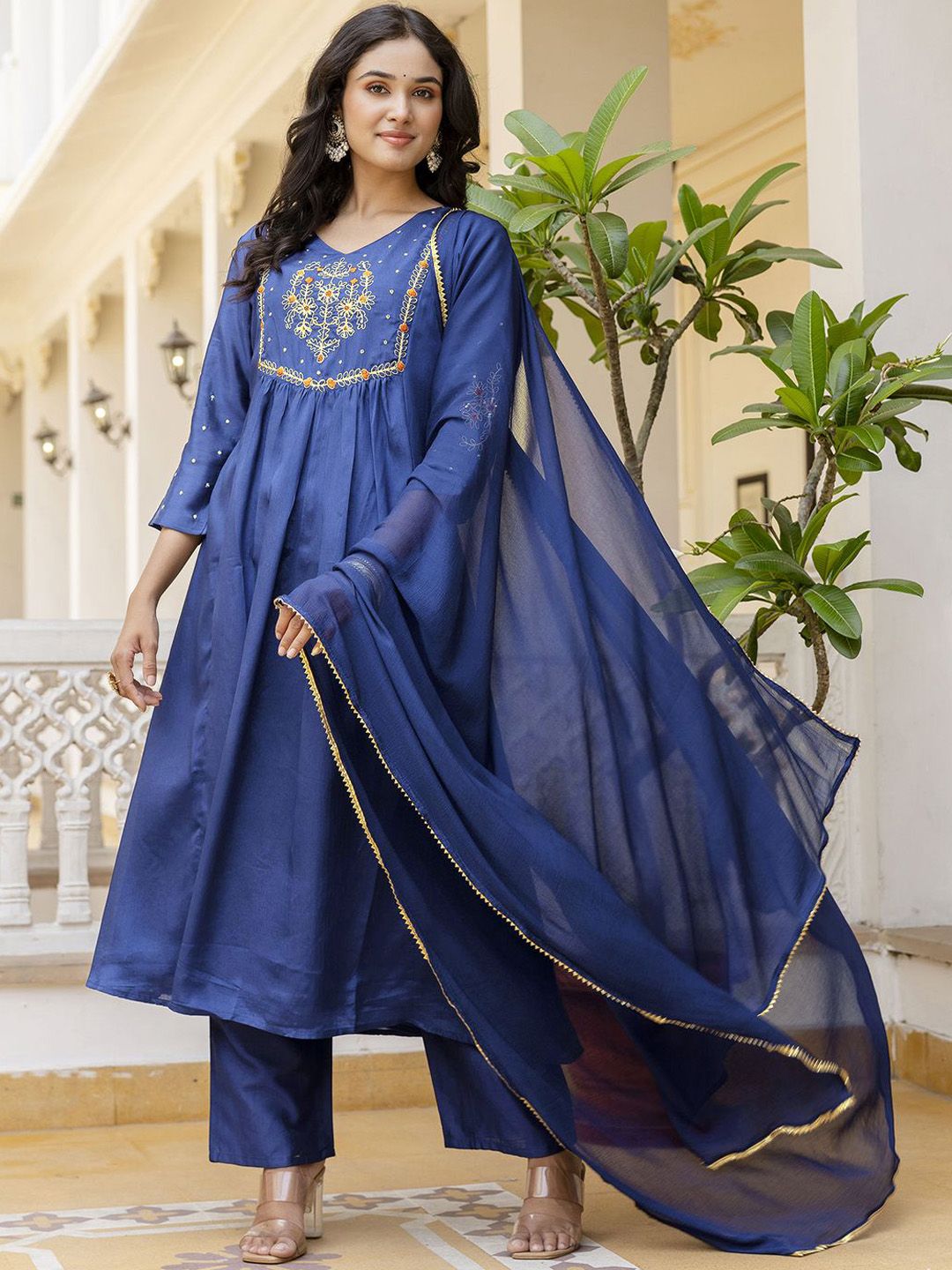 Navlik Women Floral Embroidered Thread Work Kurta with Trousers & With Dupatta
