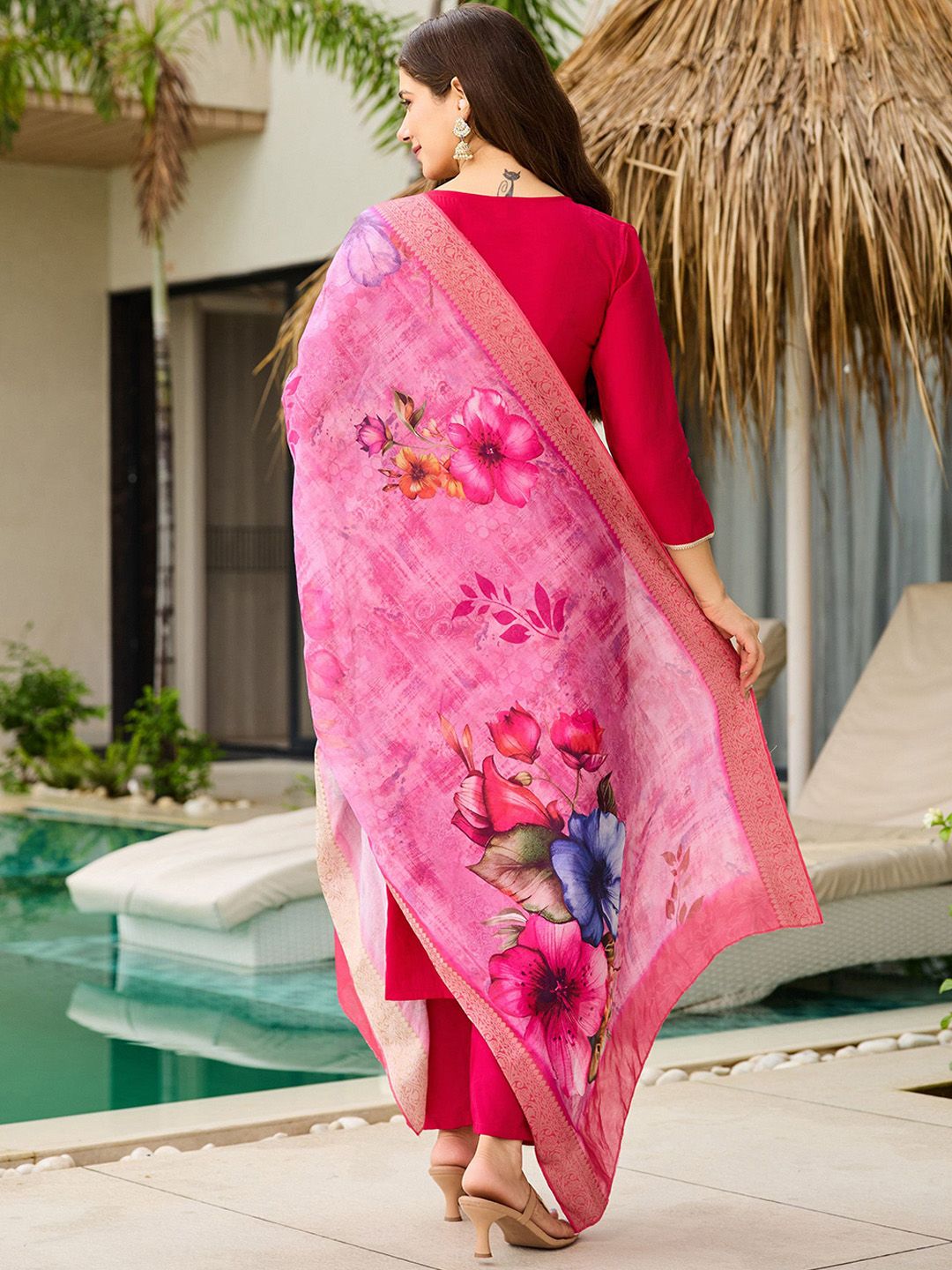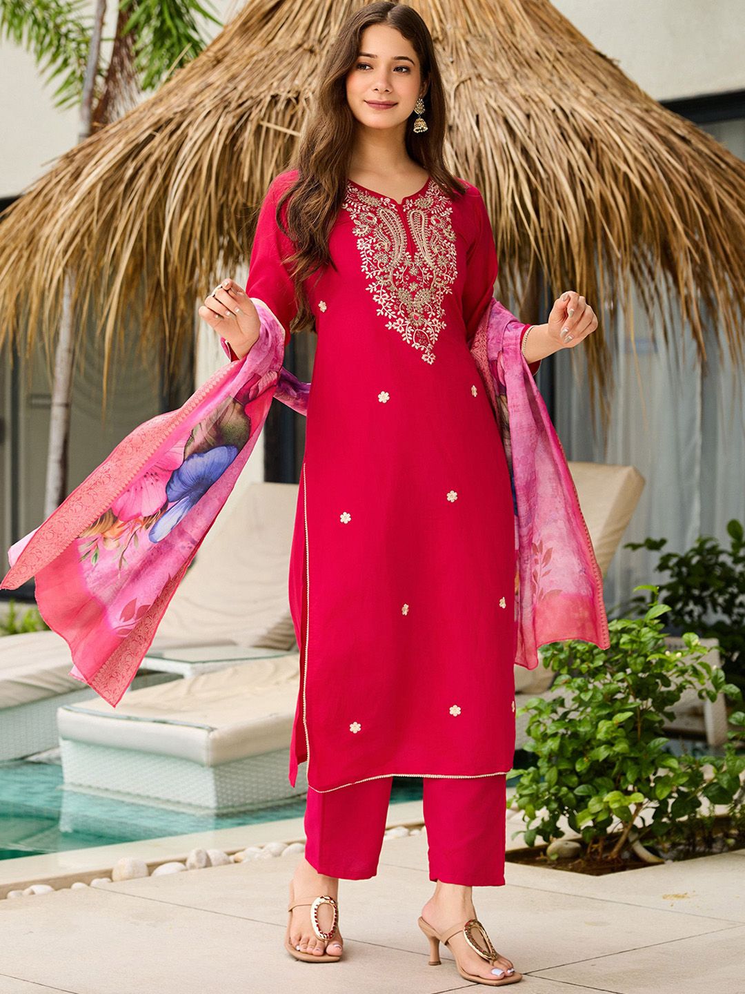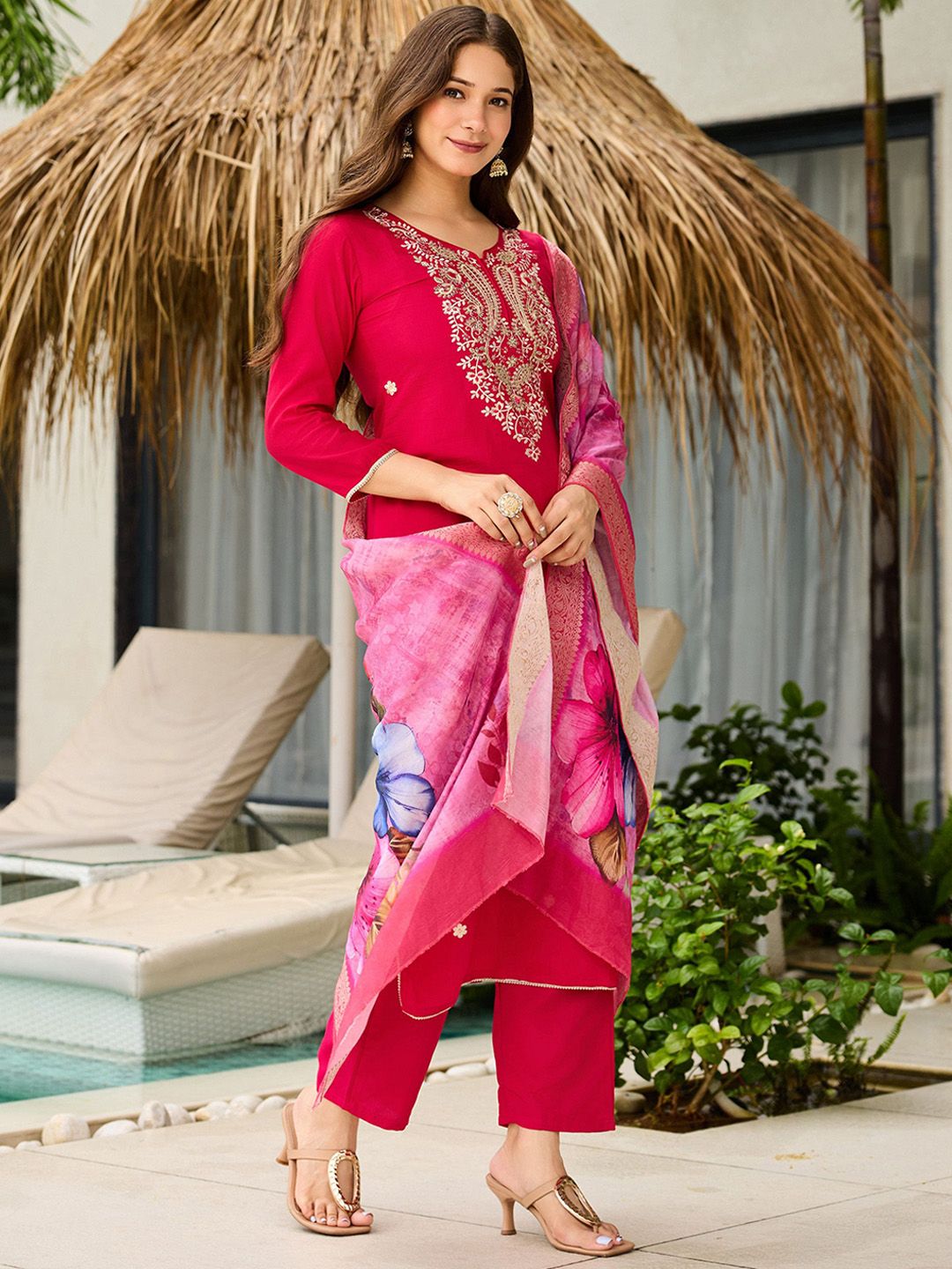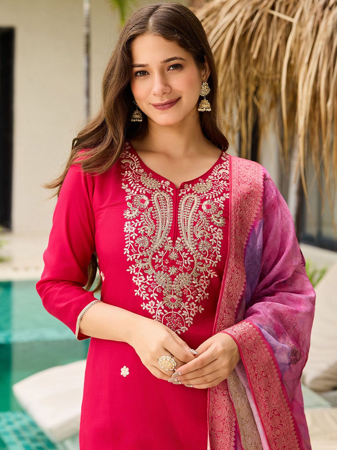 Navlik Women Paisley Embroidered Thread Work Straight Kurta with Trousers & Dupatta