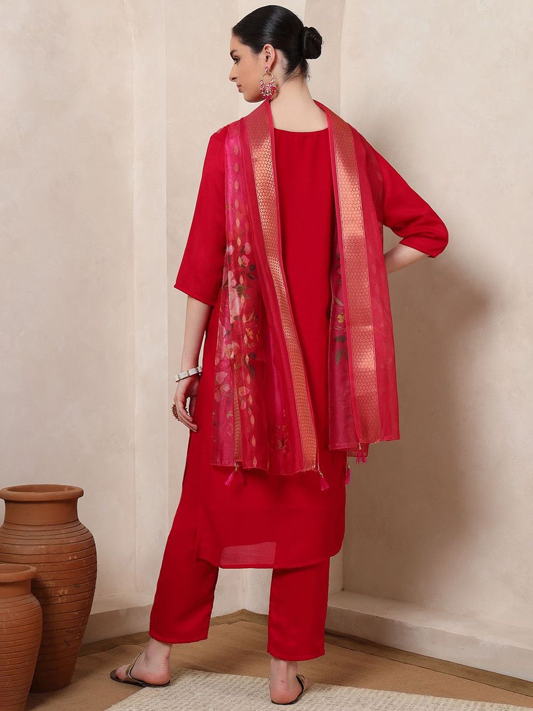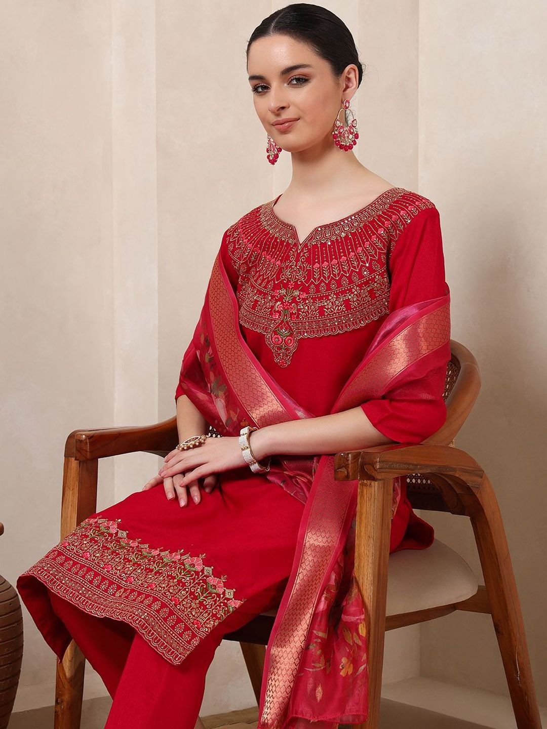 Nehamta Ethnic Motifs Printed Round Neck Straight Sequinned Kurta With Trousers & Dupatta