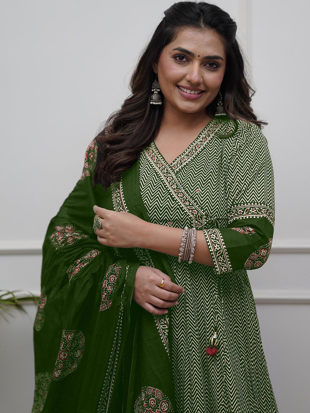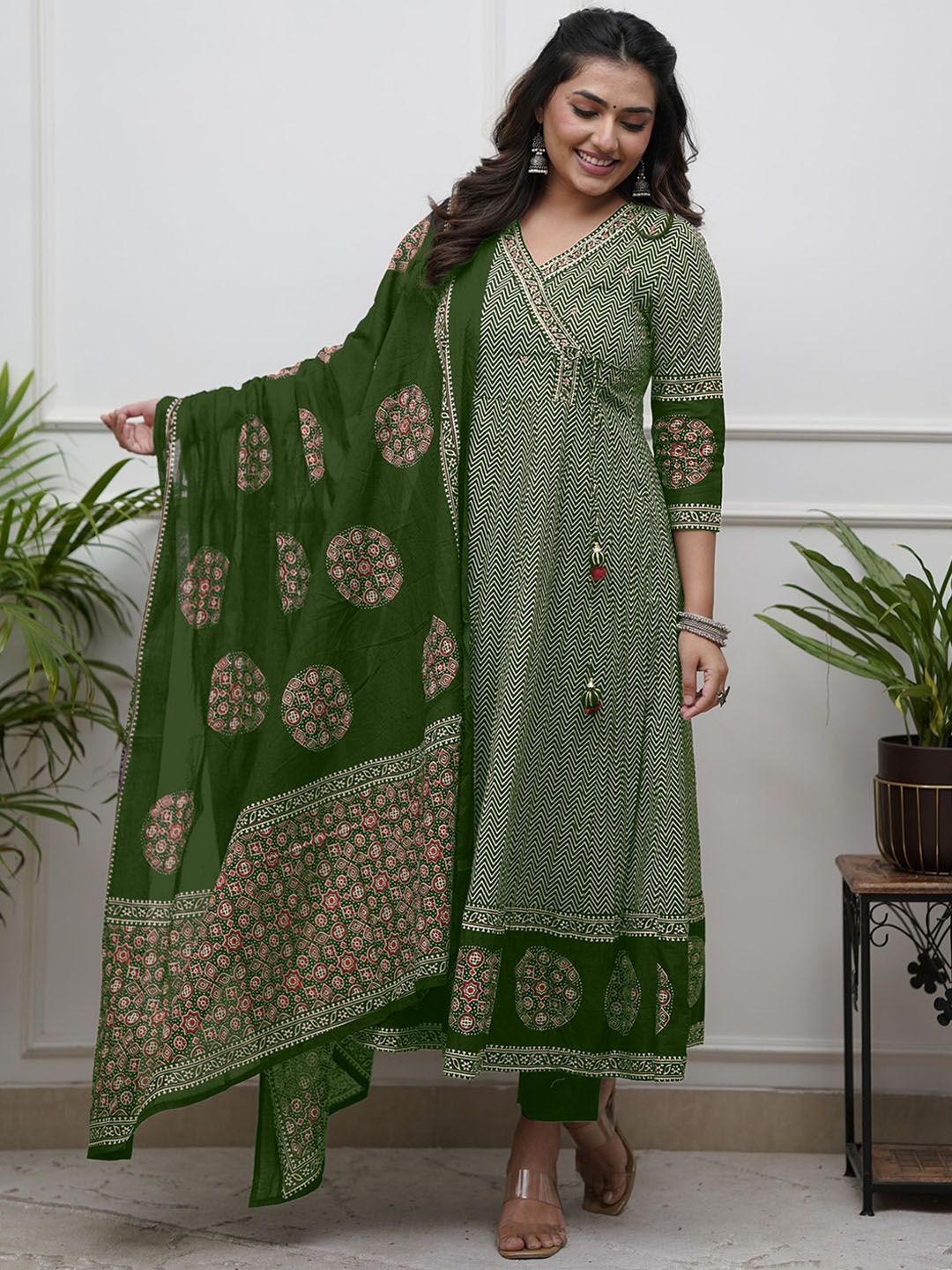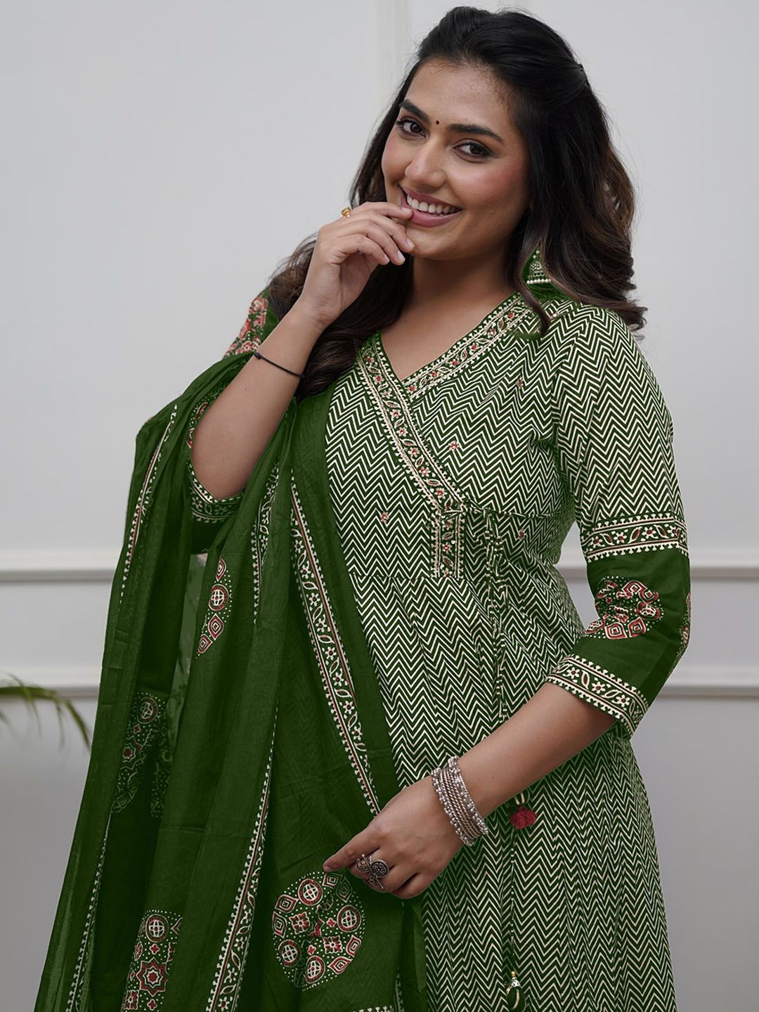 NIZA FASHION Chevron Printed V Neck Anarkali Pure Cotton Kurta With Trousers & Dupatta