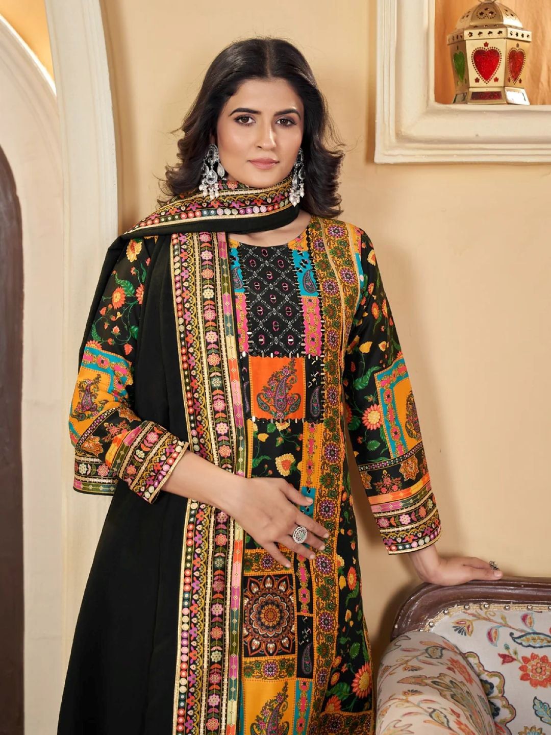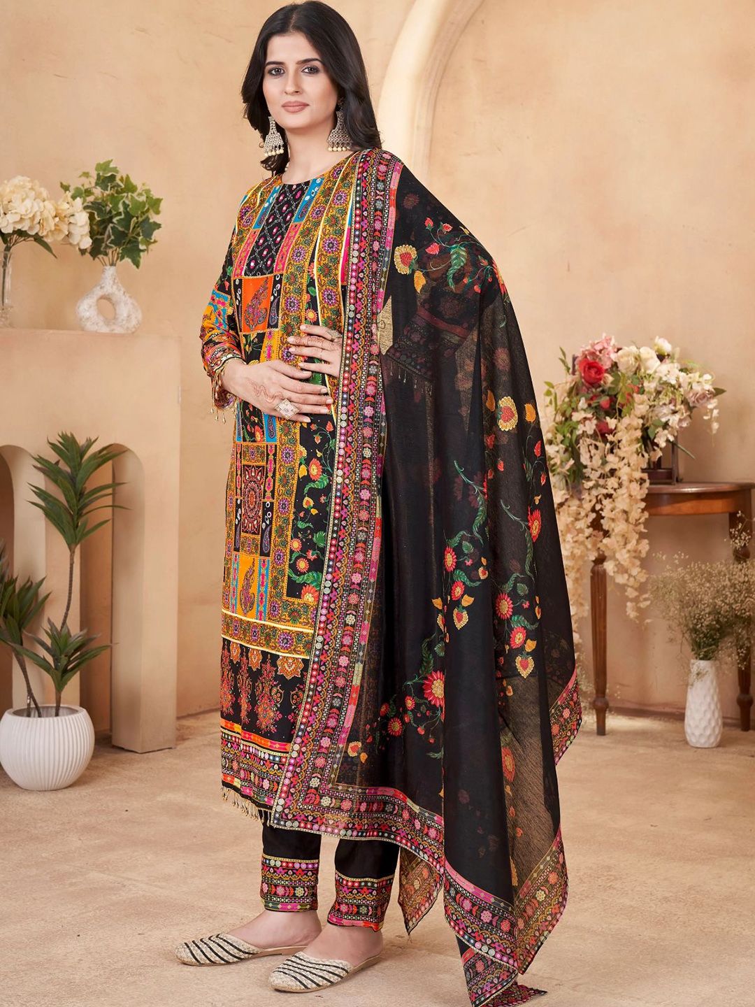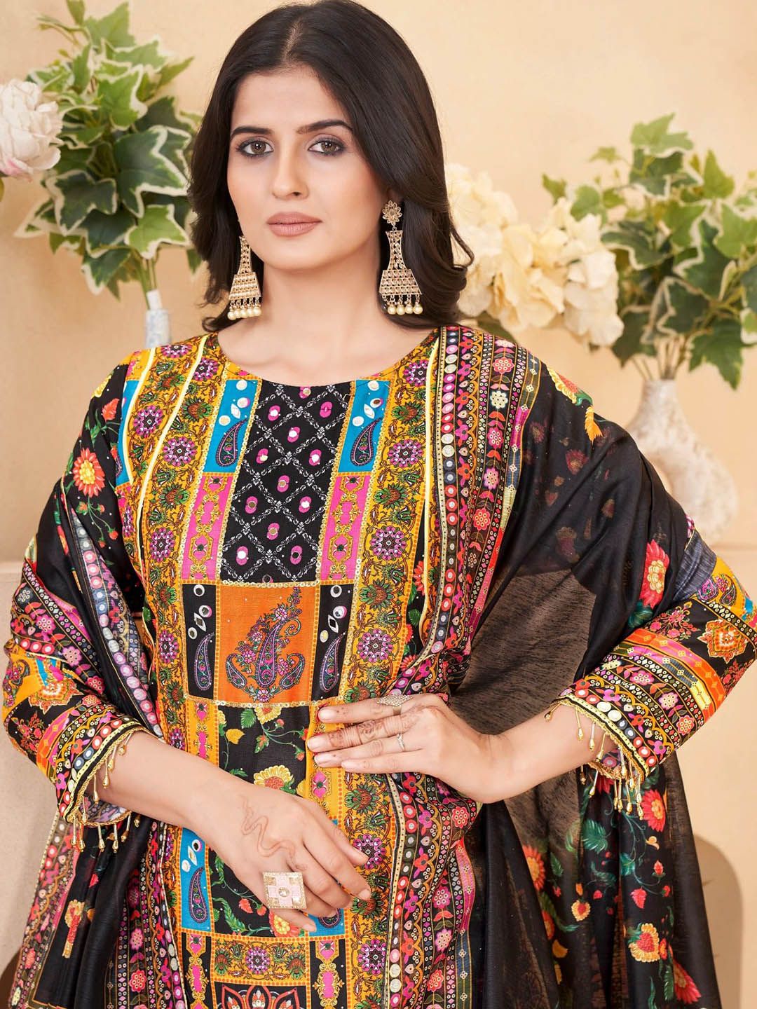 NKV Floral Printed Round Neck Straight Mirror Work Kurta With Trousers & Dupatta