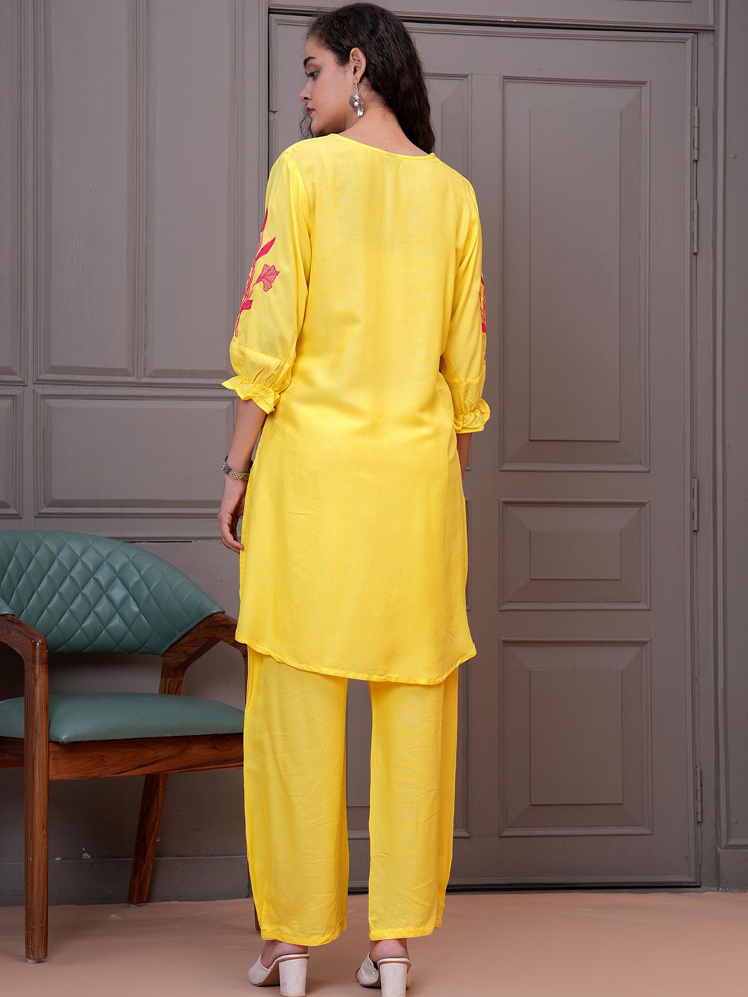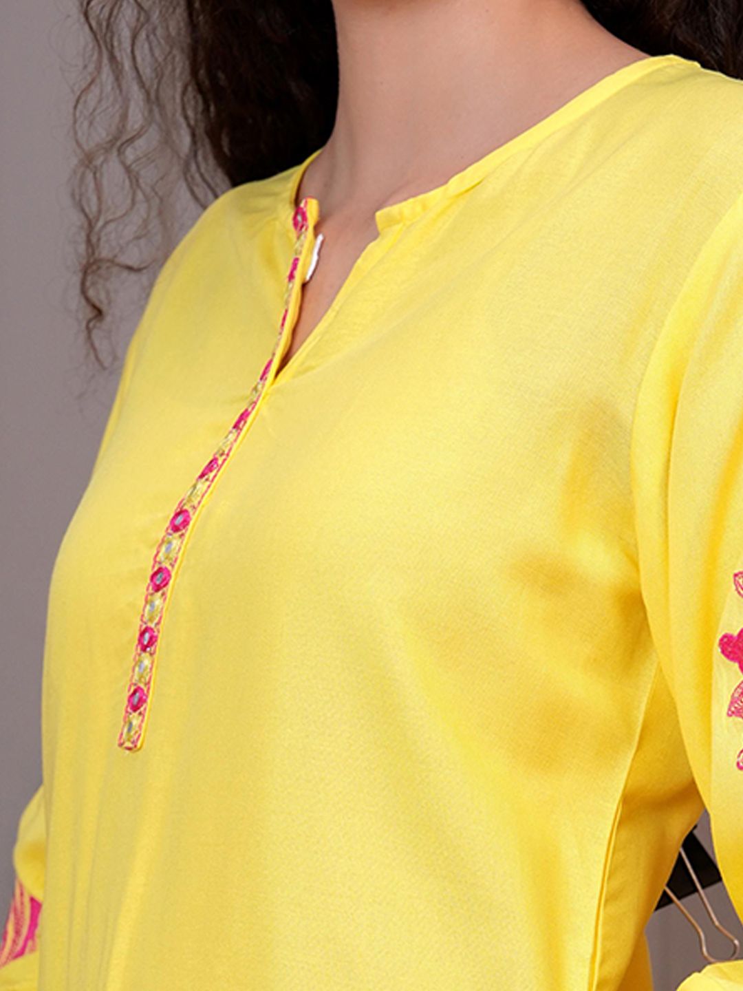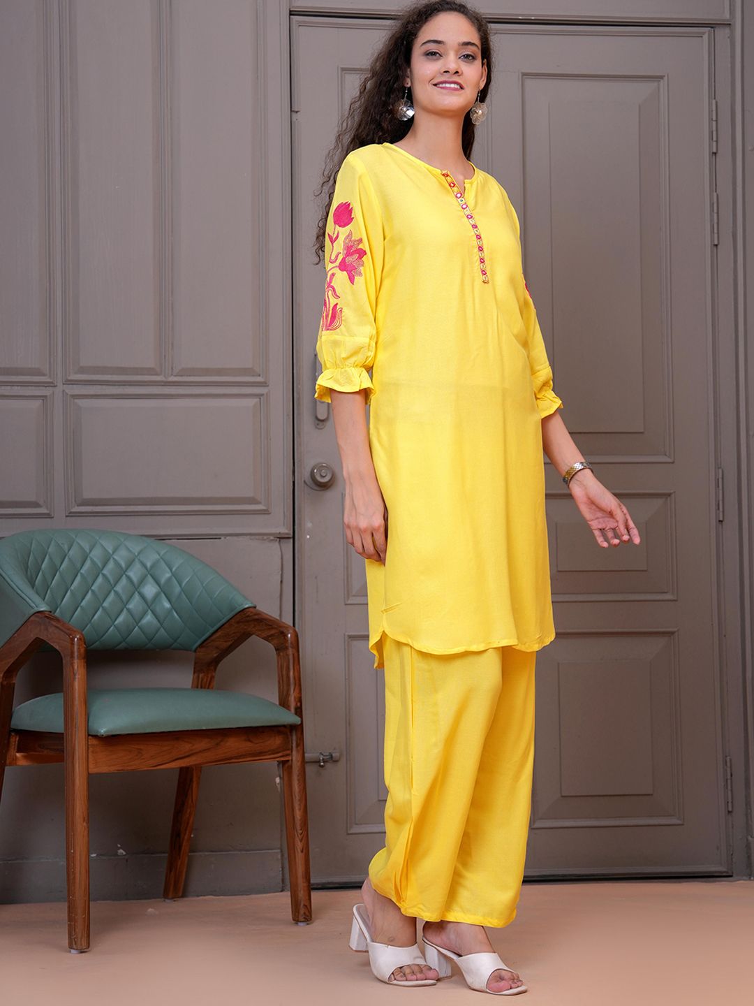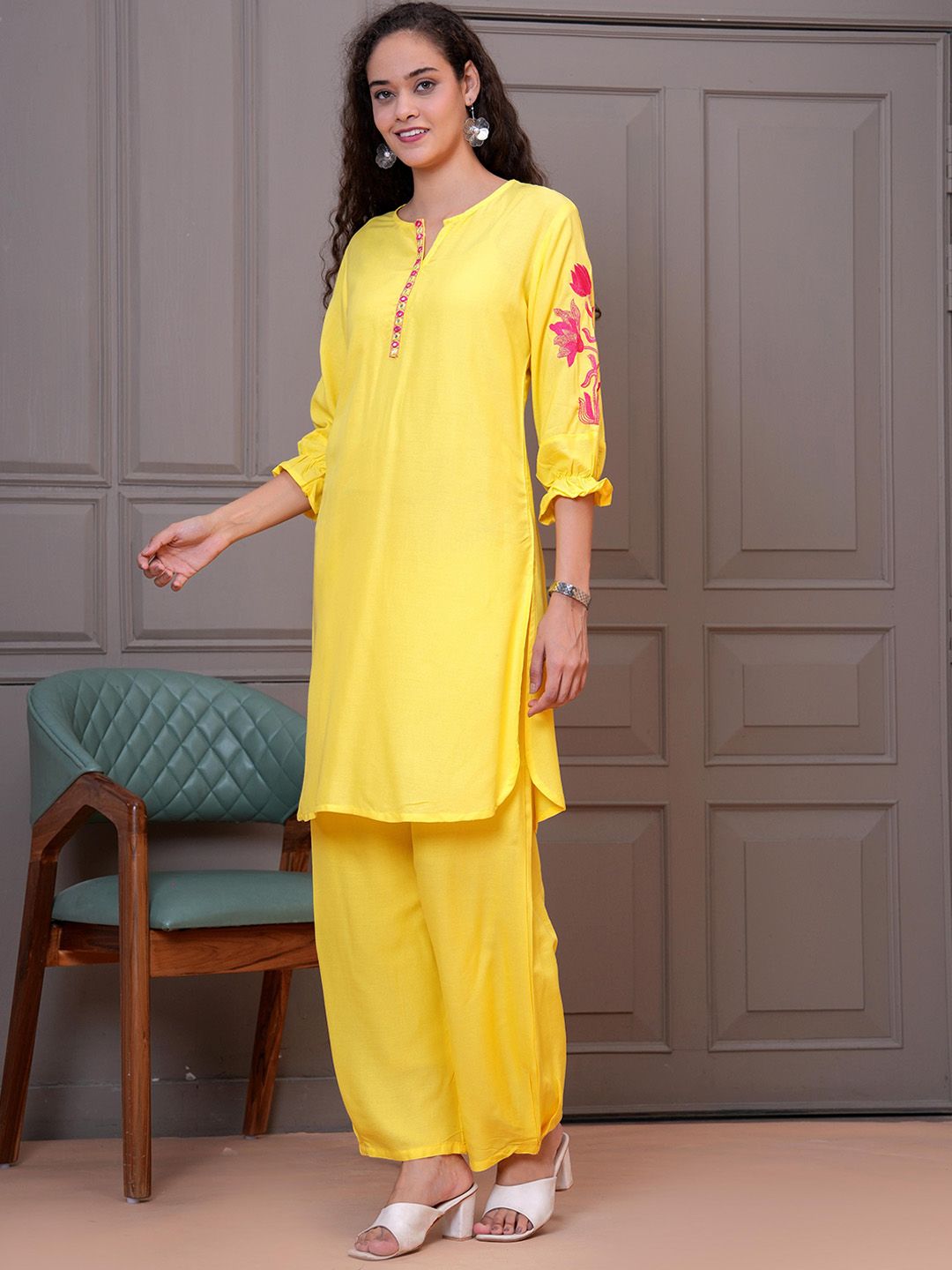 OH MI DIOS Floral Embroidered Notch Neck Thread Work Straight Kurta With Trousers