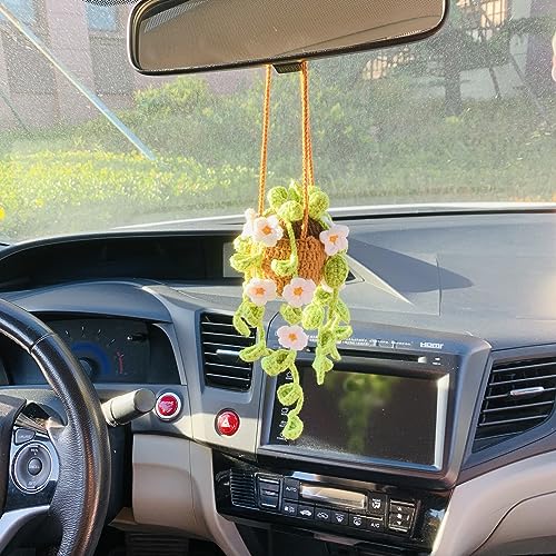 OnEternal Handmade Crochet Cute Plants Car Mirror Hanging Accessories Knitted Rear View Mirror Accessories Interior Aesthetic for Women Men (White Flower - Brown Basin)