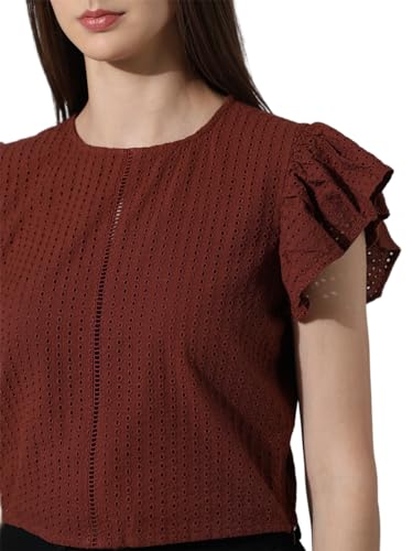 ONLY Women Pure Cotton Slim Self Design Flutter Sleeves Schiffli Top