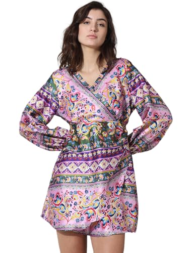ONLY Womens Abstract Printed Satin Dress | Wrapopever V-Neckline | Balloon Cuff Sleeves