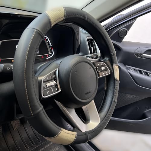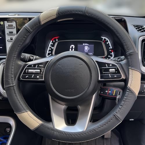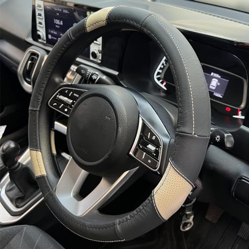 Oshotto SC-011-A Leather Car Steering Cover Black, Beige Colour Compatible with Hyundai i20 Elite 2014-2020