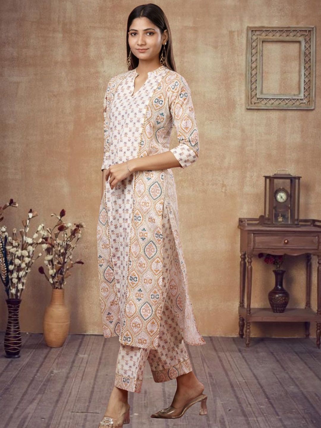 OZIA Ethnic Motifs Printed Mandarin Collar Straight Gotta Patti Kurta With Trousers