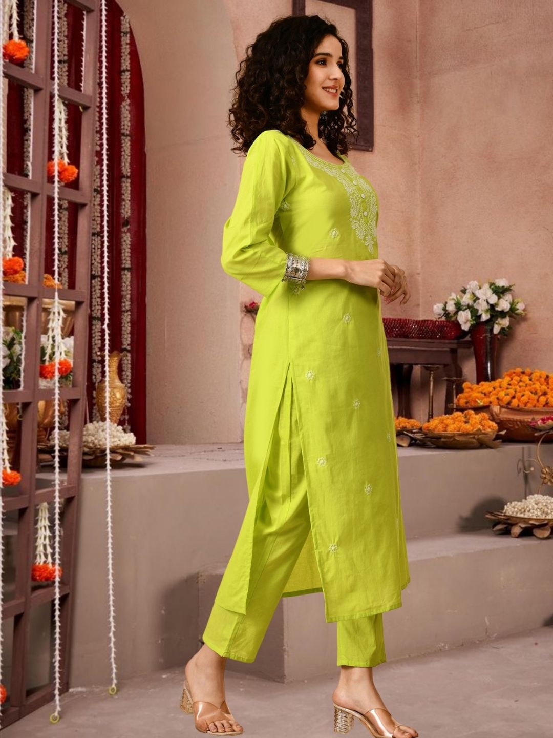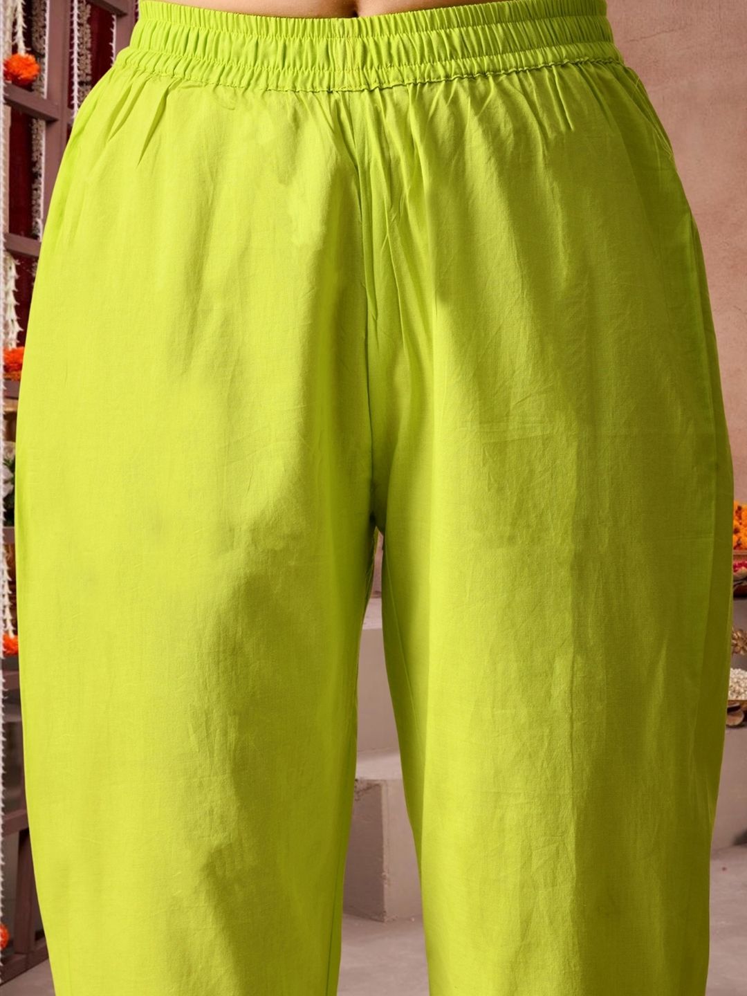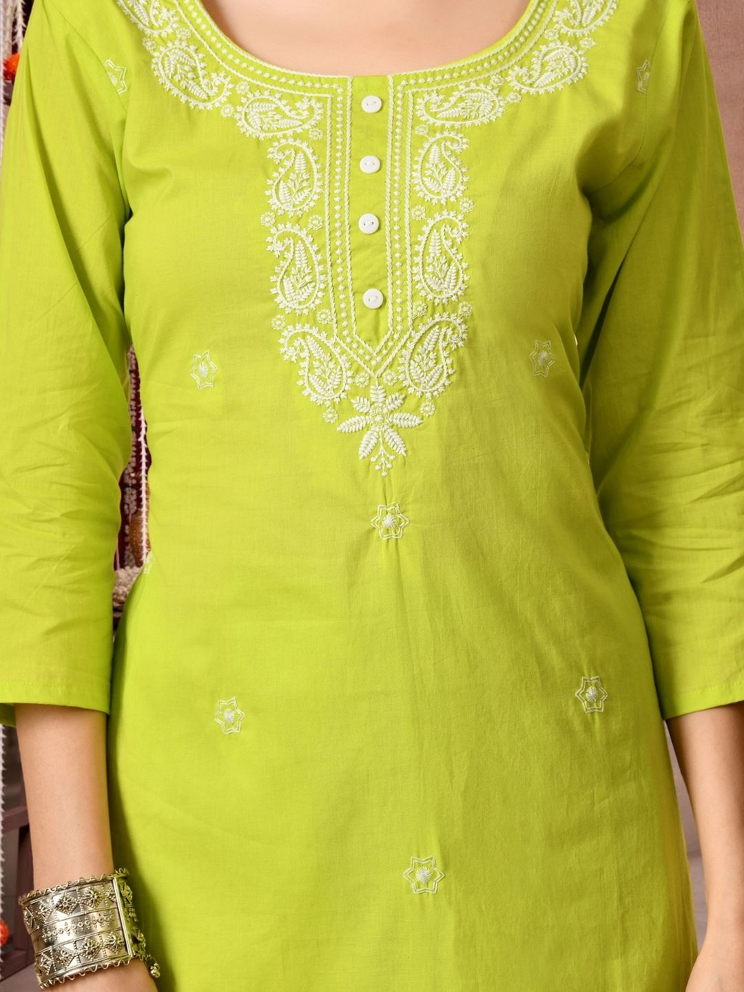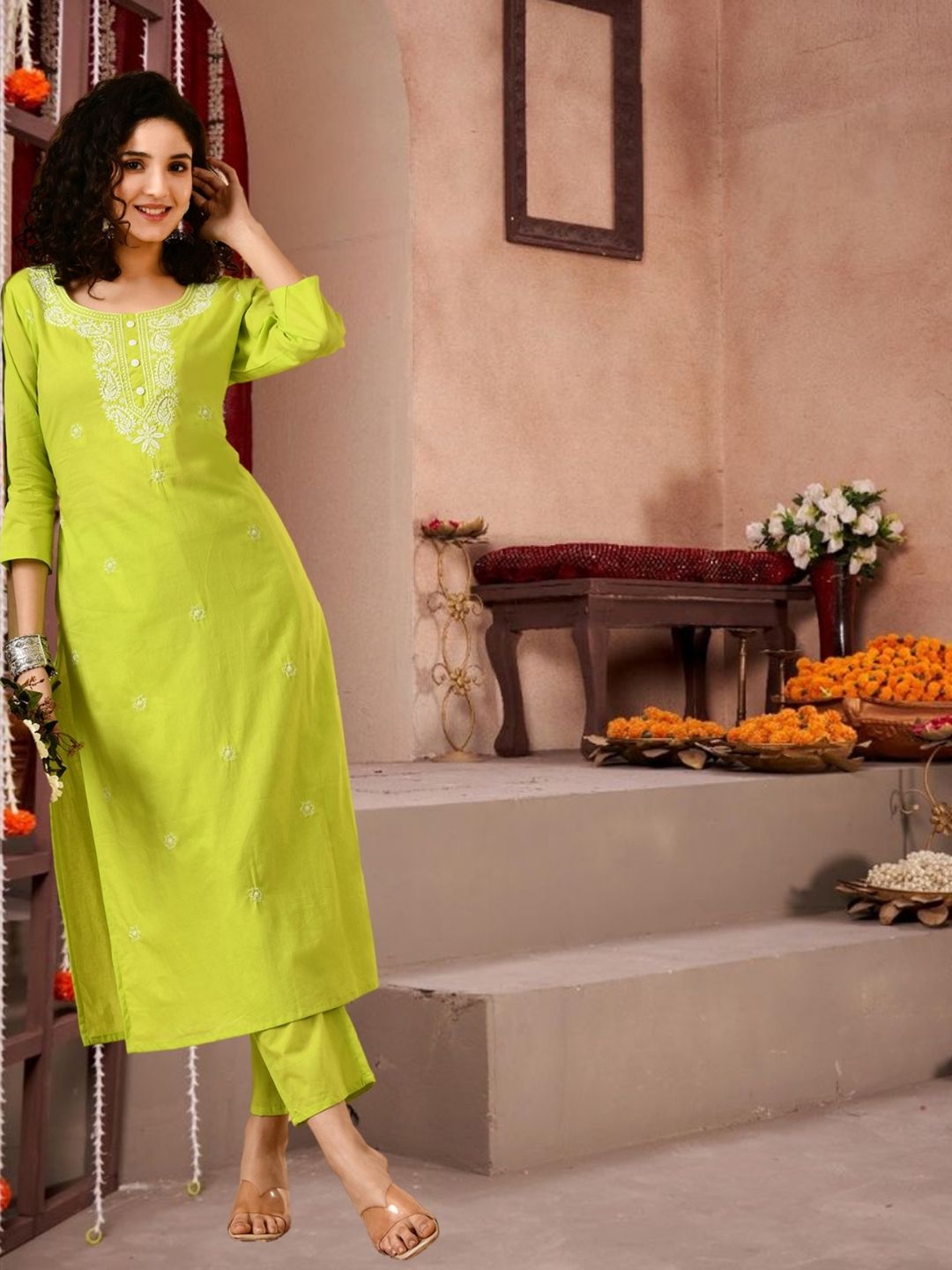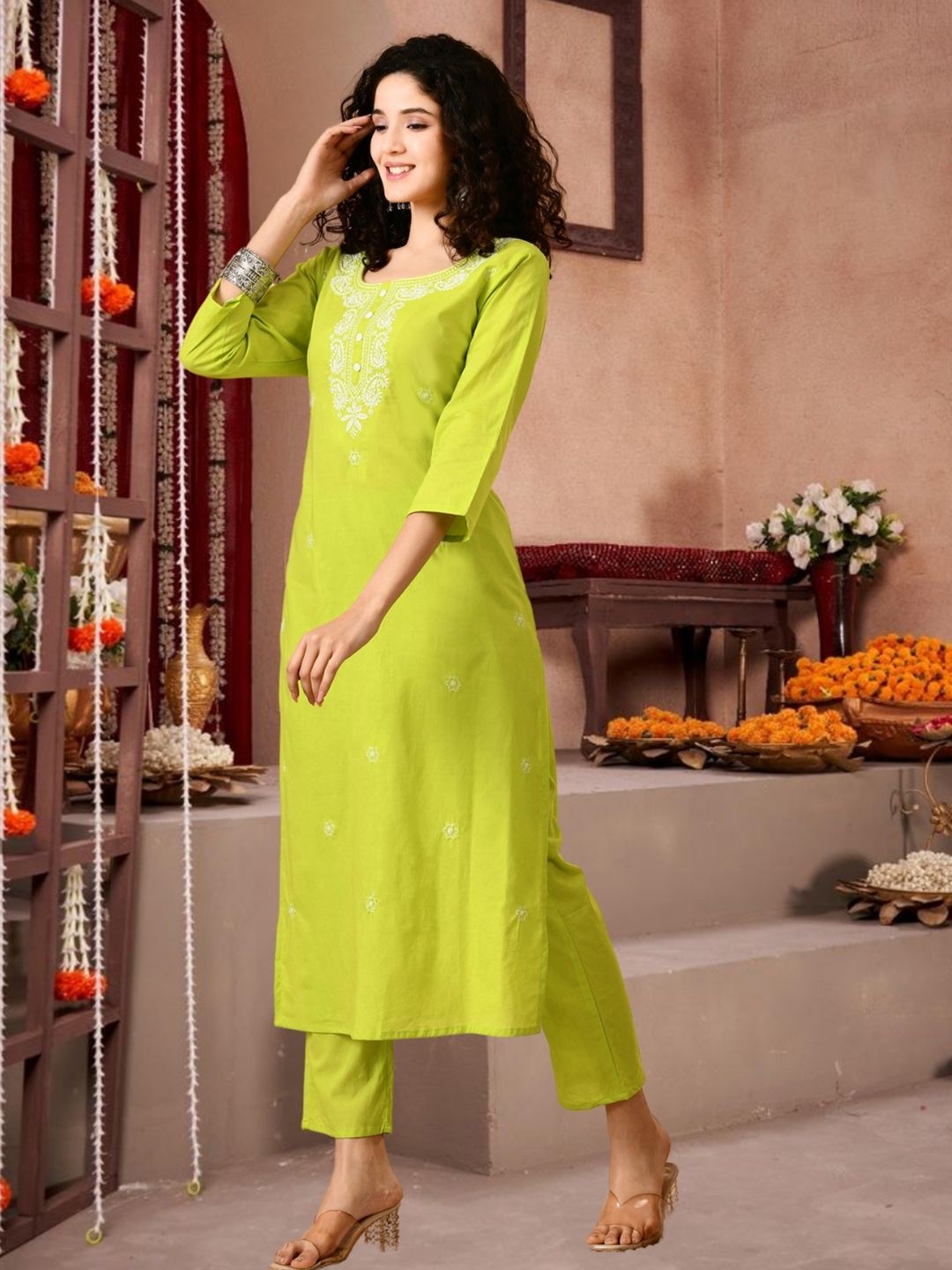 OZIA Floral Embroidered Thread Work Straight Pure Cotton Kurta With Trousers