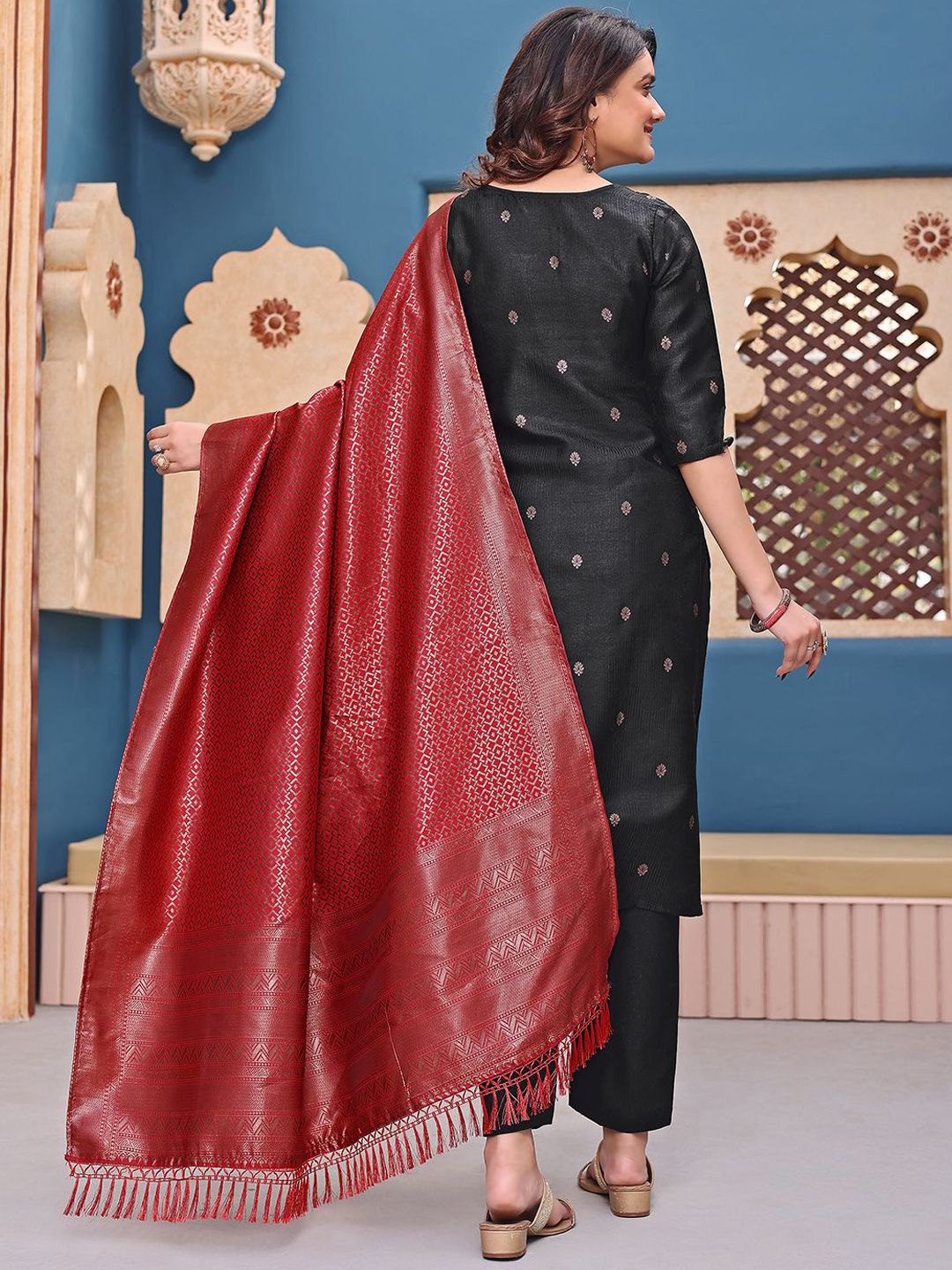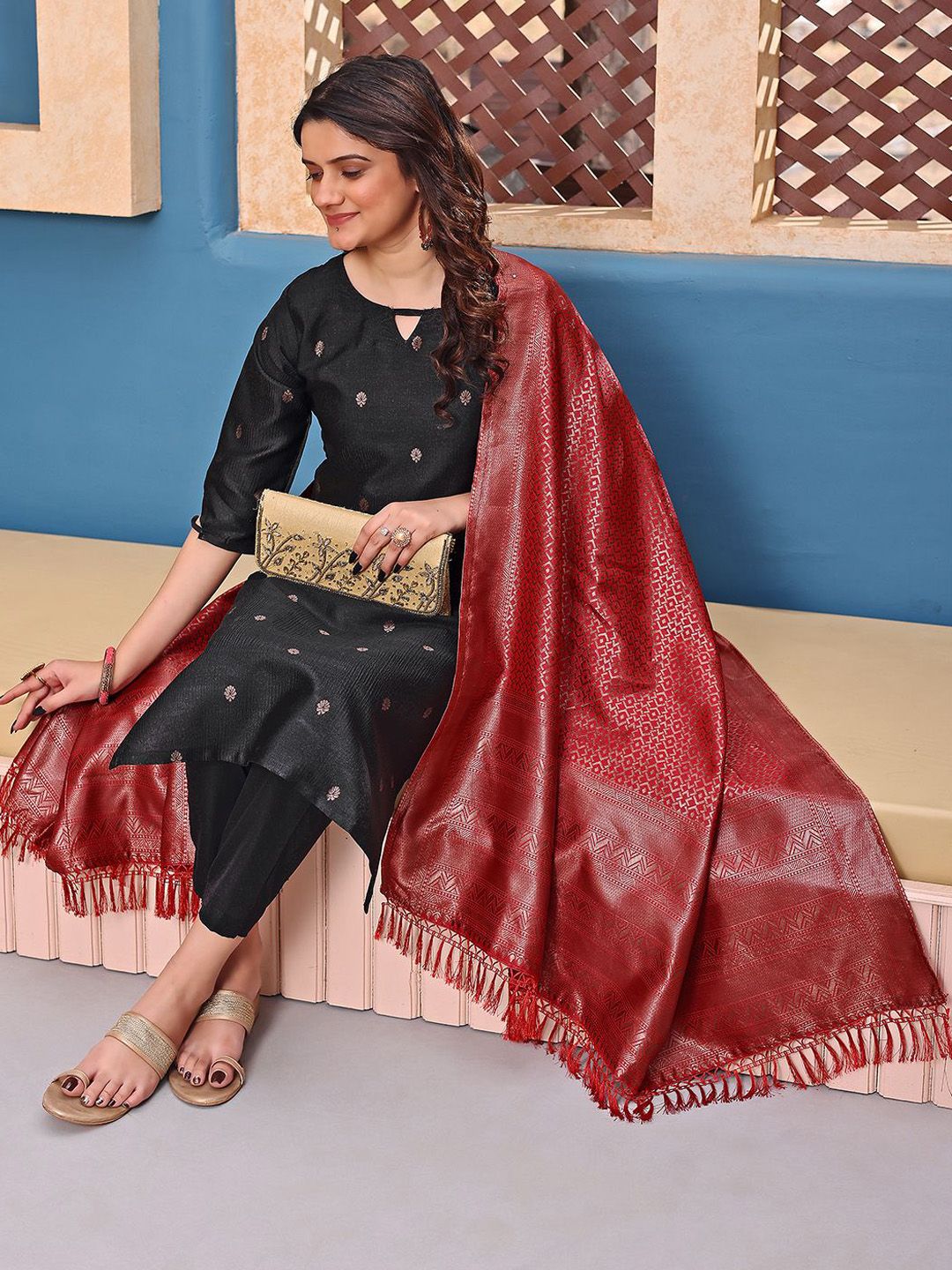 Peach Petals Woven Design Zari Printed V-Neck Chanderi Silk Kurta With Salwar & Dupatta