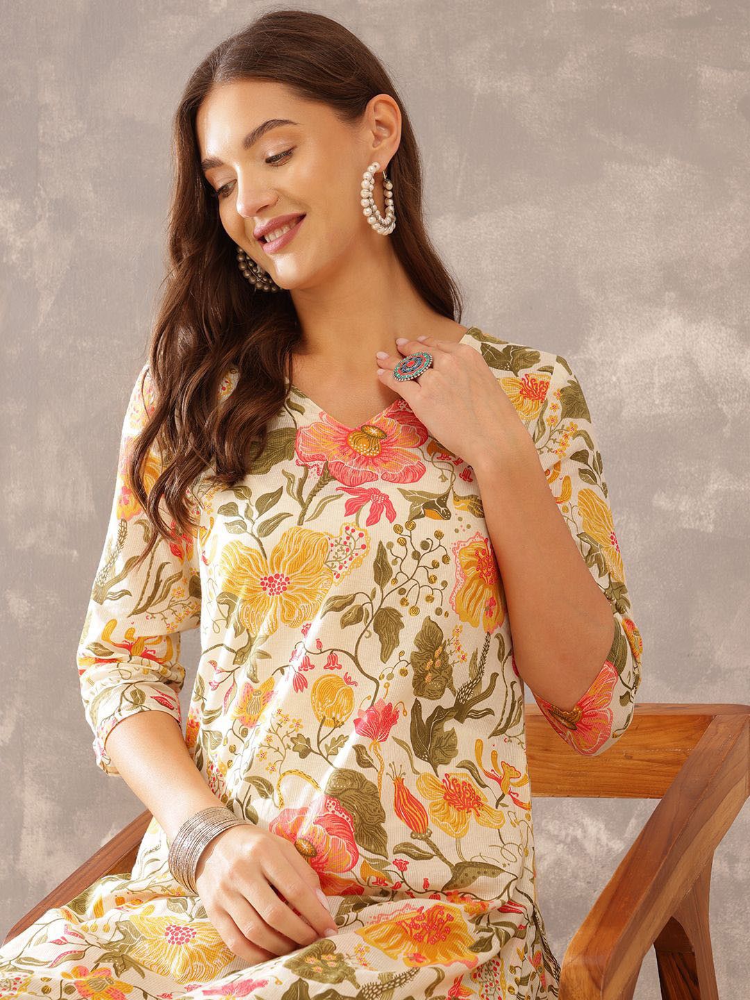 PHYSIL Floral Printed V-Neck Pure Cotton Kurta With Trousers