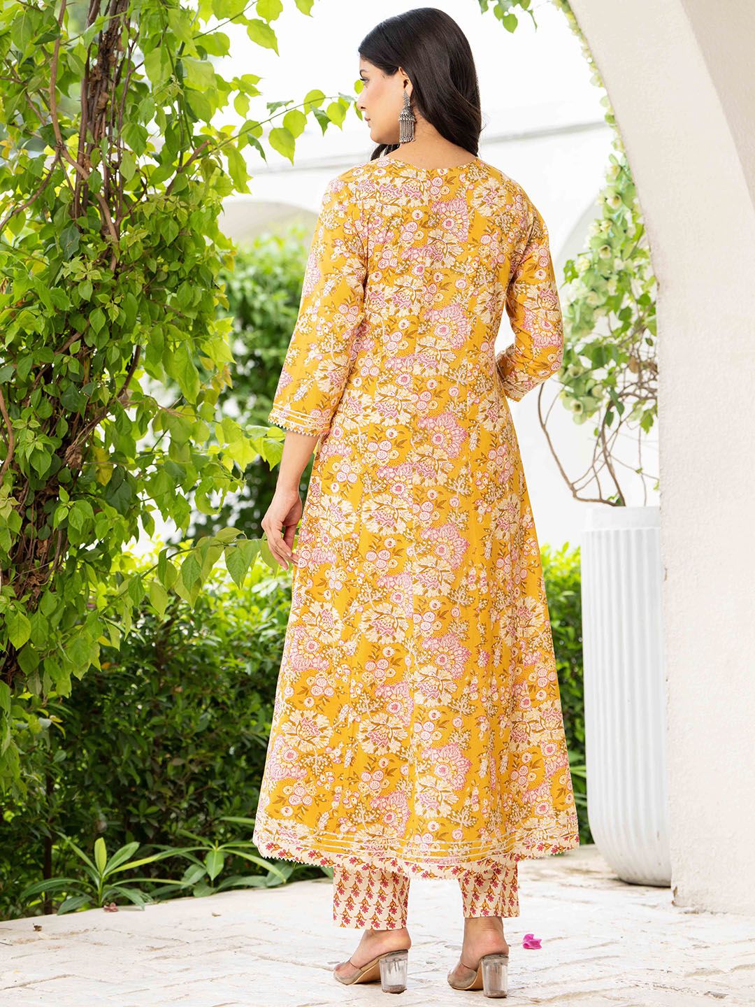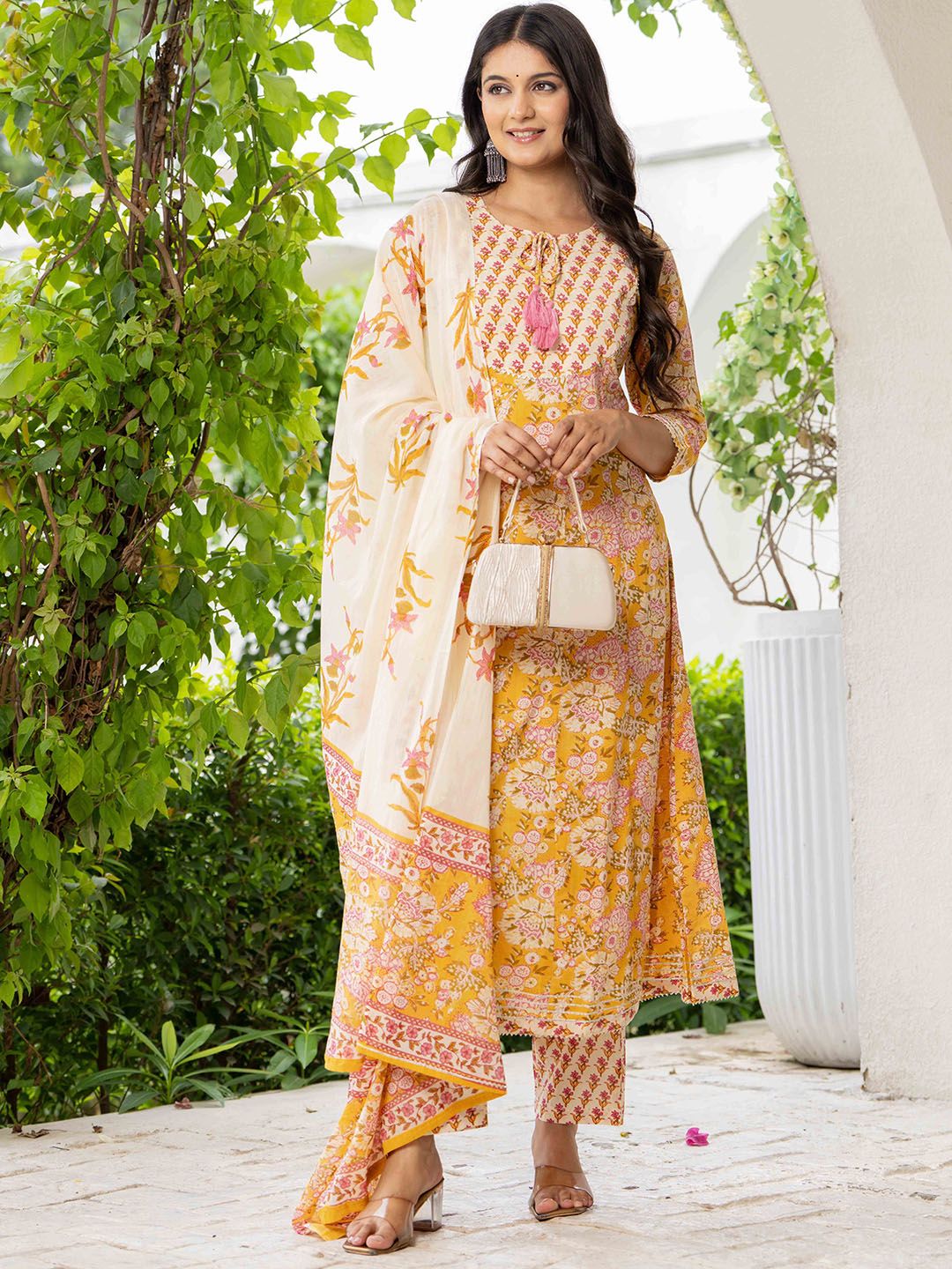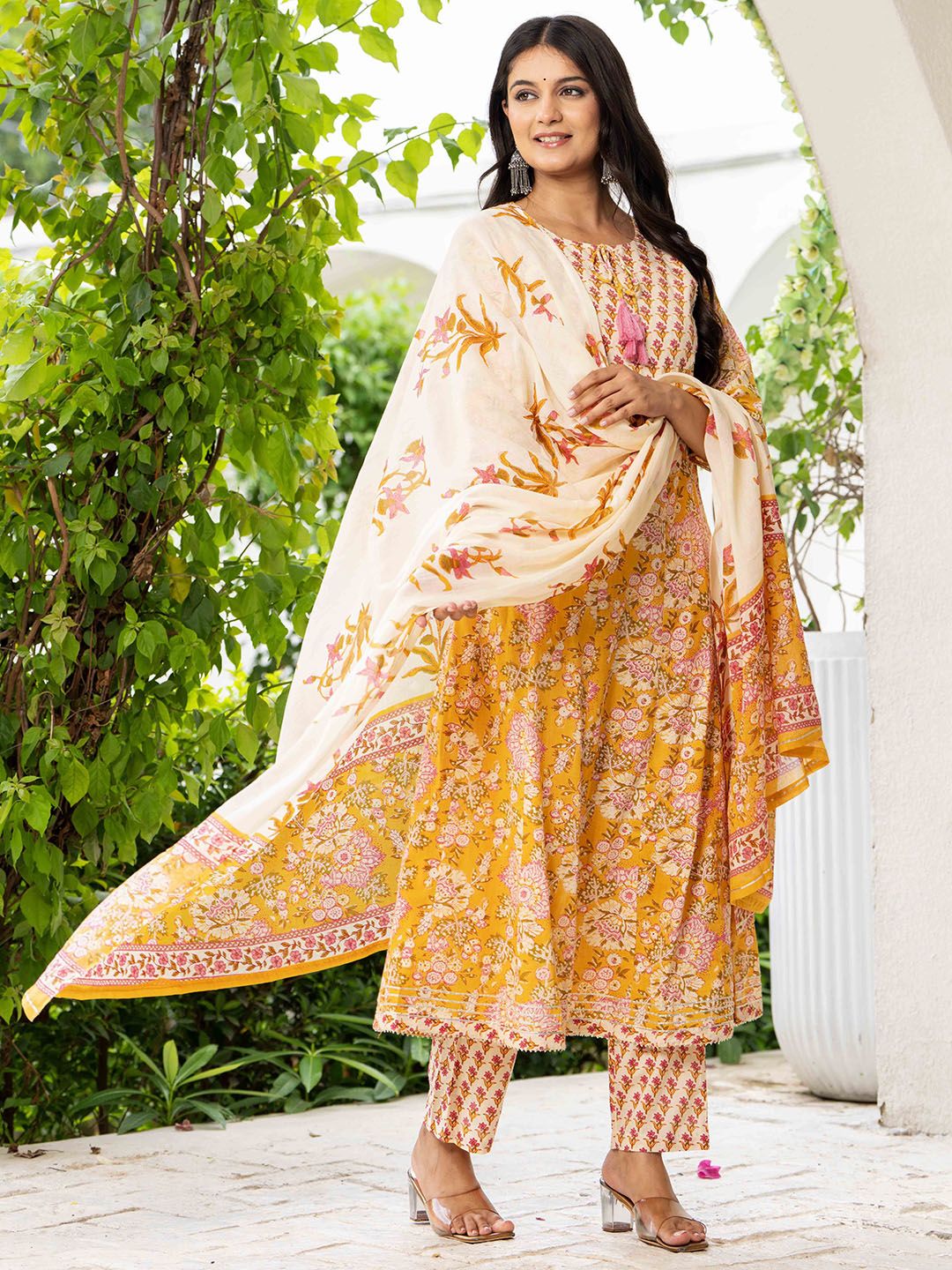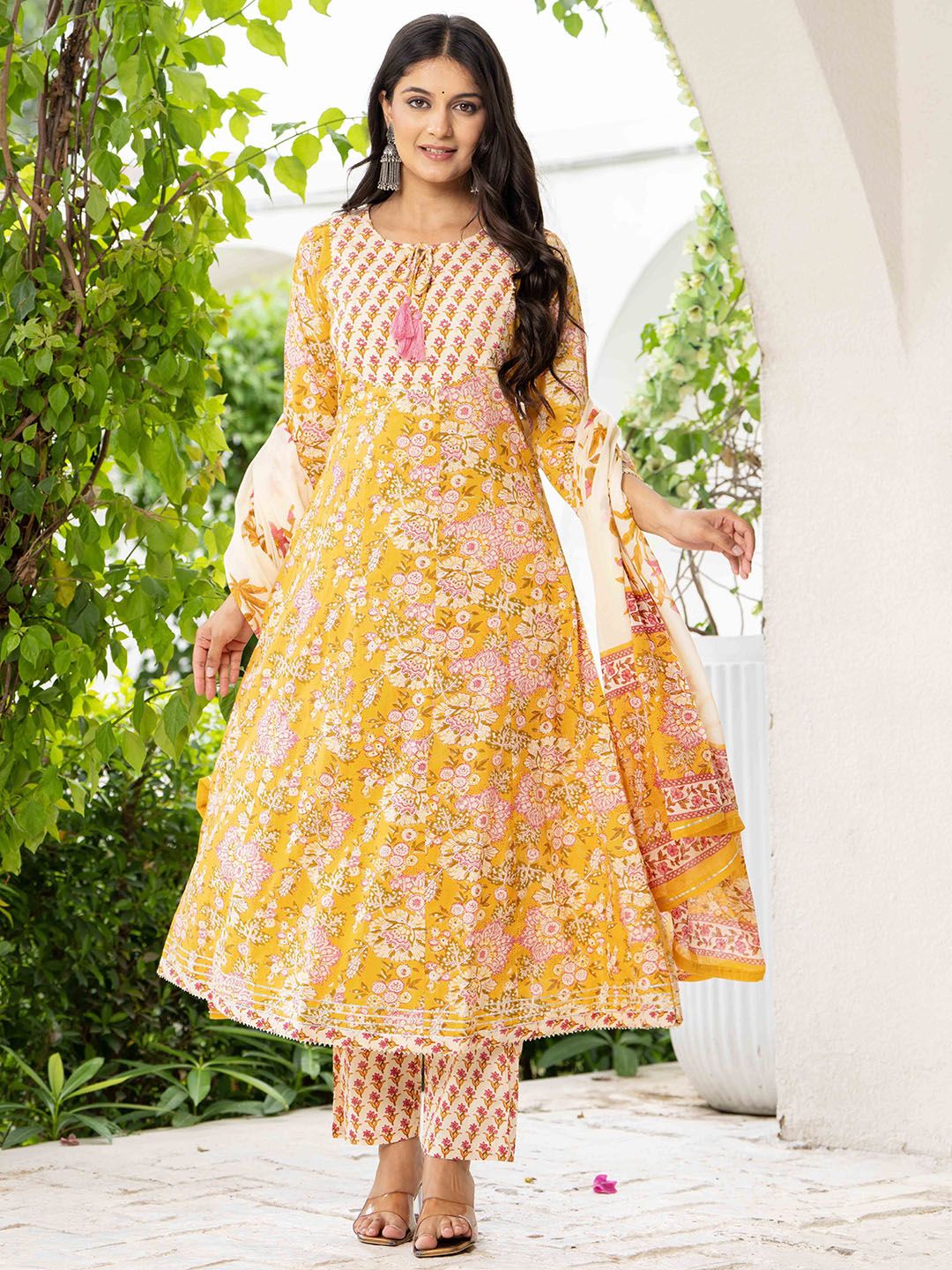 Pistaa Floral Printed Layered Pure Cotton Kurta With Trousers & Dupatta