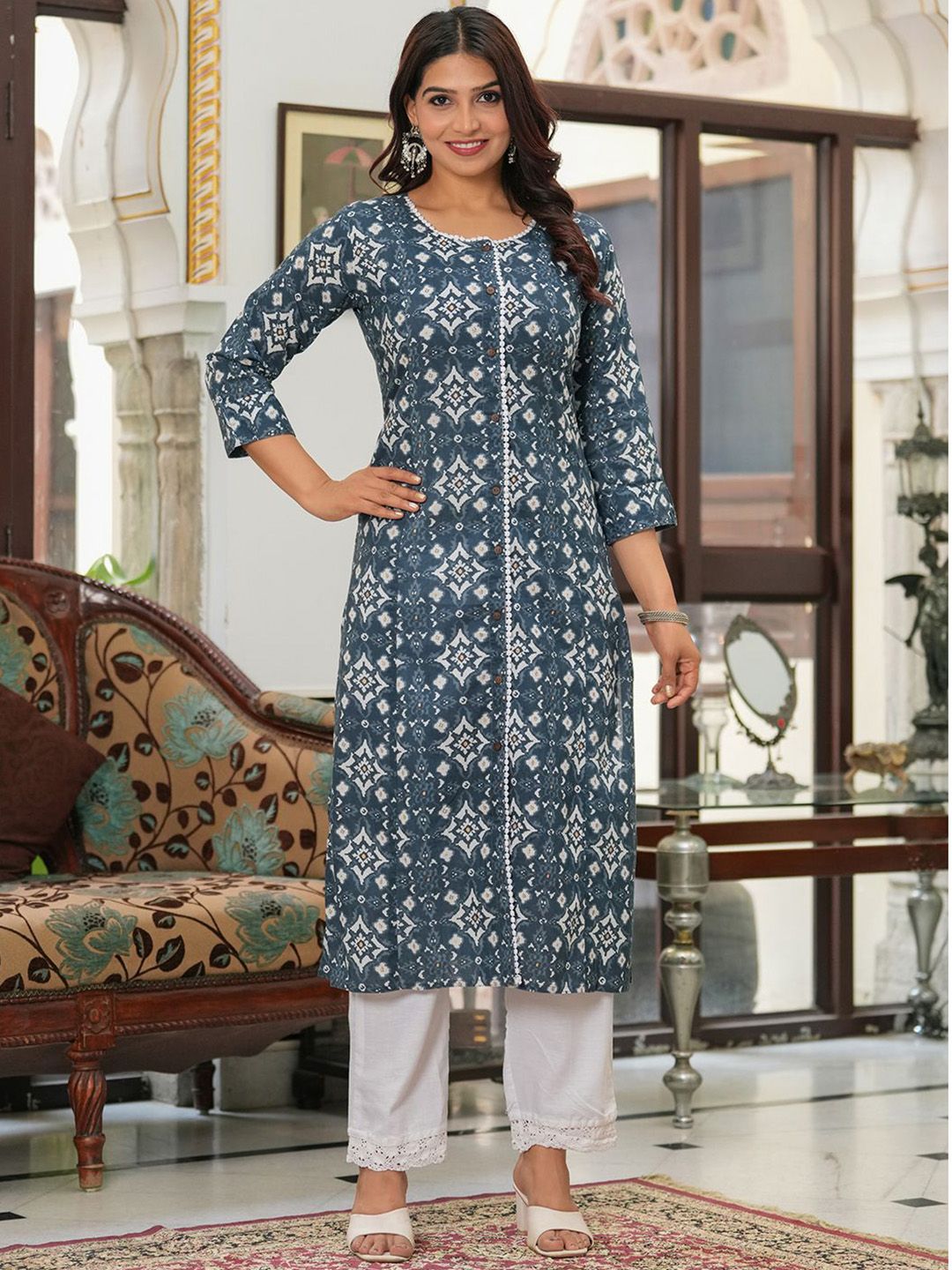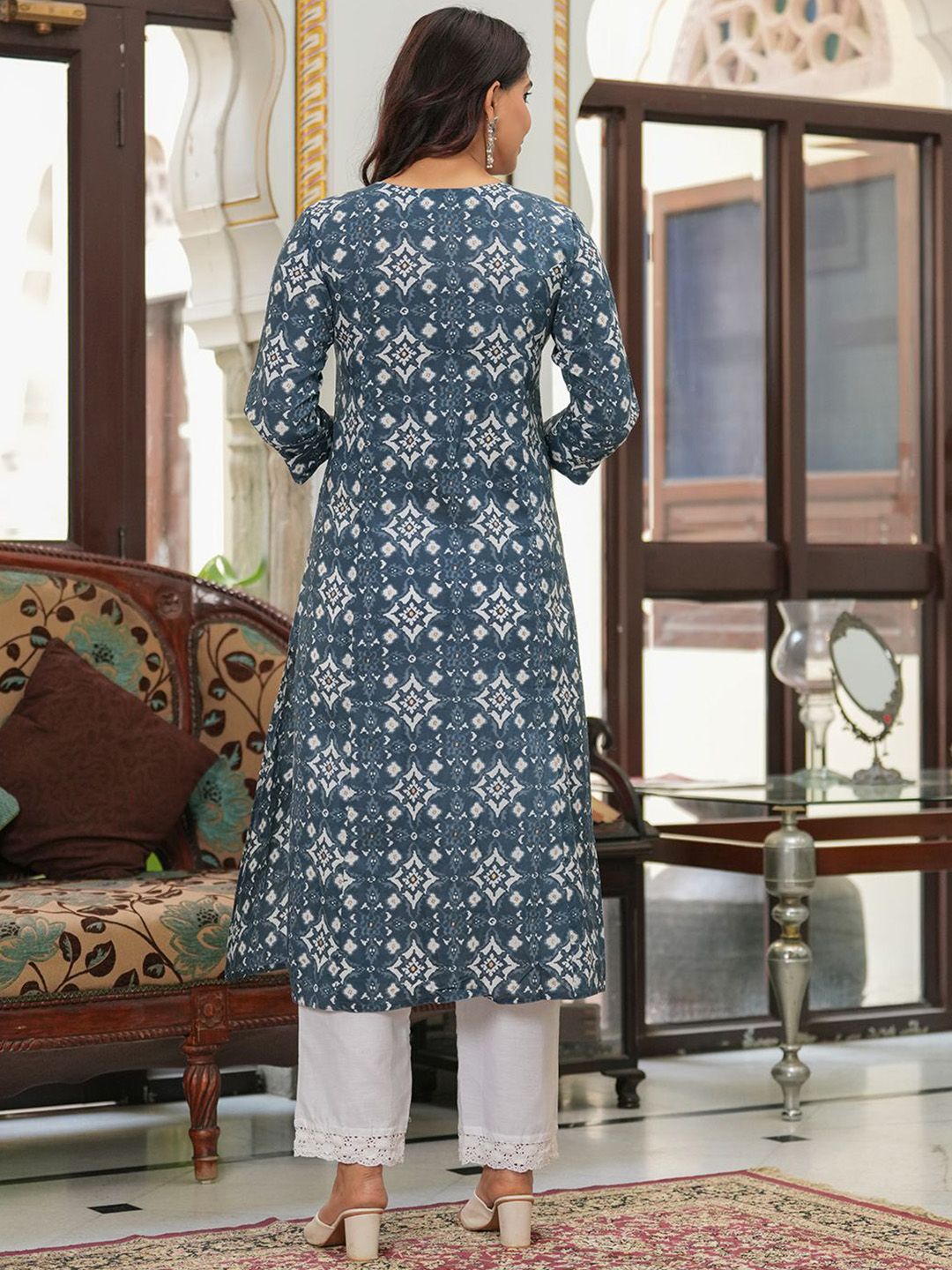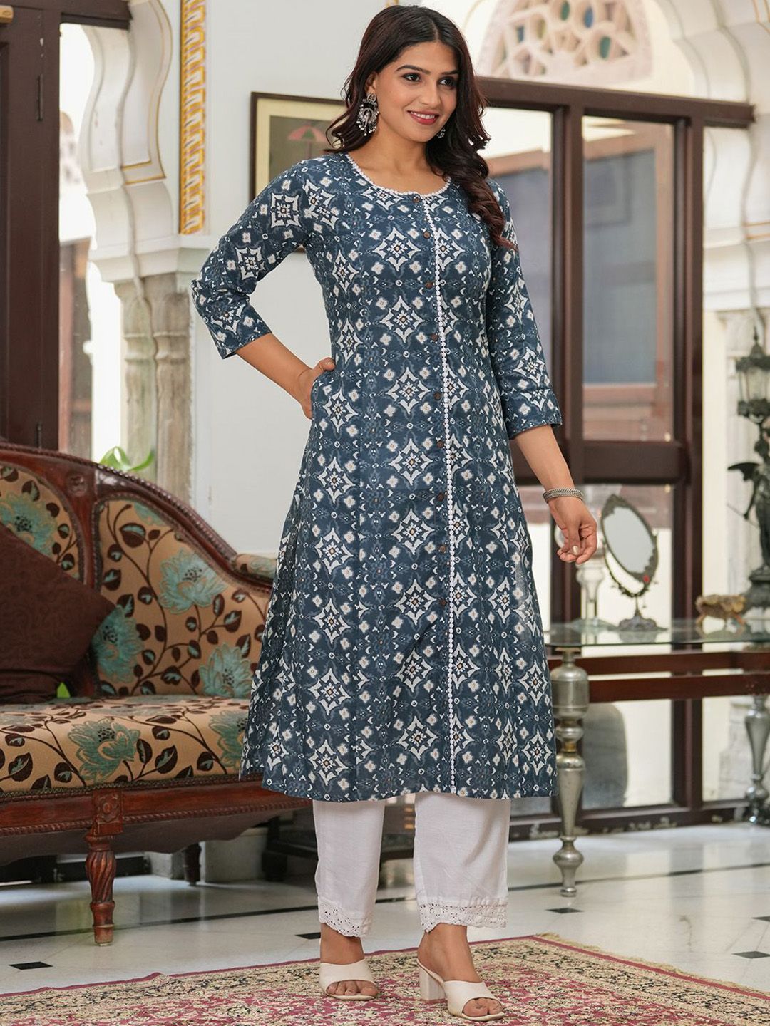 Pistaa Geometric Printed Round Neck Straight Pure Cotton Kurta With Trousers