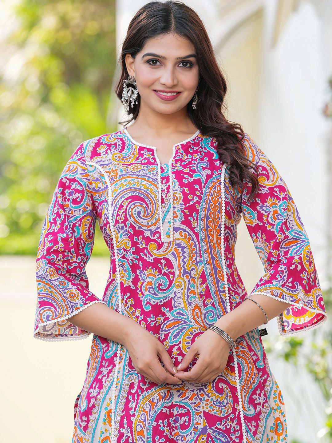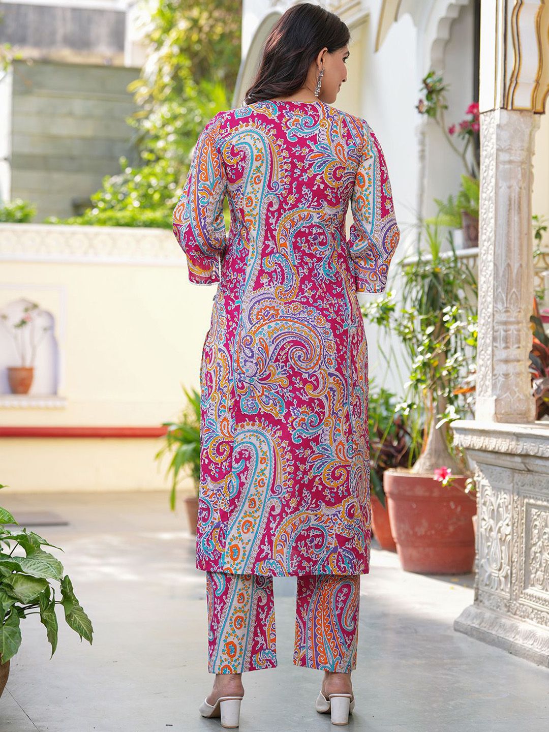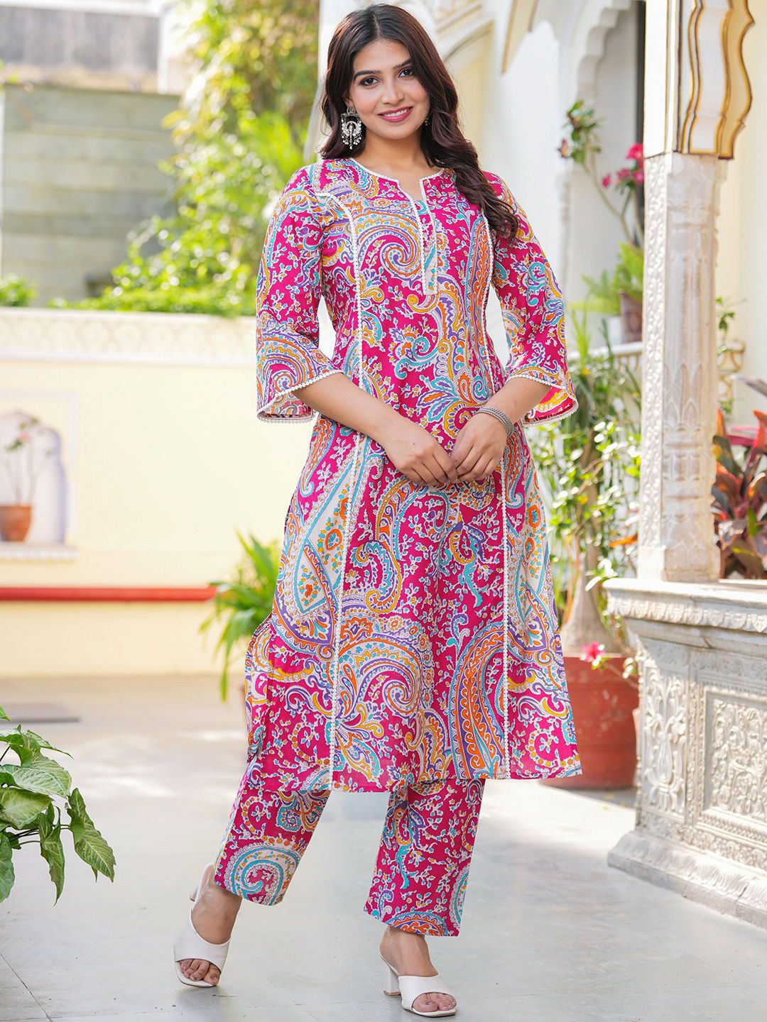 Pistaa Paisley Printed Notch Neck Pure Cotton A-Line Straight Kurta With Trousers
