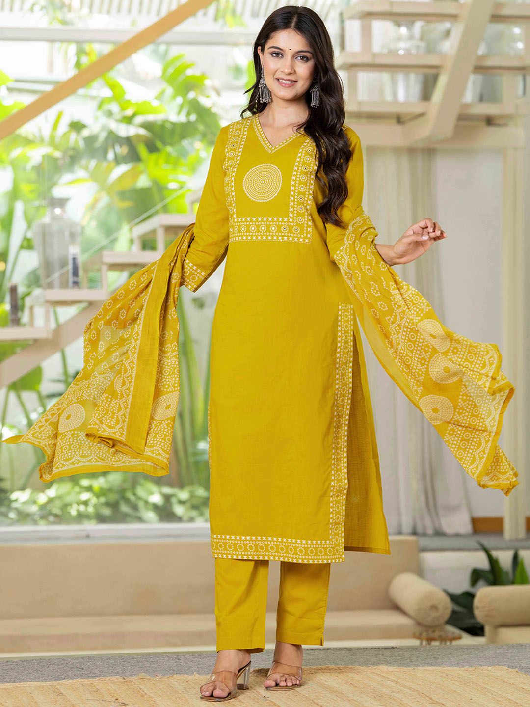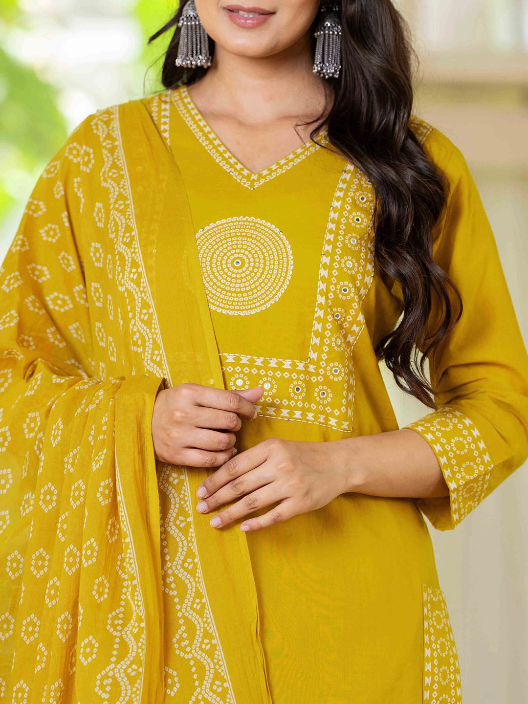 Pistaa Women Bandhani Yoke Design Regular Pure Cotton Kurta with Trousers & Dupatta