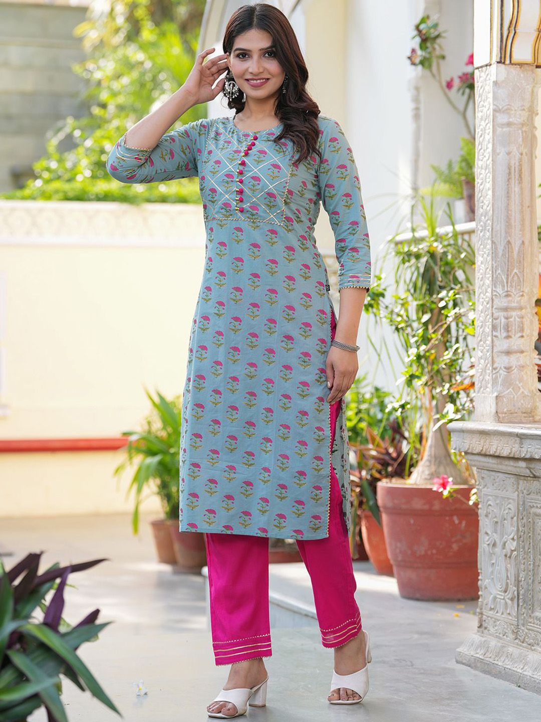 Pistaa Women Floral Printed Regular Pure Cotton Kurta with Trousers Kurta Sets