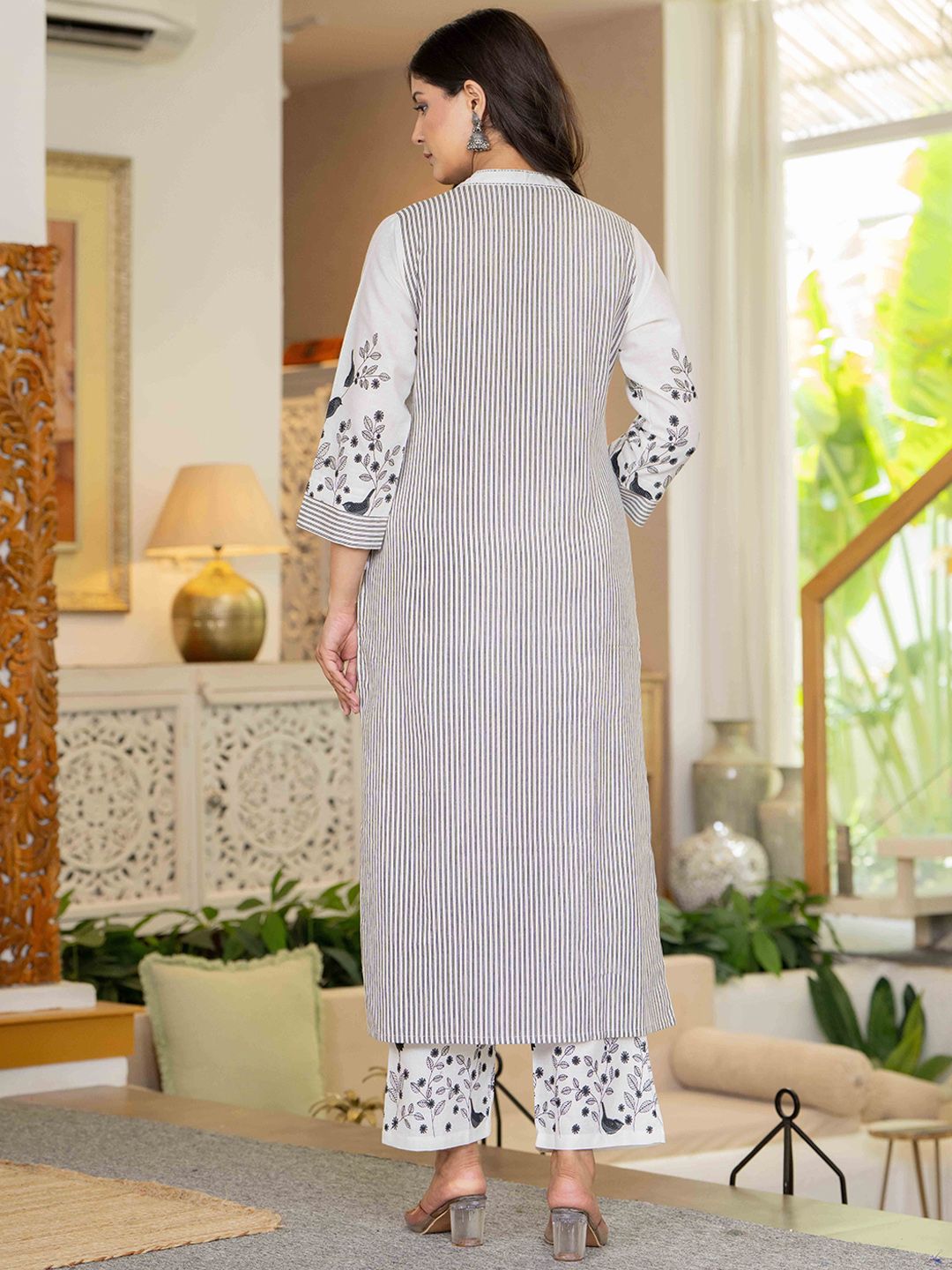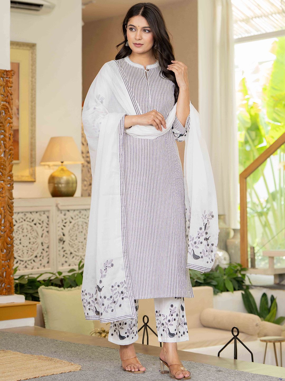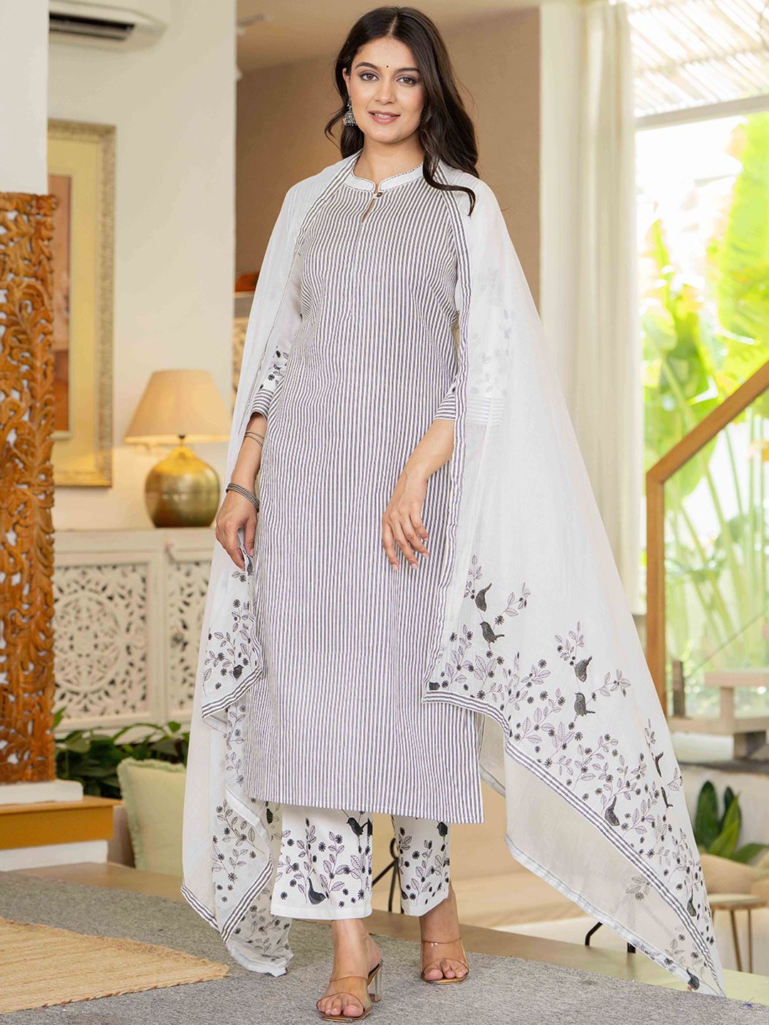 Pistaa Women Striped Cotton Kurta with Trousers & Dupatta