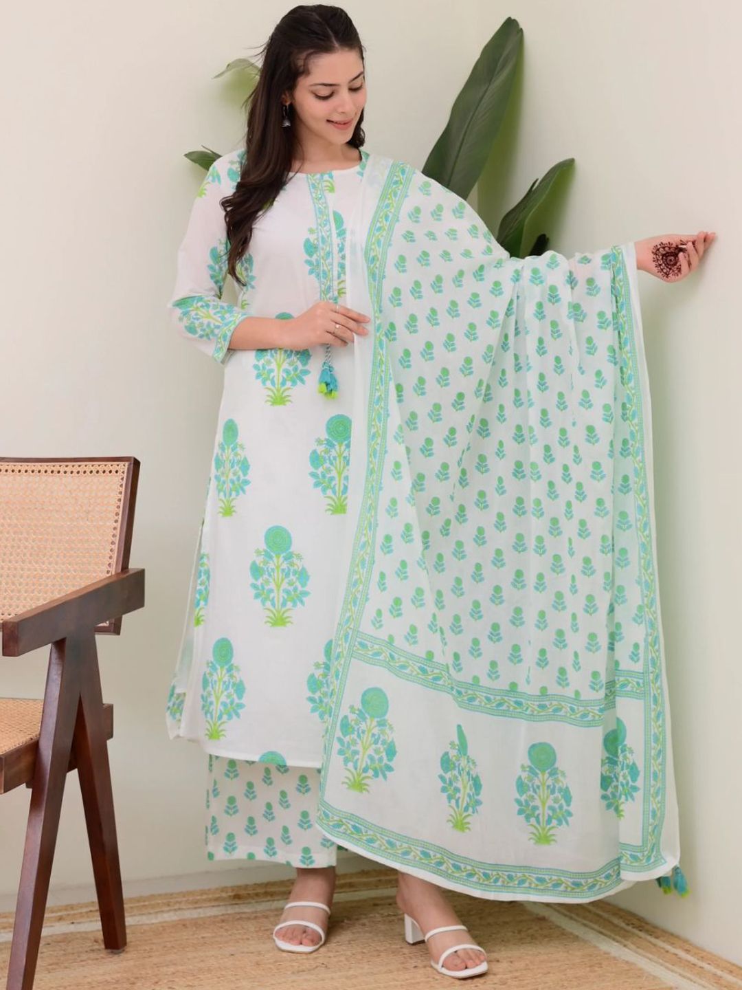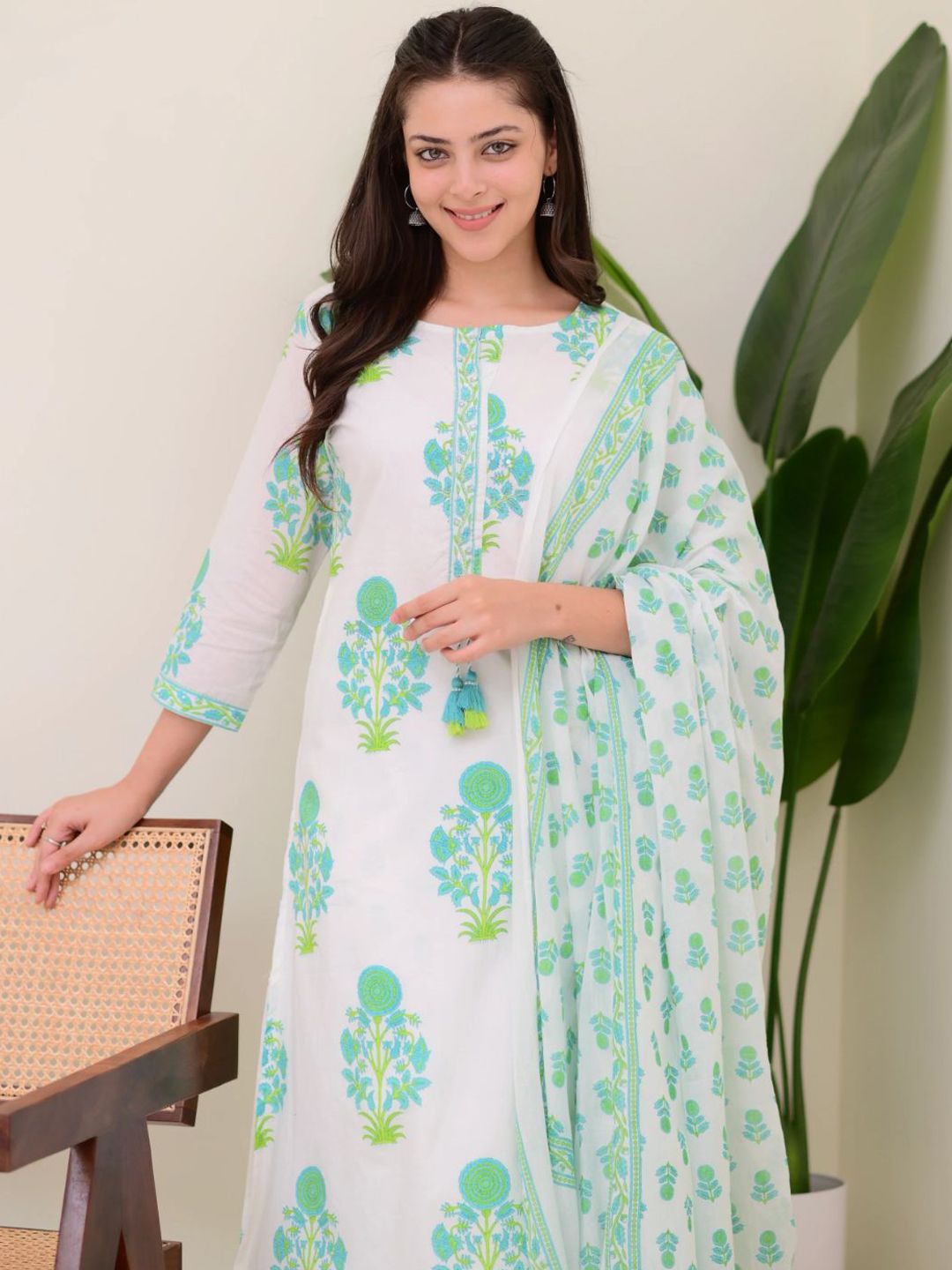PMD Fashion Floral Printed Boat Neck Straight Kurta With Trousers And Dupatta