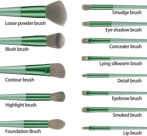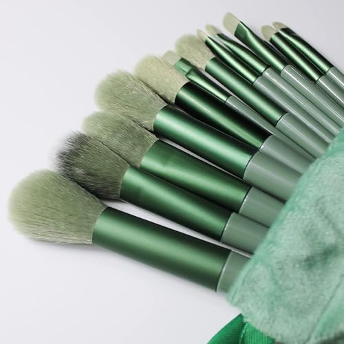 Makeup Brushes: This set includes 13 makeup brushes and a storage bag, the makeup set will meet all your makeup needs, which is designed to help finish your makeup job, such as foundation powder, concealer, eyeshadow, blending blush, eyeliner, highlighter, etc. Soft and Comfortable Bristles: The bristles of our makeup brush set are made of quality fiber hair. The bristles are rich, smooth, and fluffy, and will not fall off easily. They can better grasp the powder and spread it evenly on the face, making your makeup more natural and gentle, and non-irritating to the skin. Rugged Handle: The makeup brush set is made of sturdy and durable materials, which will not break easily when used in daily life. The handle is designed to fit the palm of the hand and is ergonomically designed, and it will not fall easily when using it. Unique Color: The fresh color of green will surprise you in reality, and the correspondent color cloth bag. Perfect Gift - The makeup brush set is intended for makeup beginners and enthusiasts as it's easy to use and superior in quality, with a complete assortment to allow you to keep it beautiful. That would be an excellent gift for your mom, wife, or female friends.