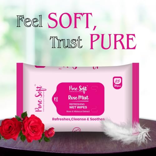 Pure Soft Rose Mist Refreshing Wet Wipes 25N Each - Pack of 5 | Wet Wipes for Face with Rosehip Extract, Hibiscus Extract & Calendula Extract | Makeup Remover Wipes | Hydrating, Refreshing, Soothing |